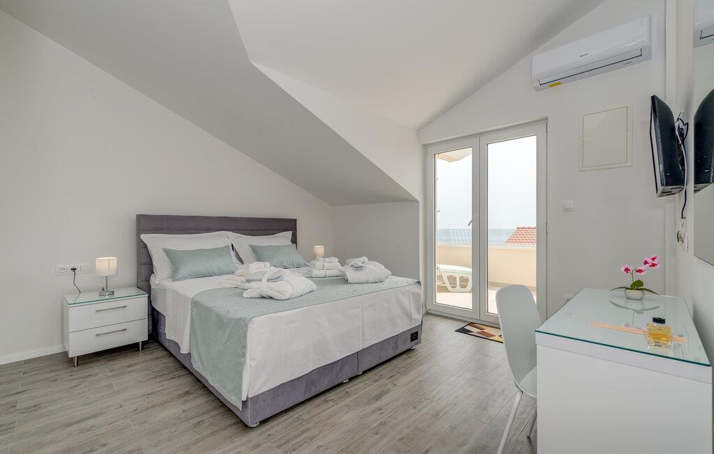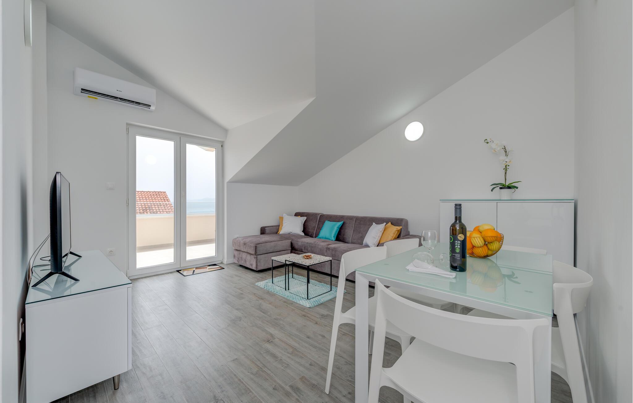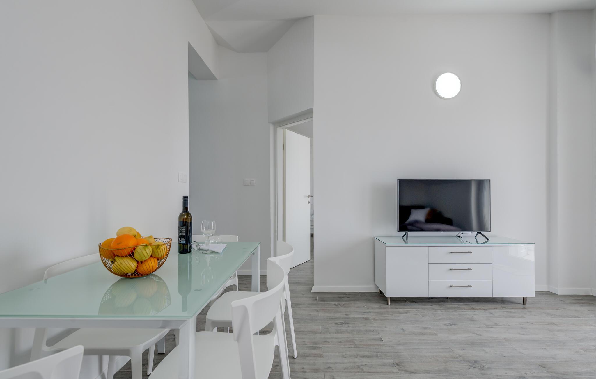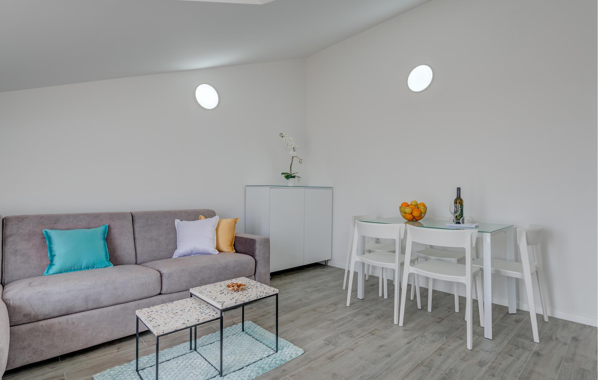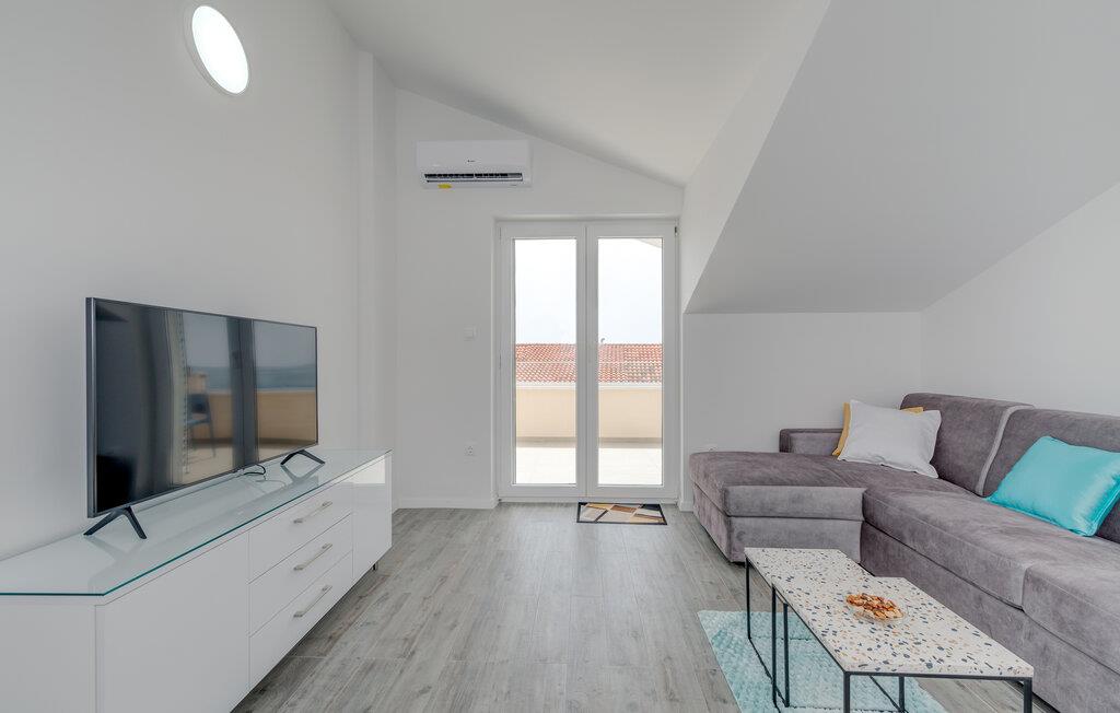 Denne velholdte ferielejlighed på den solrige ø Ciovo har en lys og stilfuld atmosfære. Tilbered lækre måltider i det åbne køkken og tag plads ved det indbydende spisebord. Føl jer godt tilpas i den hyggelige sofa, stream en spændende film eller dediker jer til en god bog.