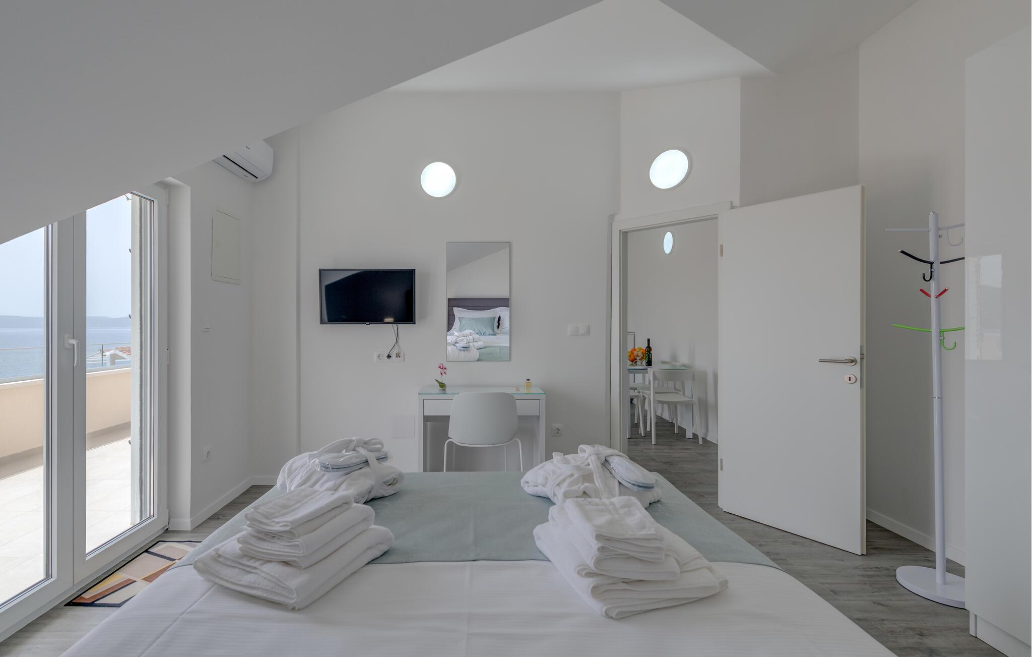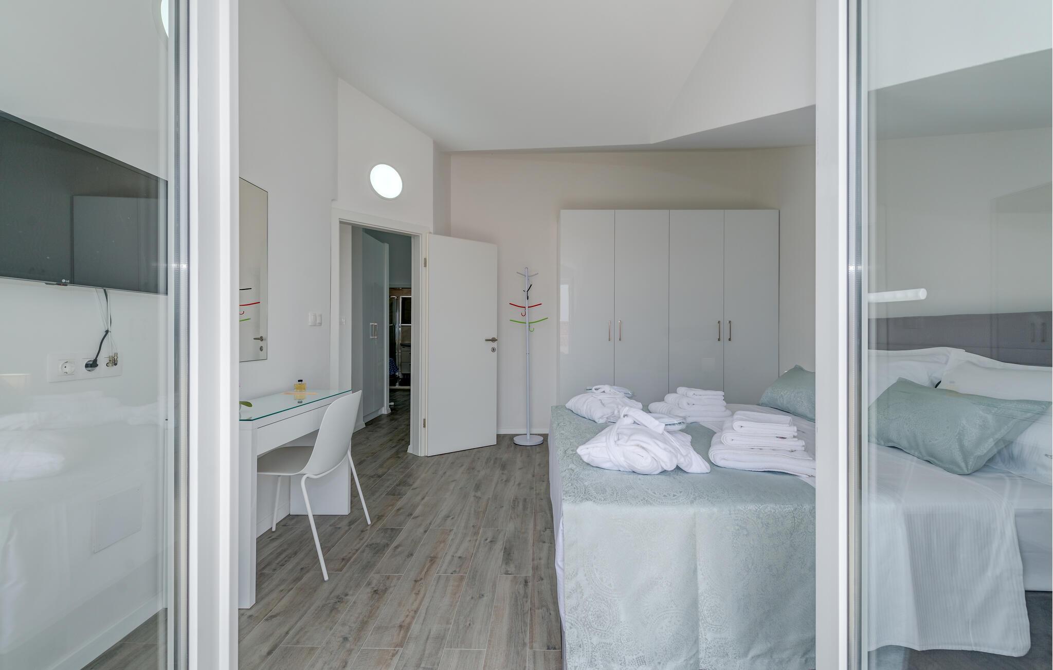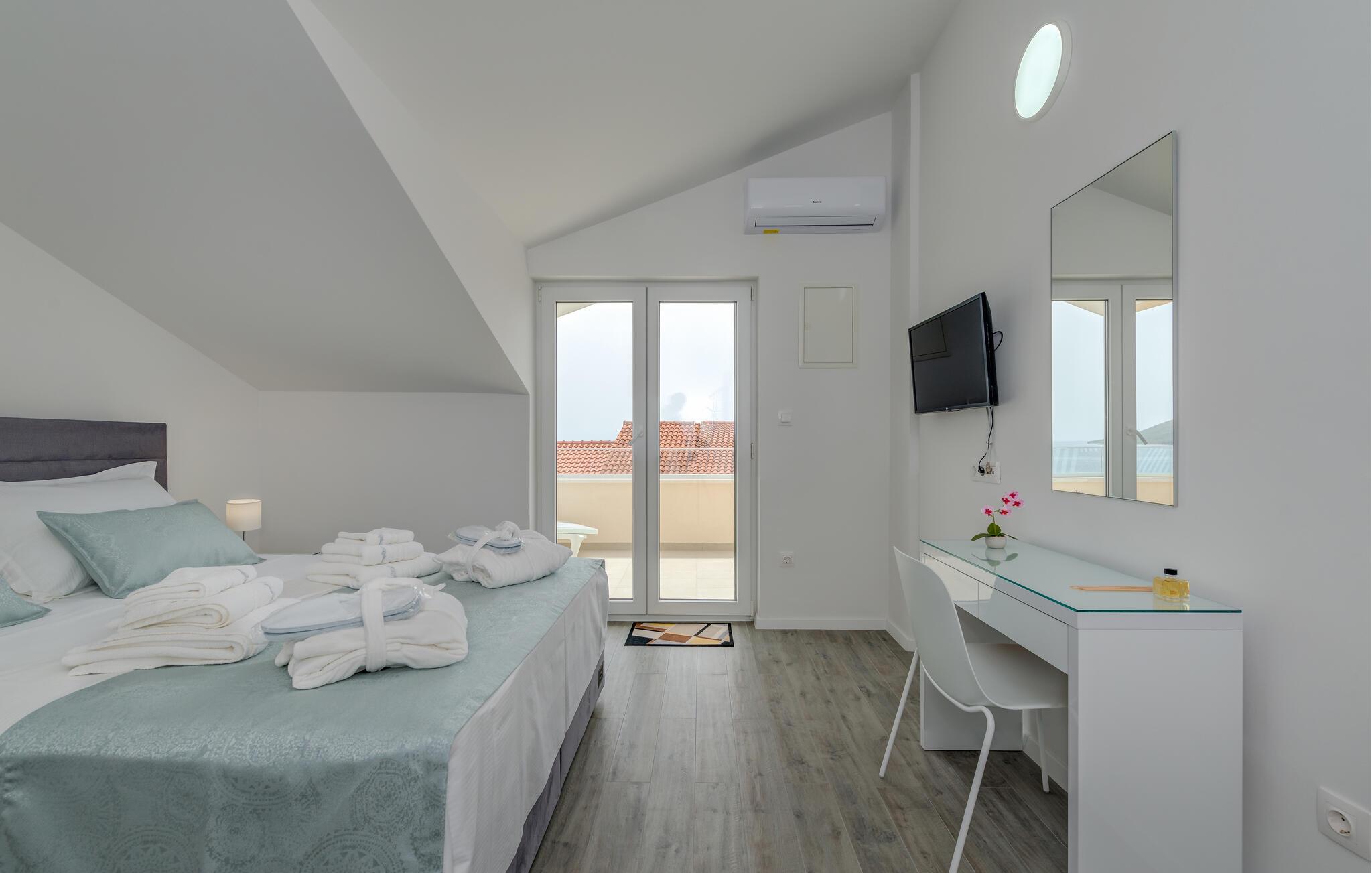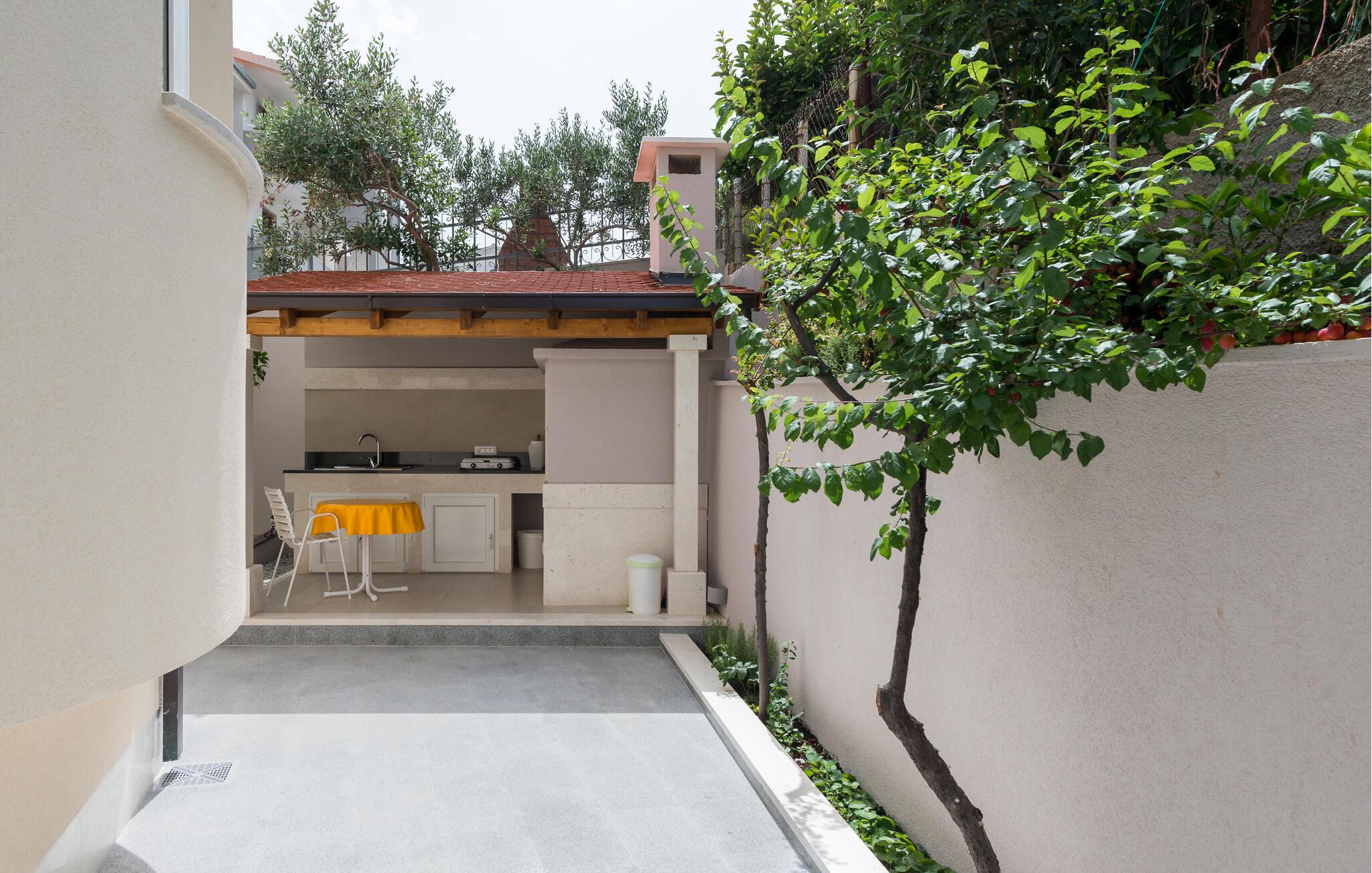 Denne velholdte ferielejlighed på den solrige ø Ciovo har en lys og stilfuld atmosfære. Tilbered lækre måltider i det åbne køkken og tag plads ved det indbydende spisebord. Føl jer godt tilpas i den hyggelige sofa, stream en spændende film eller dediker jer til en god bog.
