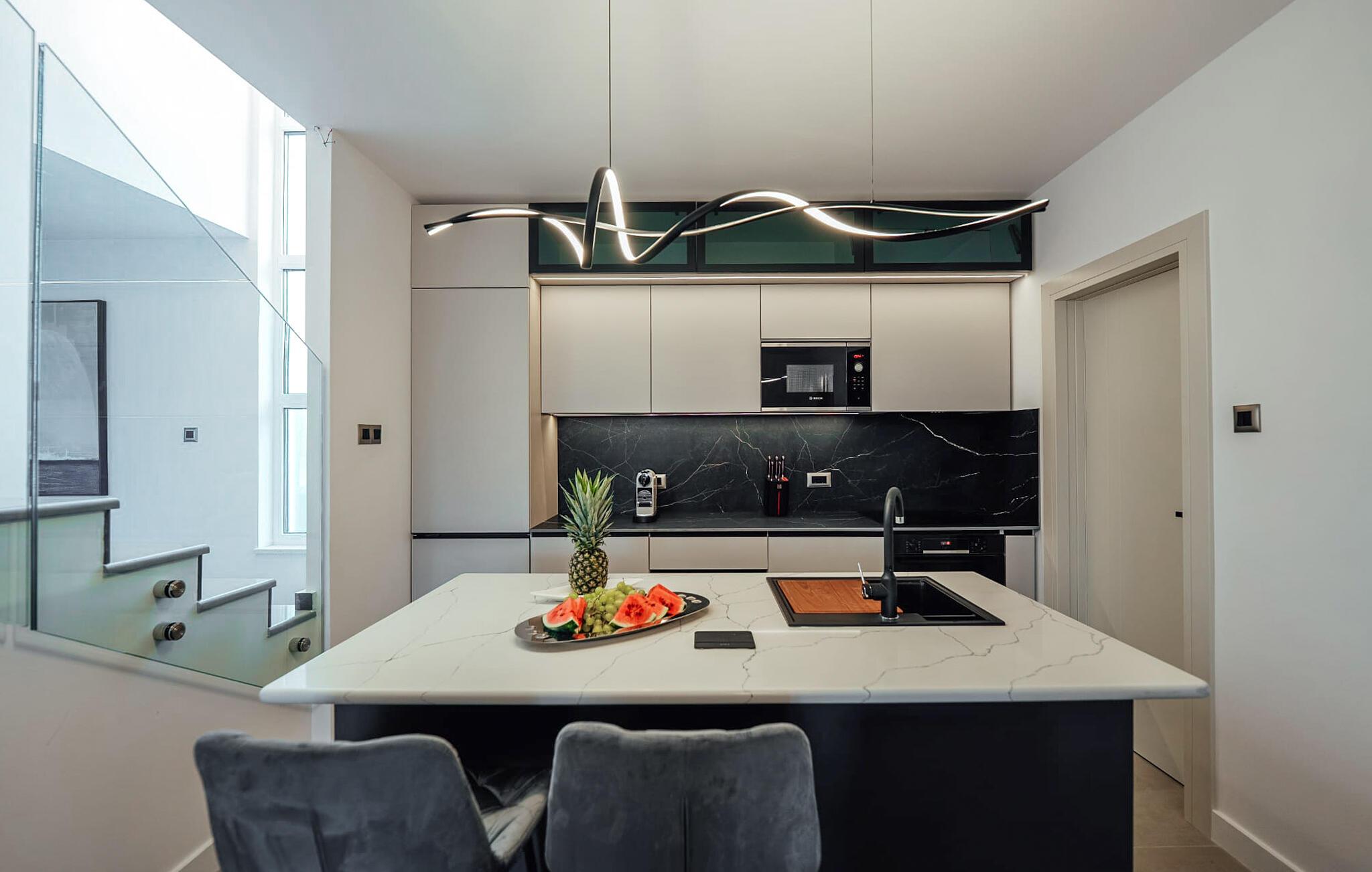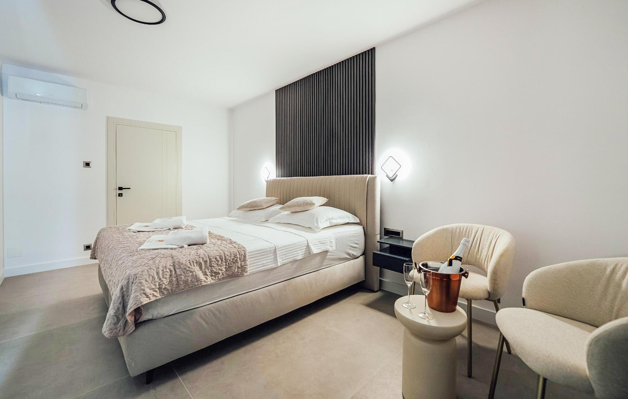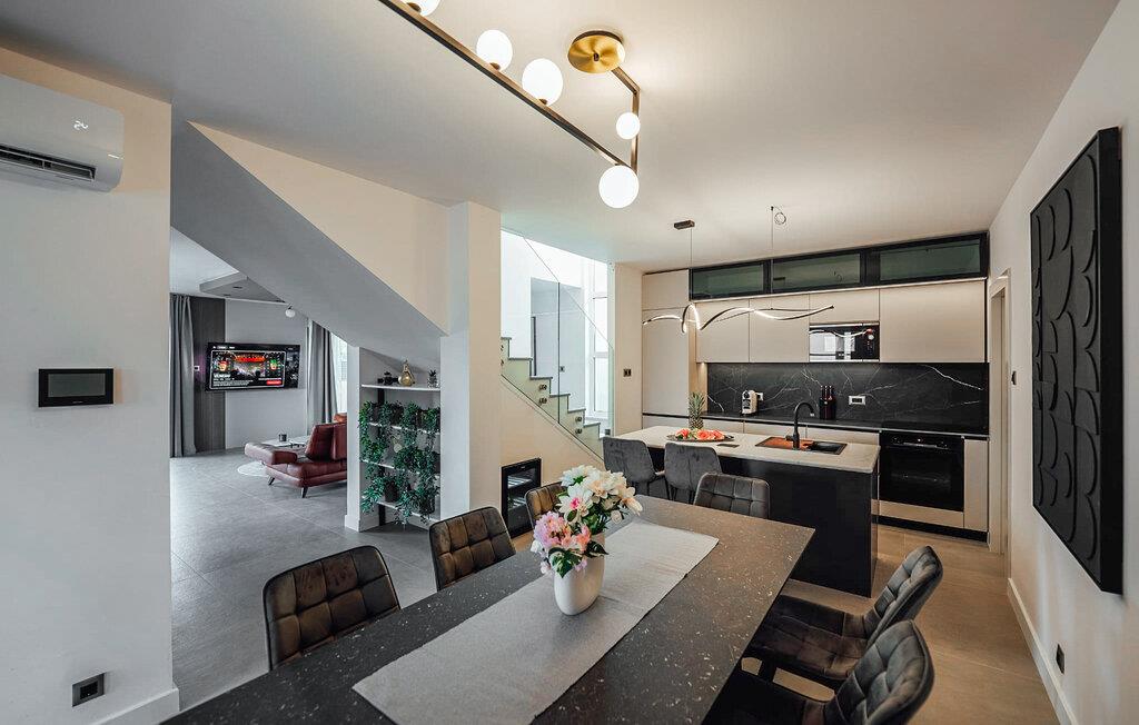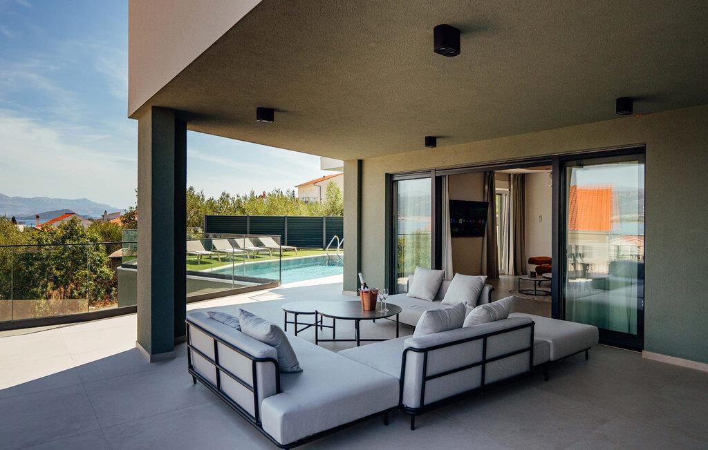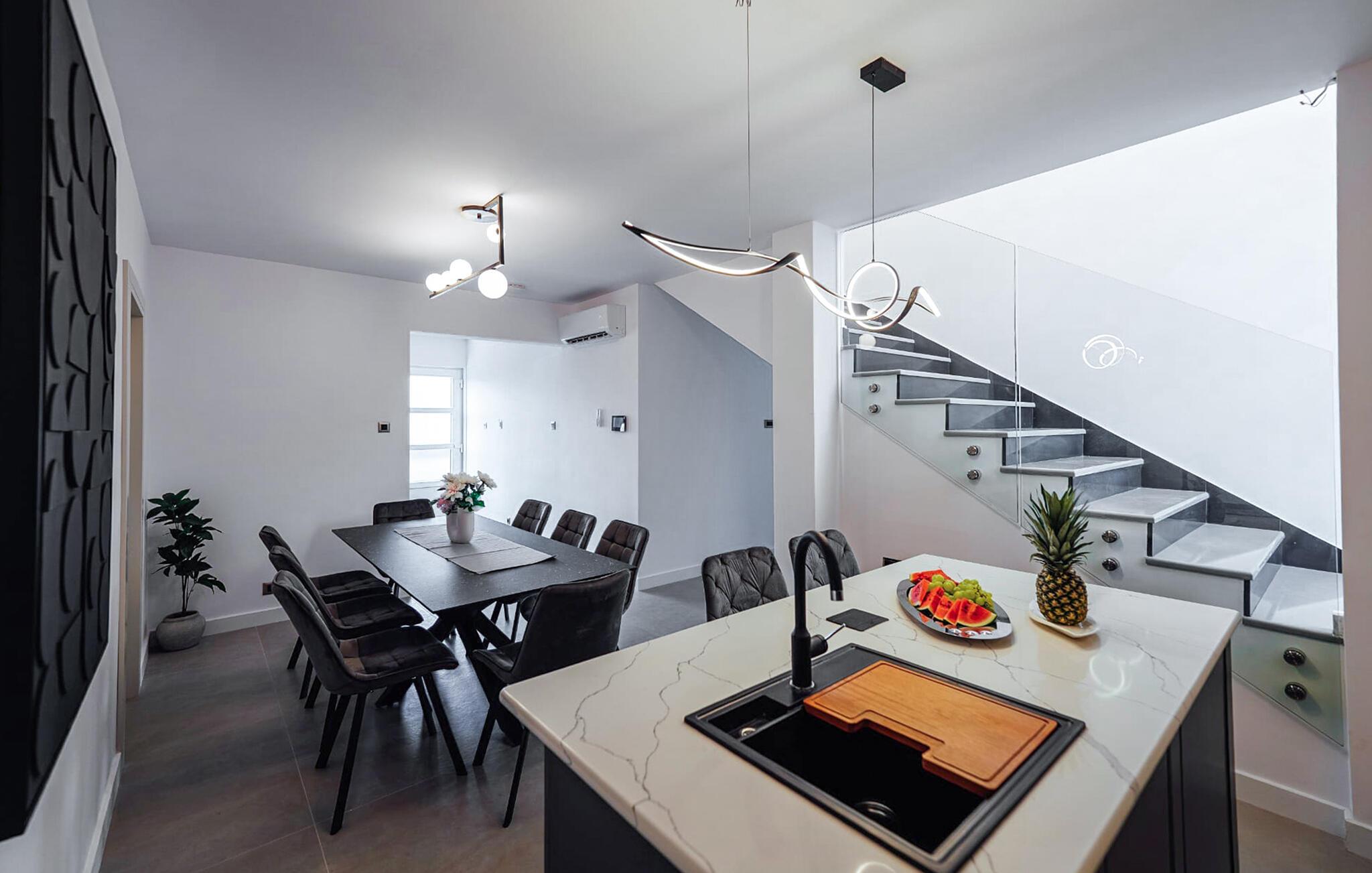 Velkommen til dette fantastisk beliggende og rummelige hus, kun få skridt fra havet, der tilbyder de perfekte rammer for en afslappende ferie med hele familien i en eksklusiv atmosfære. Nyd at tilbringe tid sammen i de lyse og moderne indretningsløsningerede værelser, uanset om I deler måltider eller slapper af i det komfortable siddeområde og lad jer betage af udsigten gennem gulv-til-loft-vinduerne.