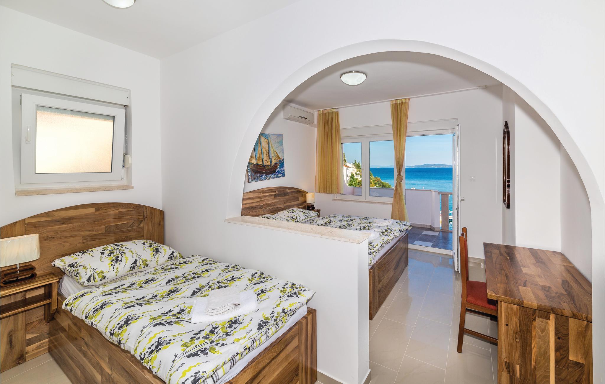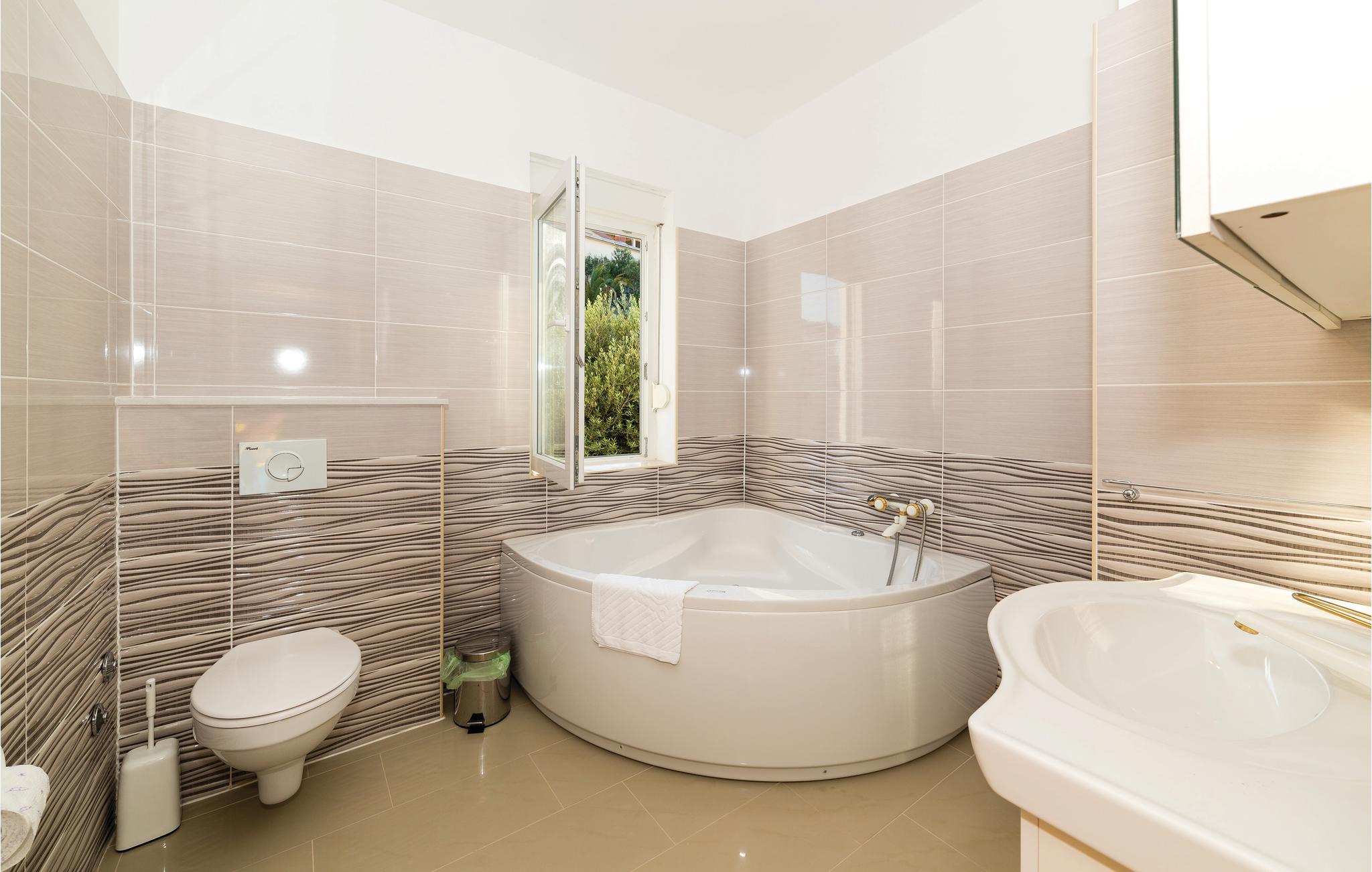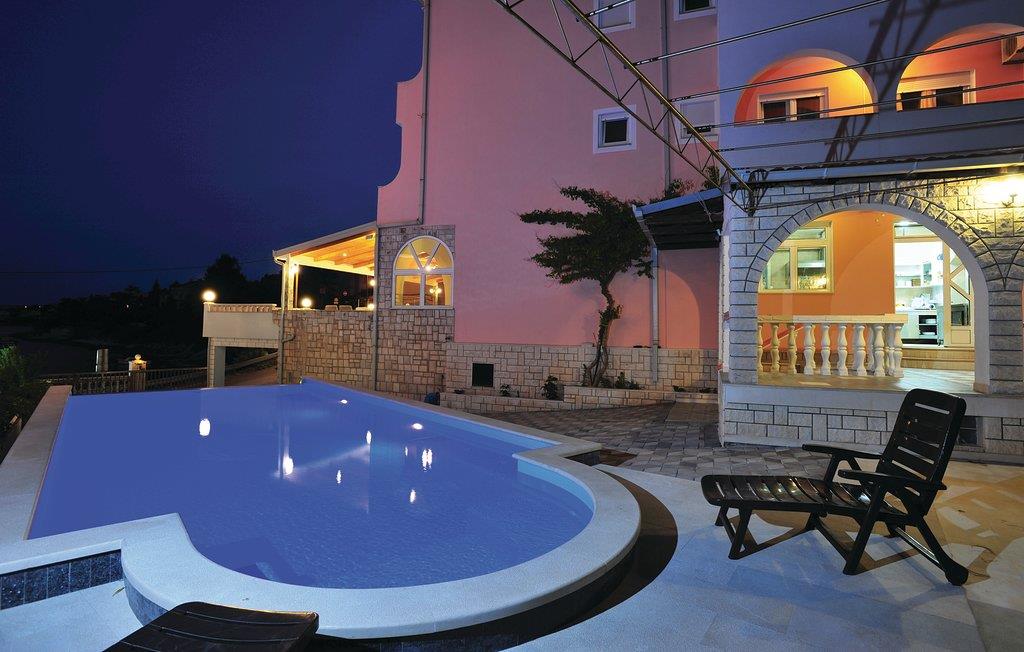 På øen Ciovo og lige ved kiesstranden ligger dette komfortable og rummelige feriehus med swimmingpool. Fra huset er der en skøn panoramaudsigt ud over havet, som I kan nyde fra terrassen. I stueplan ligger det store professionelle køkken, den komfortable stue og spisestue, samt den store terrasse. På første sal er der i alt otte soveværelser, hver med eget badeværelse. På de hede sommerdage kan I tage en svømmetur i poolen med skøn havudsigt. I byen Okrug Gornji er der utallige badestrande. Takket være broen kommer I nemt til og fra fastlandet, hvor I kan besøge den historiske by Trogir med mange historiske seværdigheder, samt meget at se og opleve.