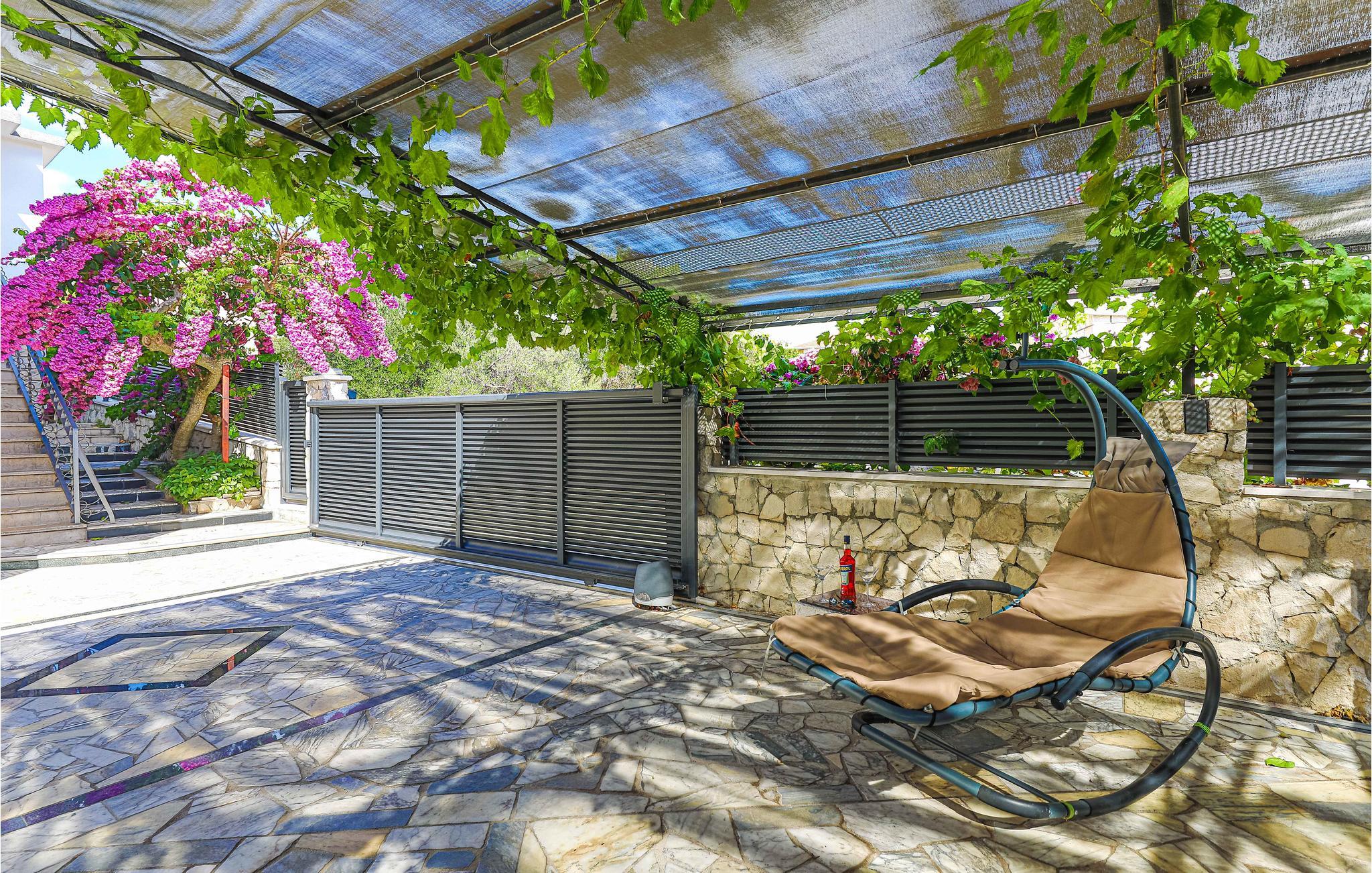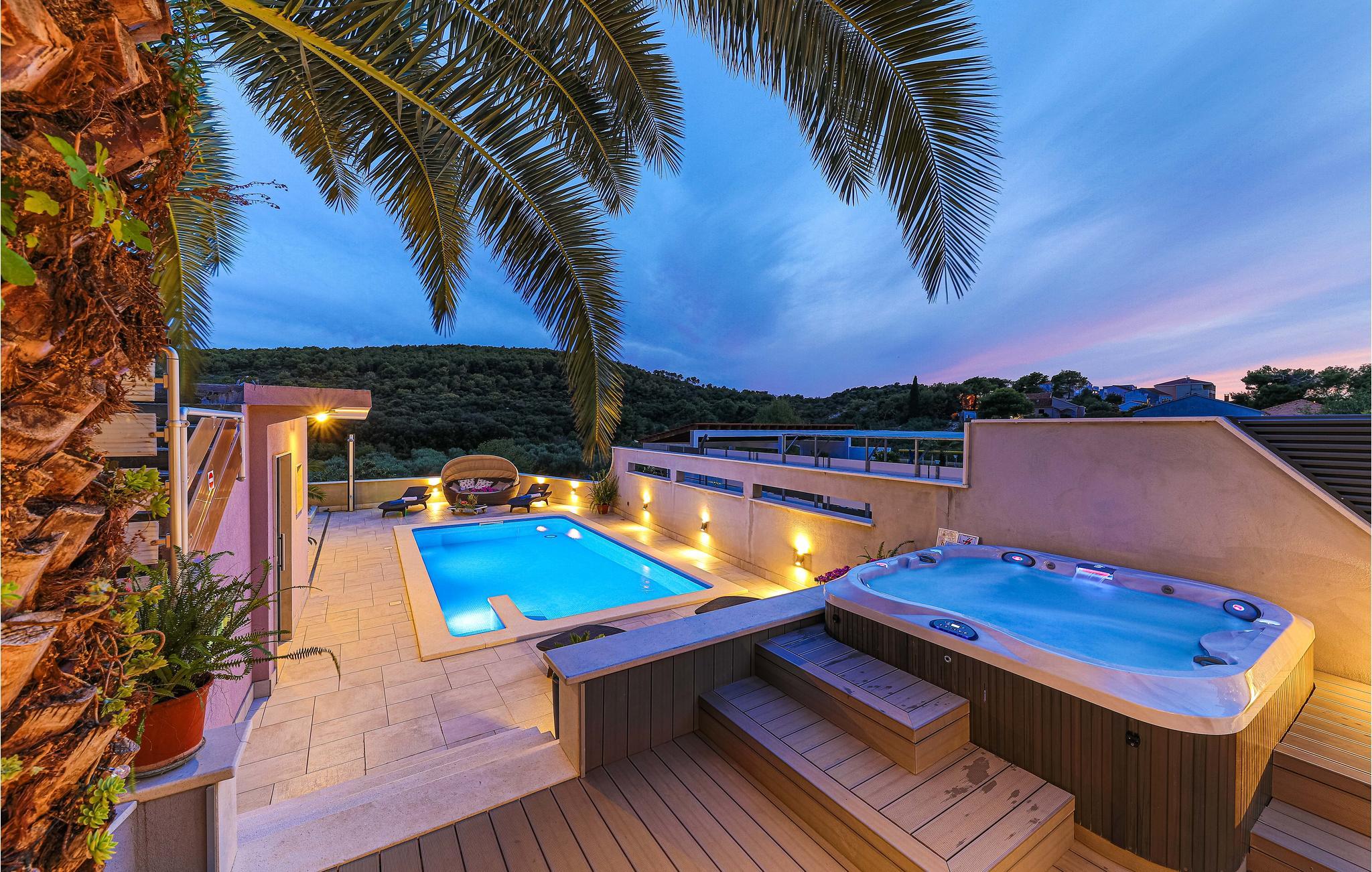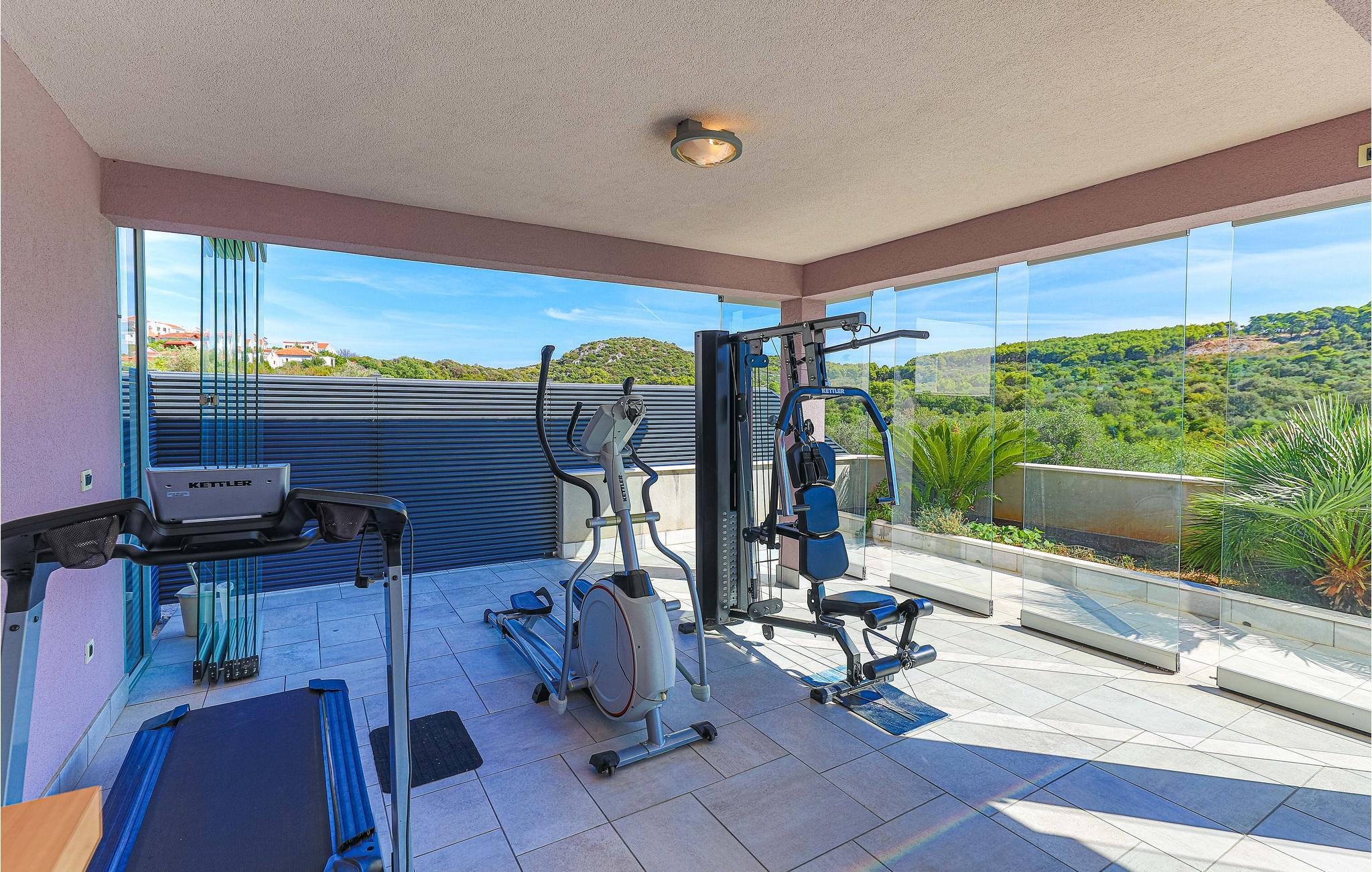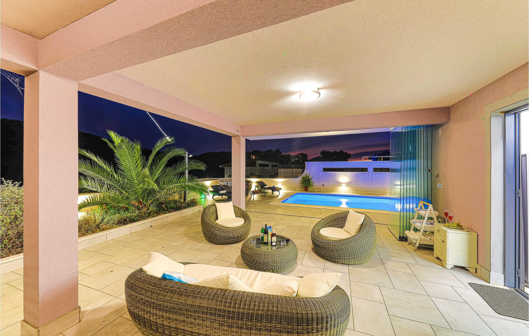Dette hus fordeler sig på stueplan og første sal, forbundet med udendørs trapper. Huset ligger på en lille bakketop omgivet af pinjeskove og ikke langt fra kiesstranden, som er dejlig indbydende, også for børnefamilier. Vil I bade under helt private former, så kan det sagtens lade sig gøre i husets egen pool og fra 2018 i whirlpoolen lige ved siden af. Omgivelserne er ugenerte og rolige, her bliver I kun vækket af fuglenes glade kvidren. Her kan I holde en uforglemmelig dejlig ferie som I sent vil glemme. Til feriehuset er der pool og fitnessrum og en lejlighed ved siden af der indeholder soveværelse, badeværelse, stue og køkken.