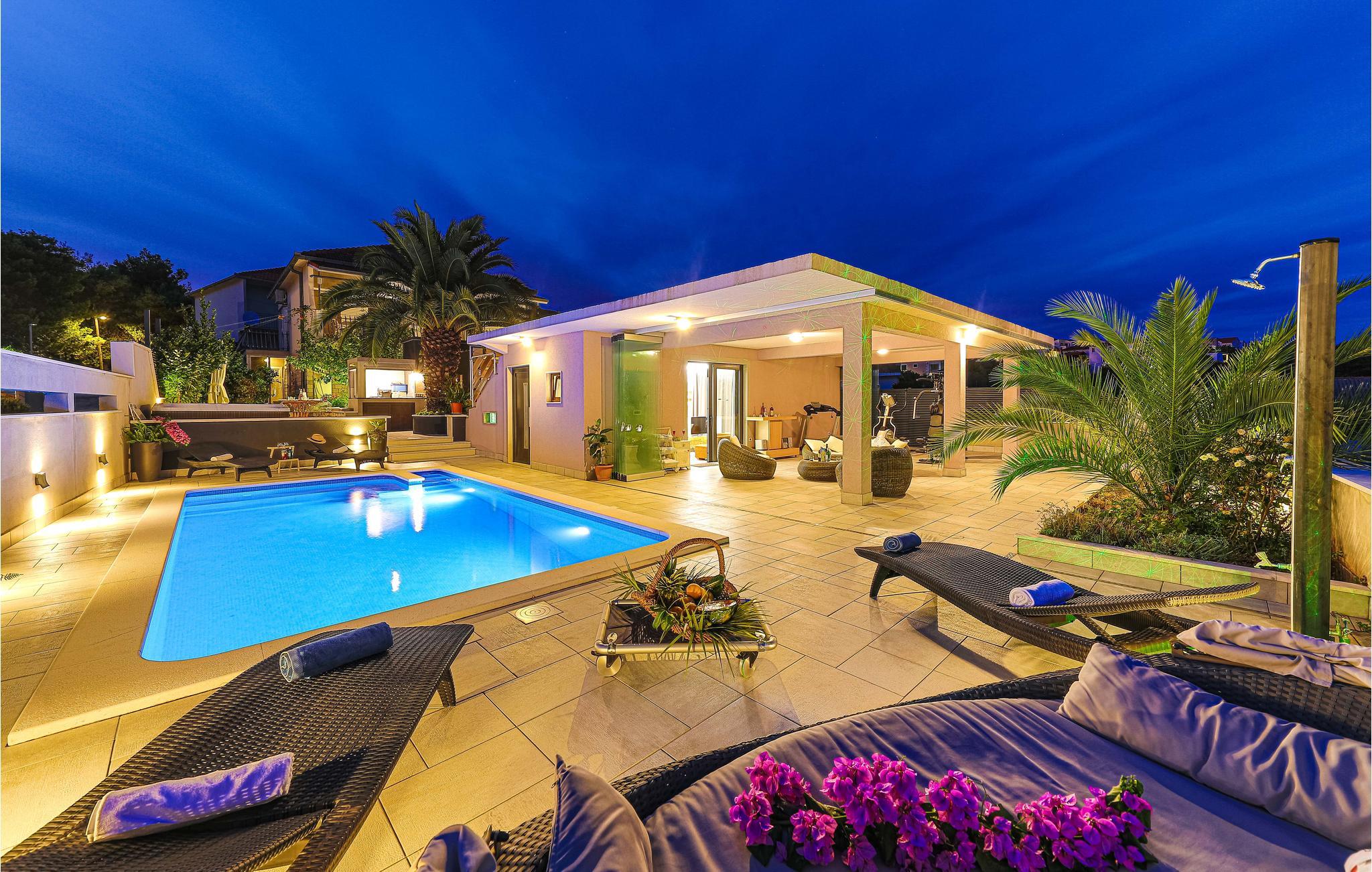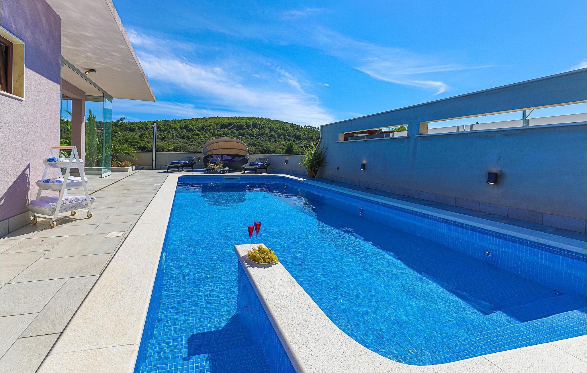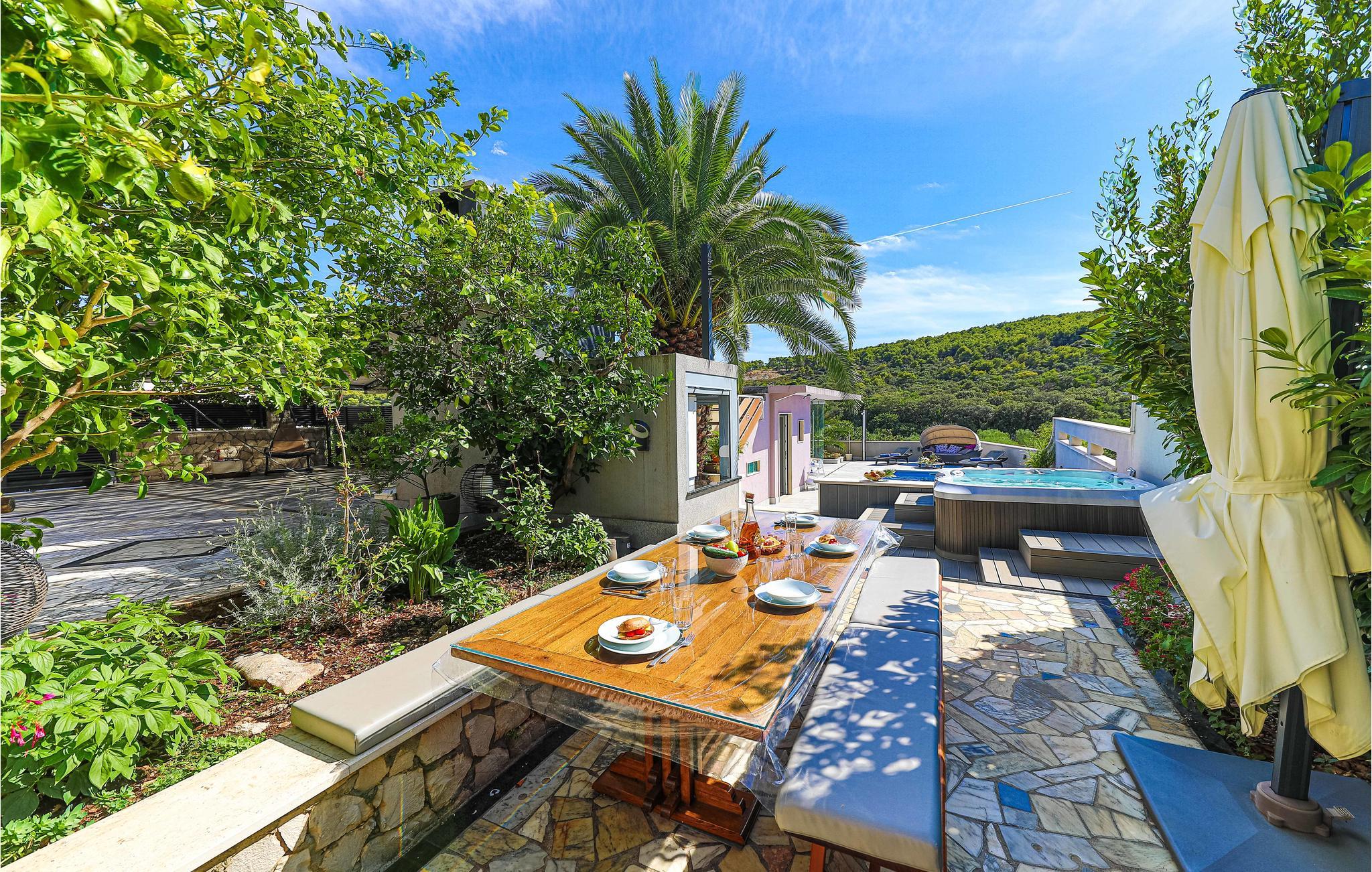 Dette hus fordeler sig på stueplan og første sal, forbundet med udendørs trapper. Huset ligger på en lille bakketop omgivet af pinjeskove og ikke langt fra kiesstranden, som er dejlig indbydende, også for børnefamilier. Vil I bade under helt private former, så kan det sagtens lade sig gøre i husets egen pool og fra 2018 i whirlpoolen lige ved siden af. Omgivelserne er ugenerte og rolige, her bliver I kun vækket af fuglenes glade kvidren. Her kan I holde en uforglemmelig dejlig ferie som I sent vil glemme. Til feriehuset er der pool og fitnessrum og en lejlighed ved siden af der indeholder soveværelse, badeværelse, stue og køkken.