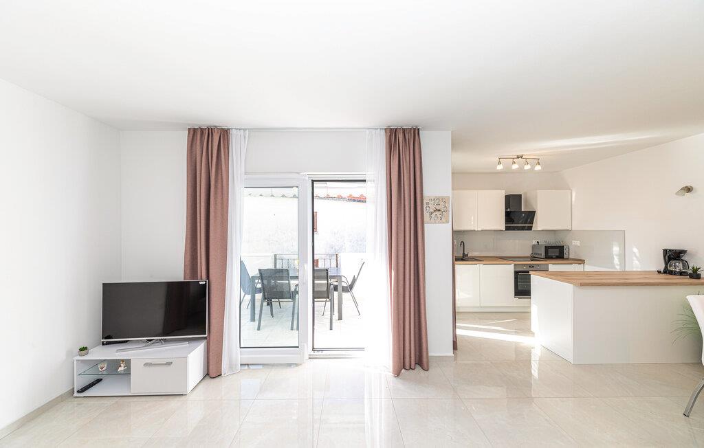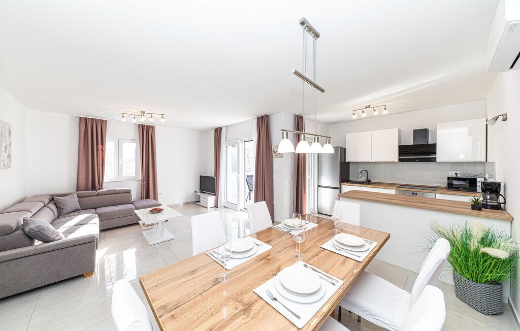 Der er lagt op til et vidunderligt ophold i denne smukke og komfortable ferielejlighed, der med sine lyse farveskalaer og gennemtænkte indretning skaber en rolig oase for hele familien. Boligen prydes af et vellykket mix af ??rustikke stenfliser, varme træmøbler og et moderne, veludstyret køkken, hvor kokkene kan tage sig god tid til at kræse om familiens livretter. Fra altanen og tagterrassen kan I nyde udsigten over havet, mens I spiser dagens lækre måltider i det fri. Lad blot aftenen gå på et hæld med et glas vin og st spil kort, mens I lægger planer for dagen, der kommer.