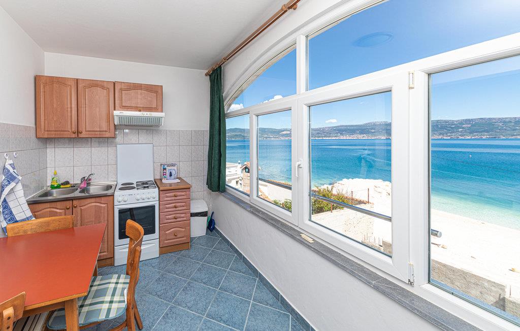 Denne lejlighed ligger ved strandpromenaden i Slatine, et sted halvvejs mellem Trogir og Split, som I kan besøge ved at benytte henholdsvis bilen og en båd.