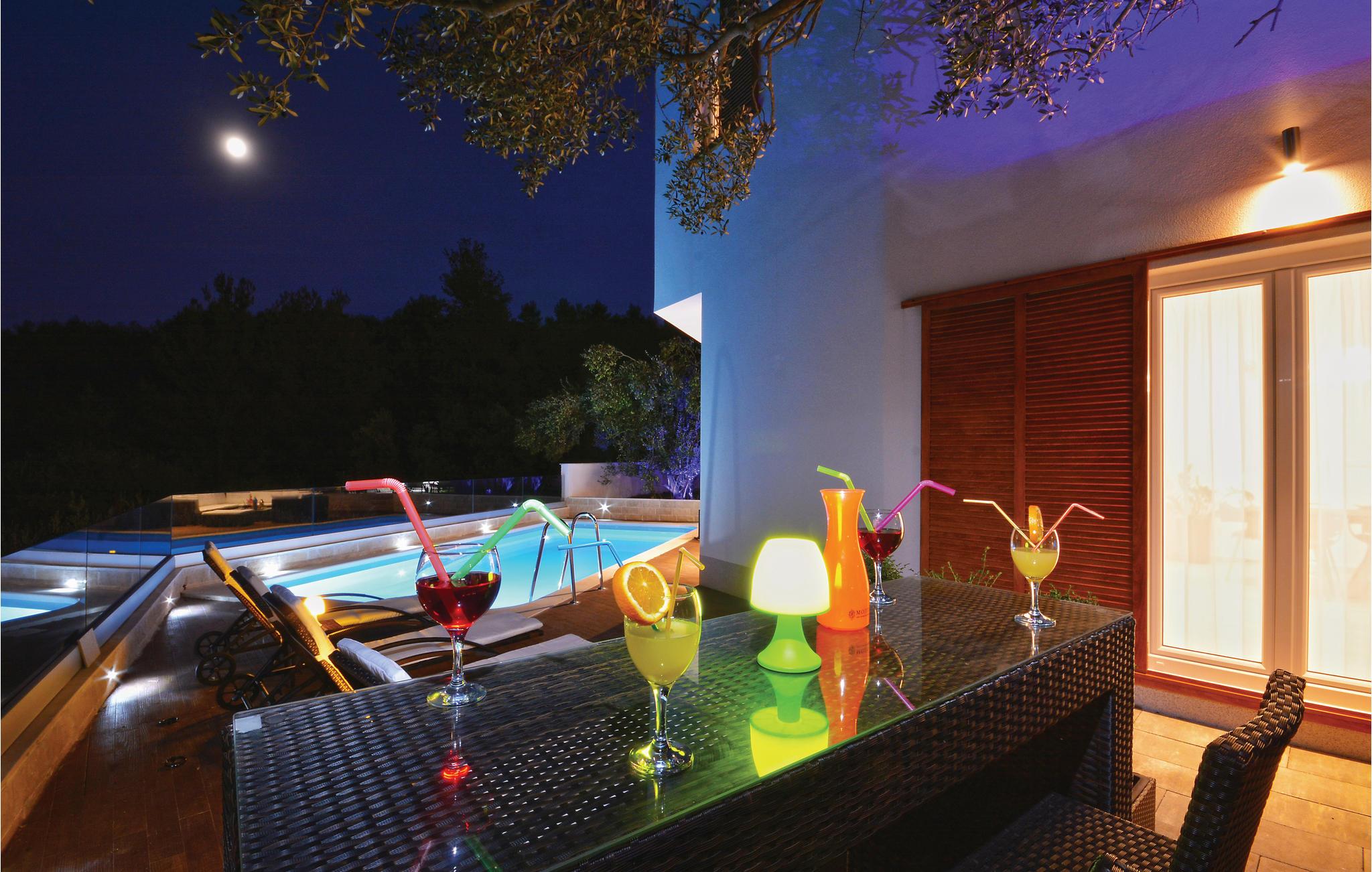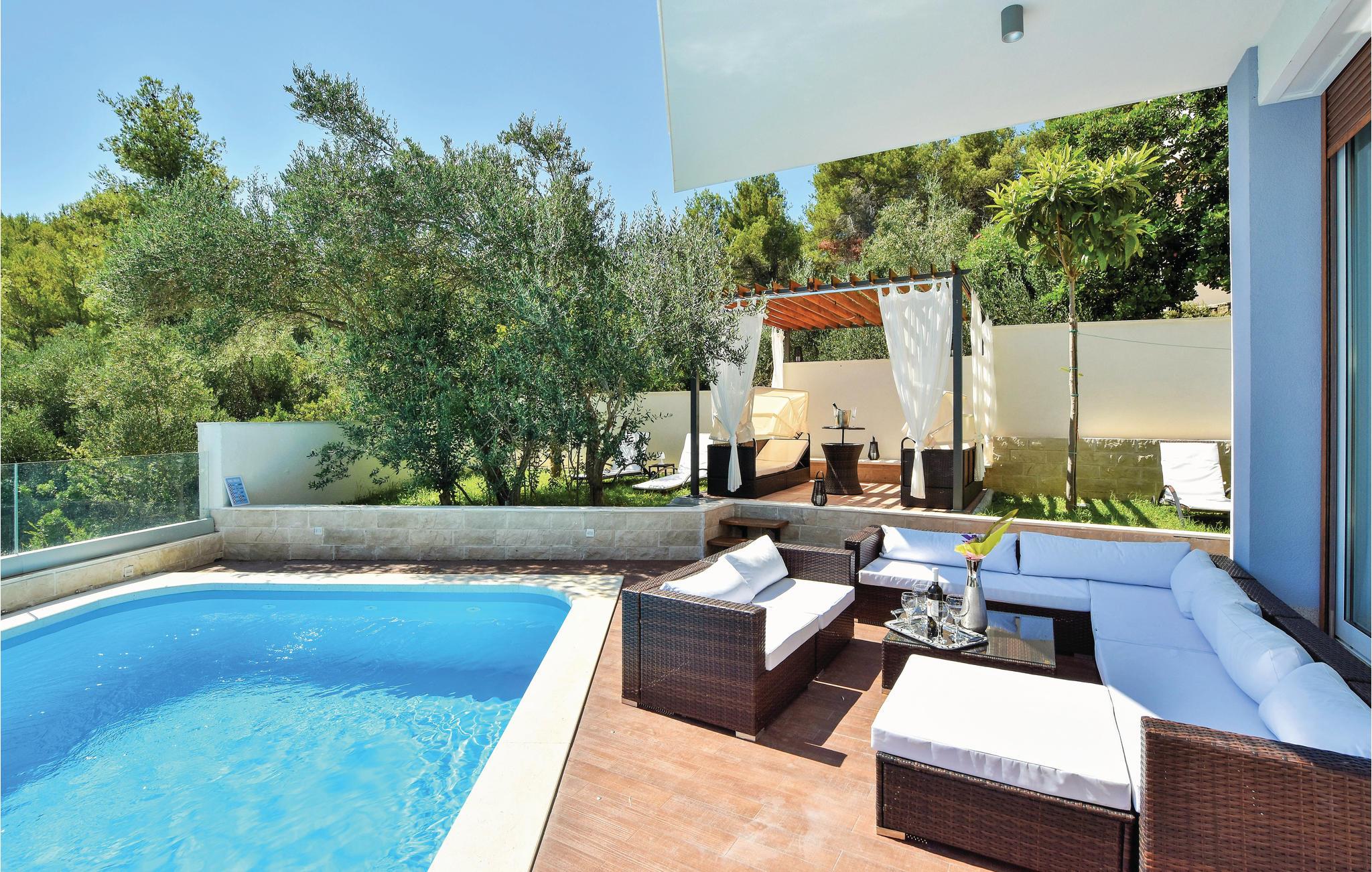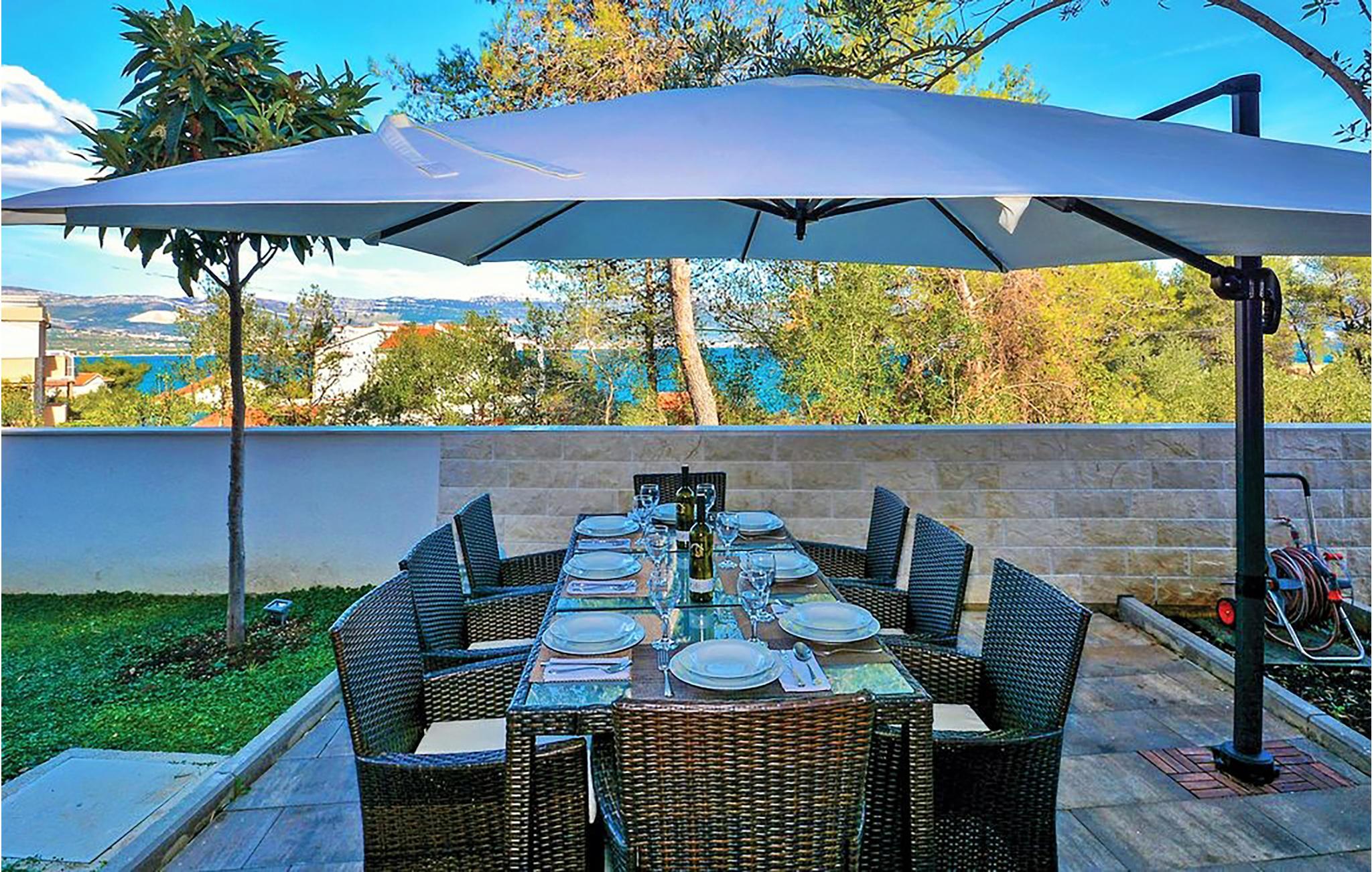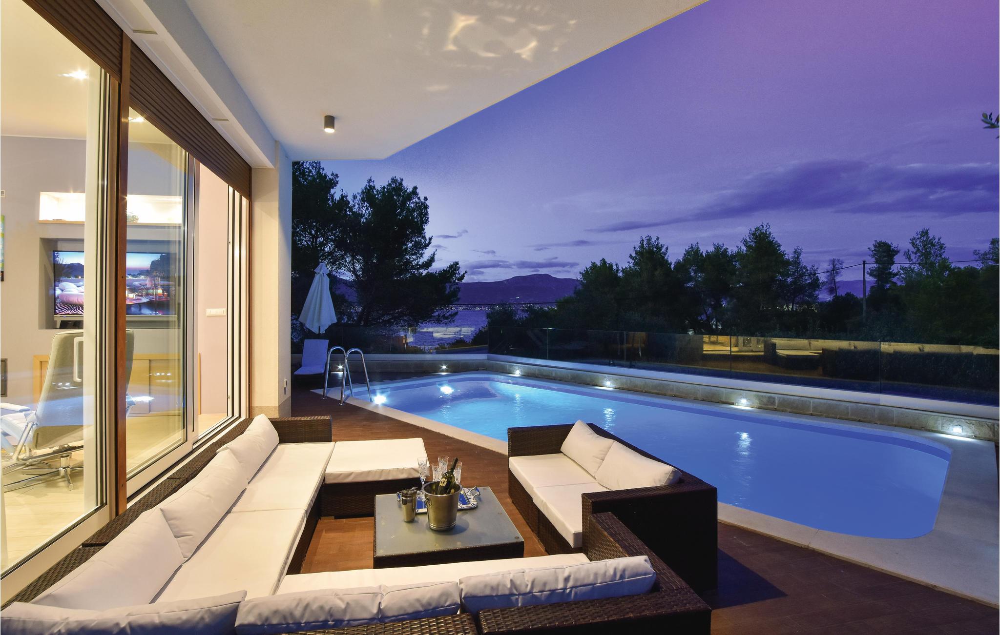 Dette stilfulde feriehus med pool ligger ved siden af en fyrreskov, kun ca. 100 m fra havet. I stueetagen er der: et rummeligt køkken, dagligstue med spiseområde og udgang til terrassen, sommerkøkken med grill, fritidsrum med lille bar og fitnessrum. På 1. sal er der fire soveværelser med bad en suite. Nyd den dejligt anlagte og fuldstændig inhegnede grund med herlig udsigt over landskabet og slap af på en af terrasserne. Opdag mange dejlige strande på øen og besøg den historiske by Trogir, der hører til UNESCOs verdenskulturarv og byder på underholdning og gastronomiske tilbud.