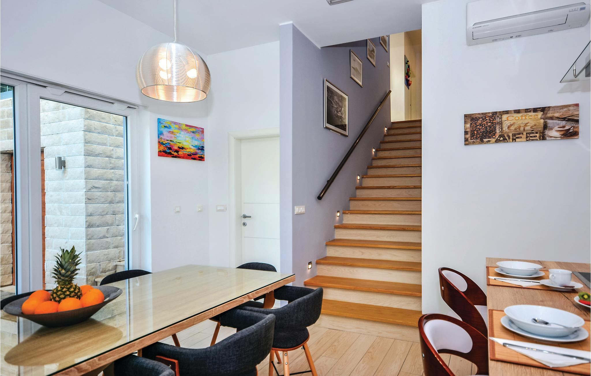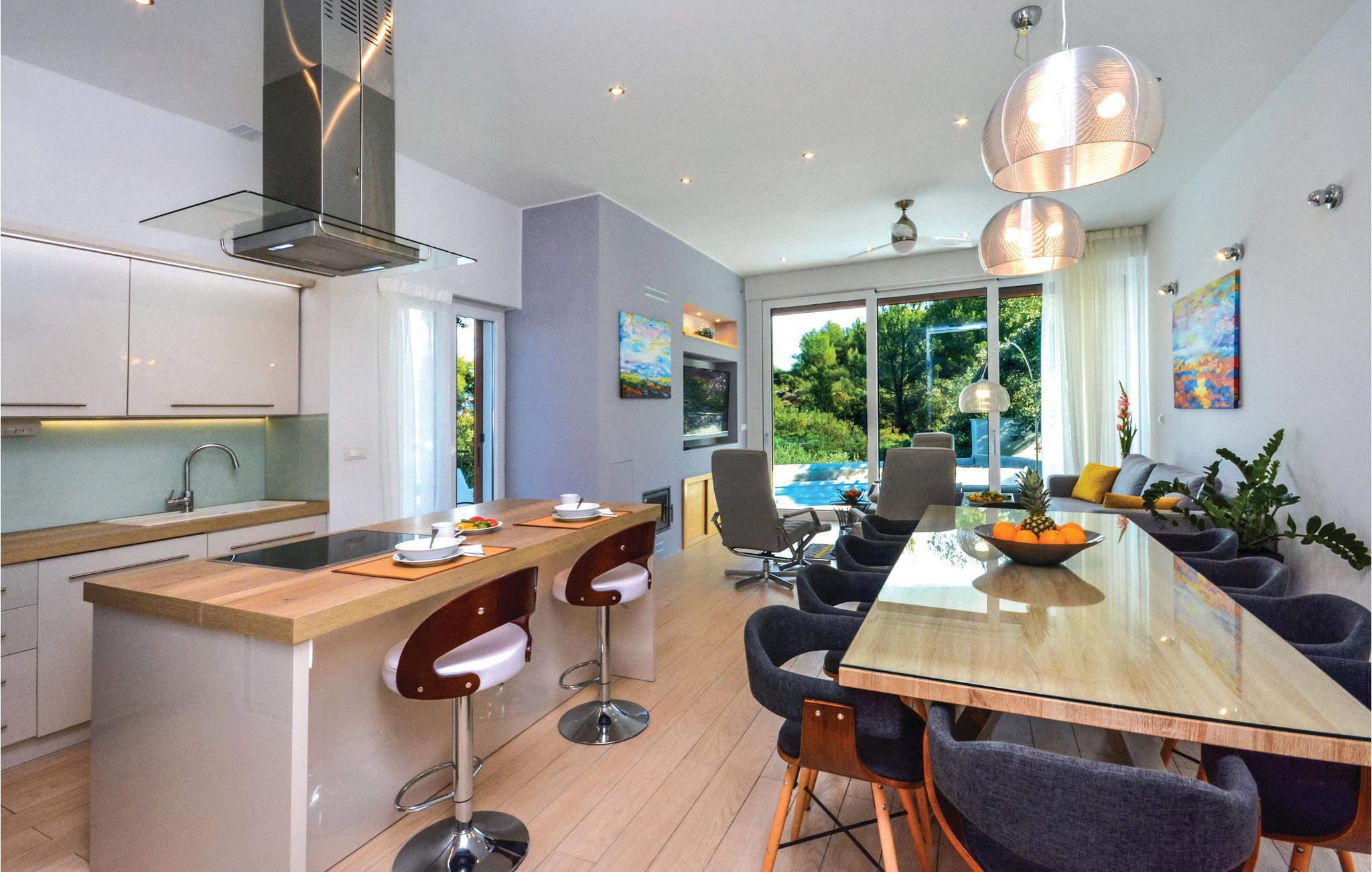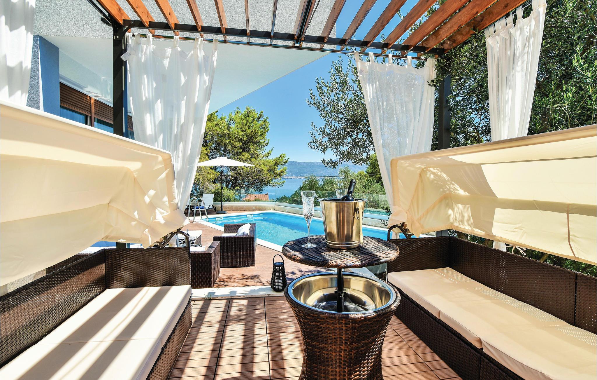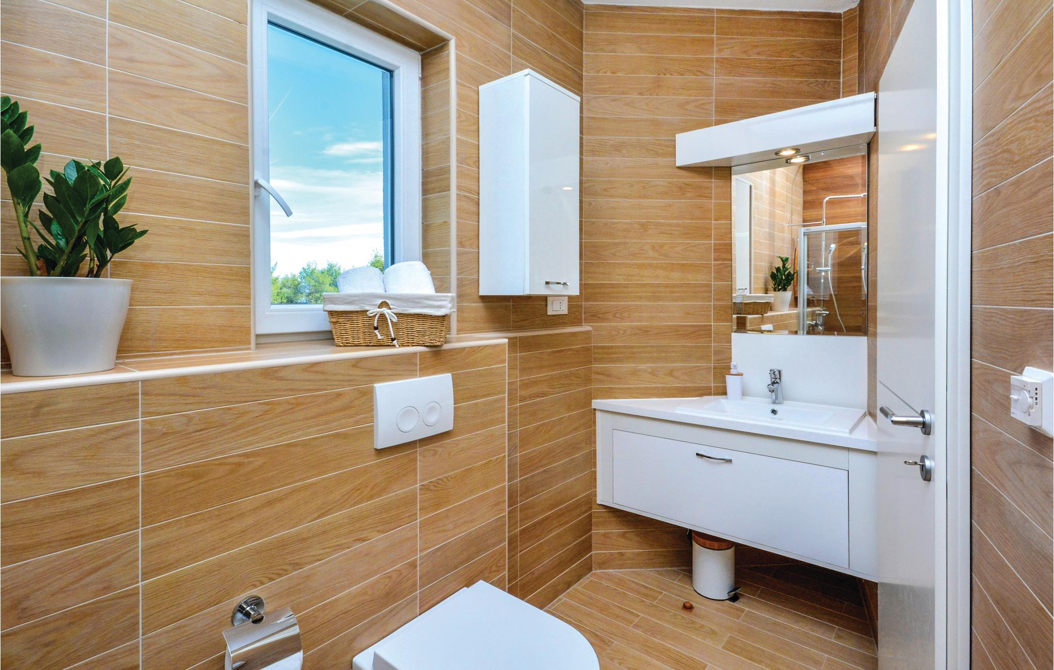Dette stilfulde feriehus med pool ligger ved siden af en fyrreskov, kun ca. 100 m fra havet. I stueetagen er der: et rummeligt køkken, dagligstue med spiseområde og udgang til terrassen, sommerkøkken med grill, fritidsrum med lille bar og fitnessrum. På 1. sal er der fire soveværelser med bad en suite. Nyd den dejligt anlagte og fuldstændig inhegnede grund med herlig udsigt over landskabet og slap af på en af terrasserne. Opdag mange dejlige strande på øen og besøg den historiske by Trogir, der hører til UNESCOs verdenskulturarv og byder på underholdning og gastronomiske tilbud.