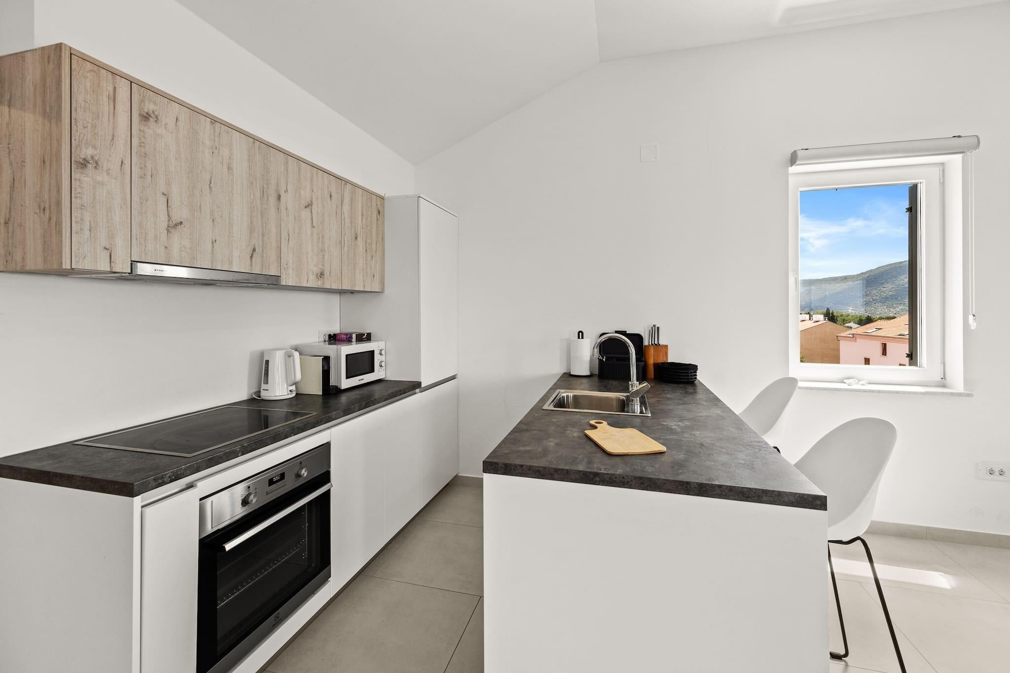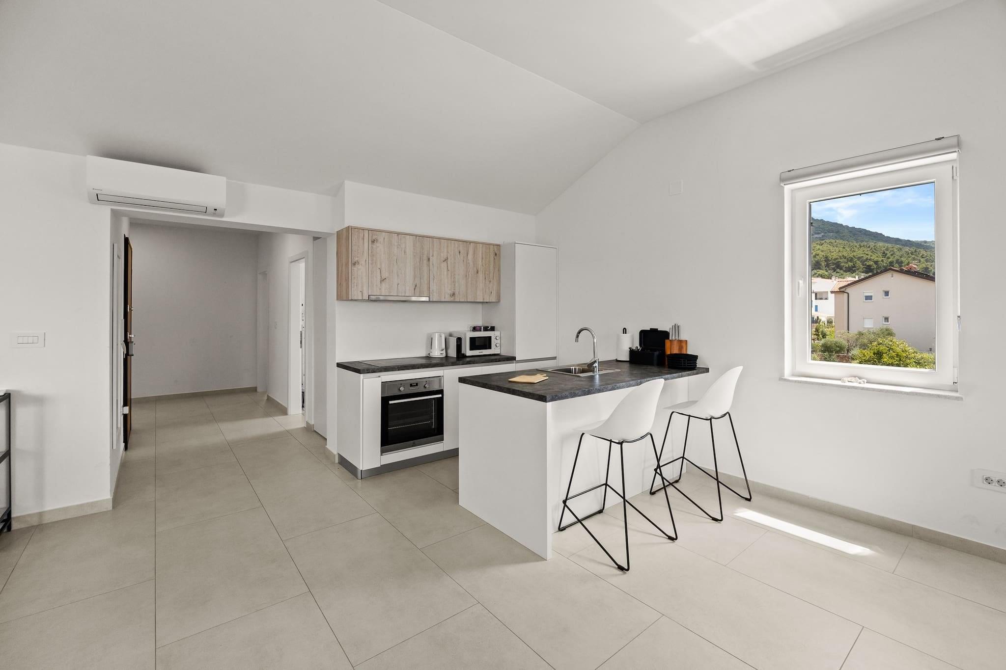 Denne ejendom tilbyder sammen med sit moderne design og rummelige layout et behageligt ophold for op til seks gæster. Den har to store dobbeltsenge og en køjeseng i sine tre soveværelser, med en sovesofa i stuen til ekstra soveplads. Lejligheden har en privat balkon med en fantastisk havudsigt, perfekt til at slappe af eller nyde måltider udendørs. Ejendommen er kæledyrsvenlig og tillader små kæledyr med forudgående varsel, og tilbyder også yderligere faciliteter såsom en barneseng og høj stol efter anmodning. Gratis privat parkering er tilgængelig for gæsterne, hvilket sikrer bekvemmelighed under deres ophold. Lejligheden er ideelt beliggende i gåafstand fra en smuk sandstrand, hvilket gør den perfekt til strandelskere. I nærheden kan gæsterne udforske den charmerende lokale landsby med et udvalg af caféer, restauranter og butikker at nyde. Den gamle bydel i Rab, kendt for sine historiske smalle gader og traditionelle bygninger, ligger også tæt på. Offentlig transport er let tilgængelig, med busstationer i nærheden, og færger kører ofte for at forbinde øen med fastlandet. Den nærmeste lufthavn er let tilgængelig med bil, hvilket gør det bekvemt at rejse til og fra området. Lejligheden har et fuldt udstyret køkken med køleskab, ovn, mikroovn, opvaskemaskine og kaffemaskine, perfekt til at tilberede måltider under dit ophold. Det velindrettede badeværelse har moderne bekvemmeligheder såsom bruser, hårtørrer og kropssæbe. Yderligere bekvemmeligheder inkluderer aircondition, satellit-tv og gratis Wi-Fi, hvilket sikrer et afslappende og behageligt ophold.