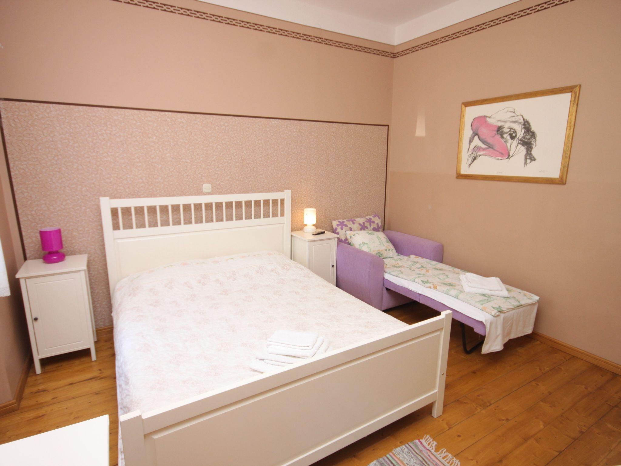 Zimmer bietet Platz für 3 Gäste. Die Betten sind in Schlafzimmern, die es 1 gibt, innerhalb einer Gesamtfläche von 19m2, angeordnet. In der Unterkunftseinheit besteht die Möglichkeit des Mitbringens von Haustieren gegen Aufpreis. Die reservierte Unterkunftseinheit hat keinen Balkon und keine Terrasse. Die reservierte Unterkunftseinheit ist ein Zimmer mit eigenem Badezimmer ohne die Möglichkeit der Nutzung einer Küche. IM PREIS INBEGRIFFEN: Frühstück, Endreinigung, Parkplatz, Internet, Wäschewaschen, Kinderbett. VERBINDLICHE ZUSÄTZLICHE KOSTEN: Kurtaxe (Erwachsene 0,93 € - 1,80 € Nacht/Person, Kinderermäßigung 12 - 17 Jahre). UNVERBINDLICHE ZUSÄTZLICHE KOSTEN: Halbpension (20,00 €, 50% Nachlass für Kinder zwischen 4 und 12 Jahren, Kinder bis 4 Jahre sind frei.), Haustiere (10,00 € pro Nacht). Die Verfügbarkeit zusätzlicher Dienstleistungen in Ihrem reservierten Termin und die Preise derselben (falls nicht aufgeführt) müssen im Voraus überprüft werden. Zusätzliche Dienstleistungen die in der Zahlungsaufforderung nicht aufgeführt sind werden direkt beim Vermieter bezahlt, angenommen der Gast nutzt auch diese. Ermäßigung auf den Grundpreis: Gratistag 14=13 (bei einem Aufenthalt von 14 Tagen oder mehr erhalten Sie einen Gratistag für den Aufenthalt bis 31.12.26).