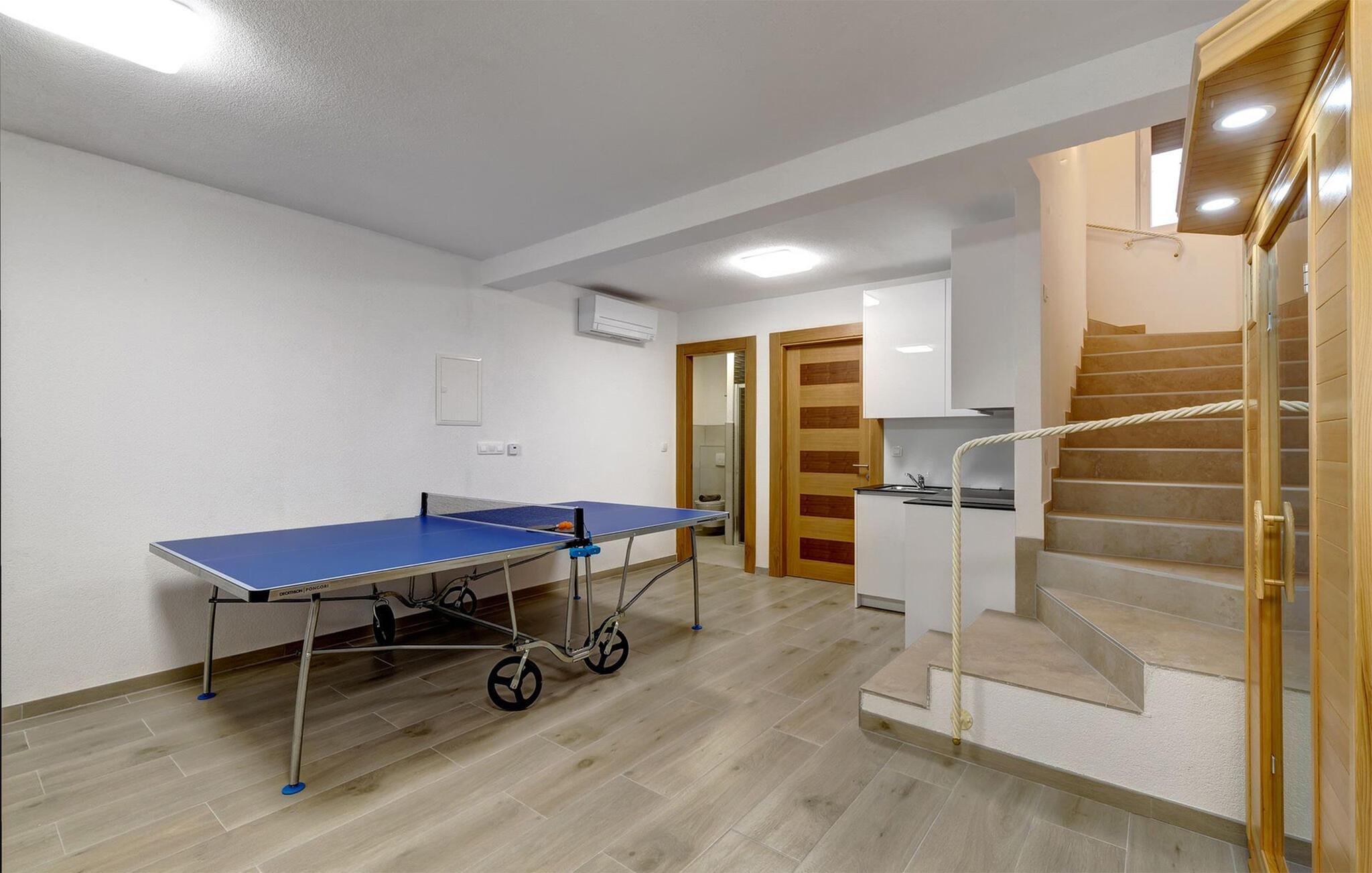 Der er lagt op til komfort, afslapning og luksus på den helt store klinge i dette rummelige og moderne ferieparadis af en villa. Det emmer simpelthen af kvalitet over hele linjen her; indretningen fremstår gennemtænkt, åben og med alskens attraktive faciliteter, så I ikke kan undgå at føle jer hjemme og komme ned i et lækkert, dovent ferietempo. Det står på både afslapning og afveksling her; Udfordr hinanden til nogle drabelige dueller ved bordtennis- og poolbordet, inden I nyder lidt god wellness og sveder igennem i den infrarøde sauna.