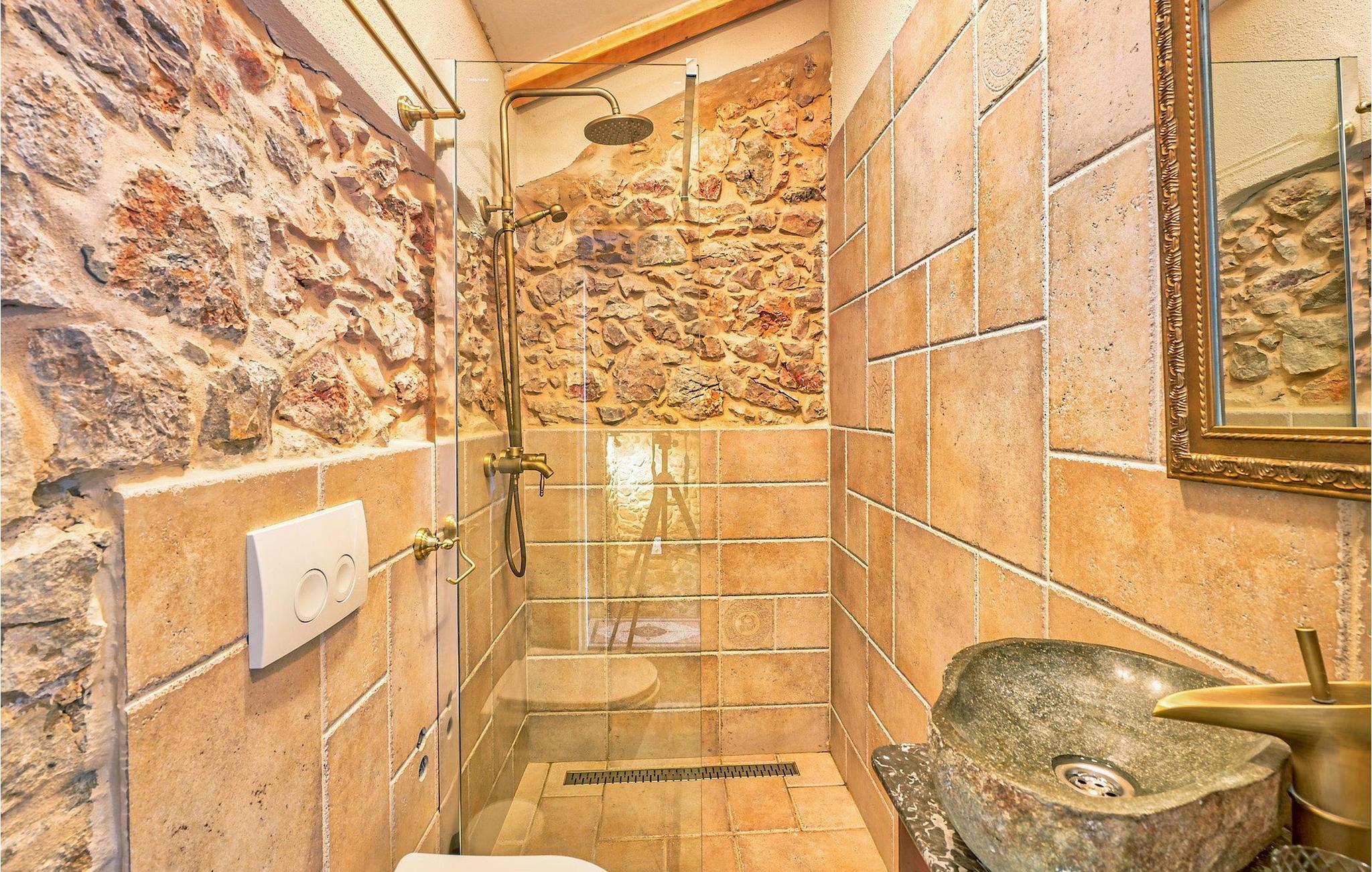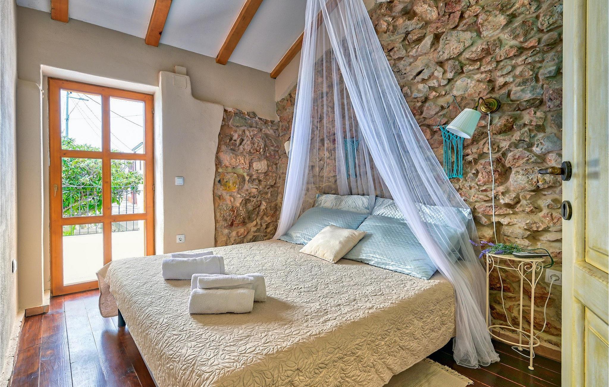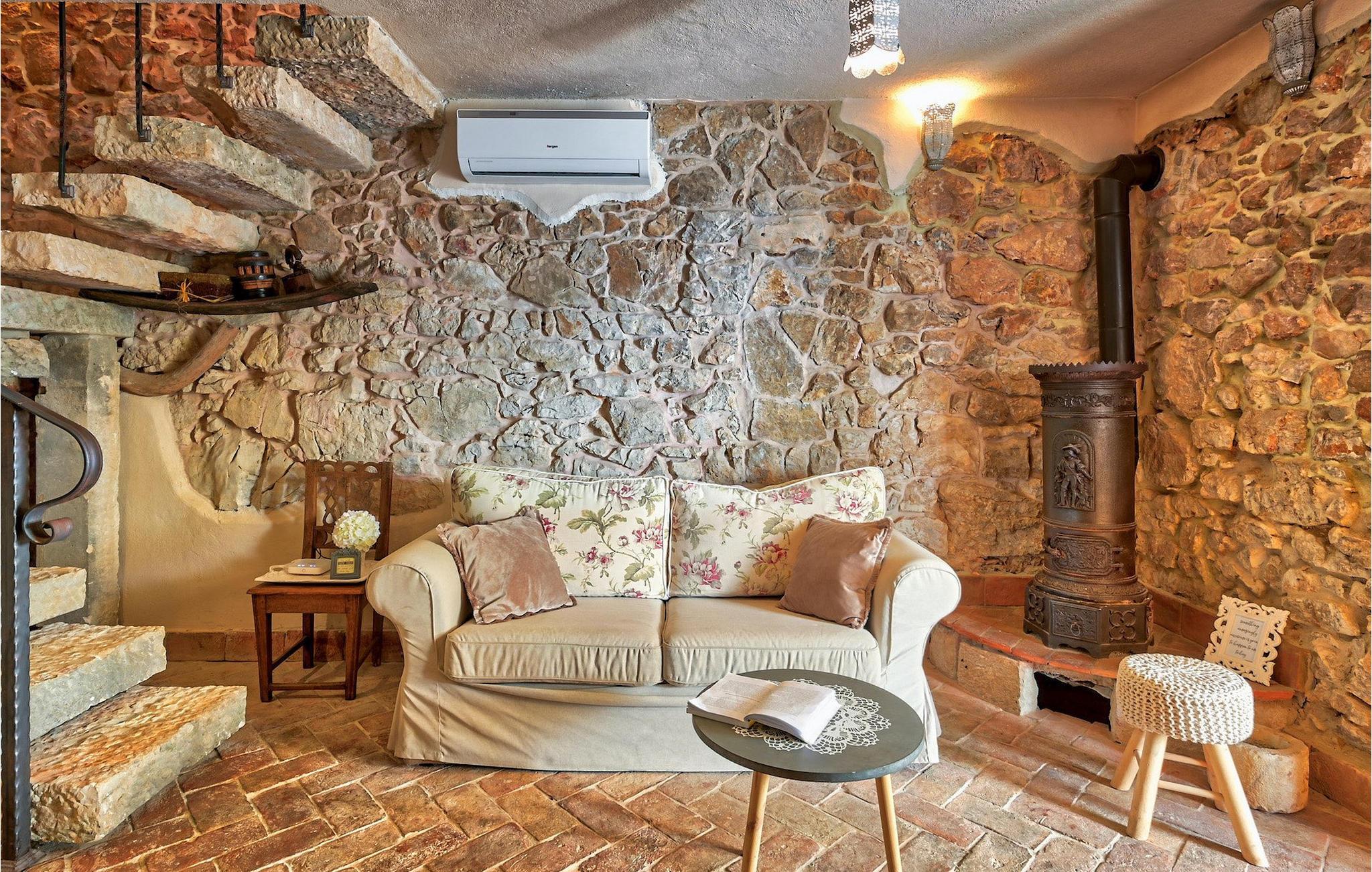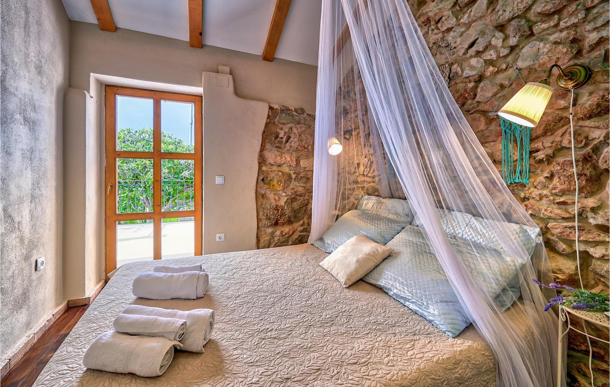 I stueetagen er der køkken og spise- og opholdsstue med brændeovn, et soveværelse med to senge og et badeværelse med bruseniche. Du kommer til første sal ved at gå op ad den autentiske stentrappe, hvor du kan finde to soveværelser med dobbeltseng, et badeværelse og udgang til altan.