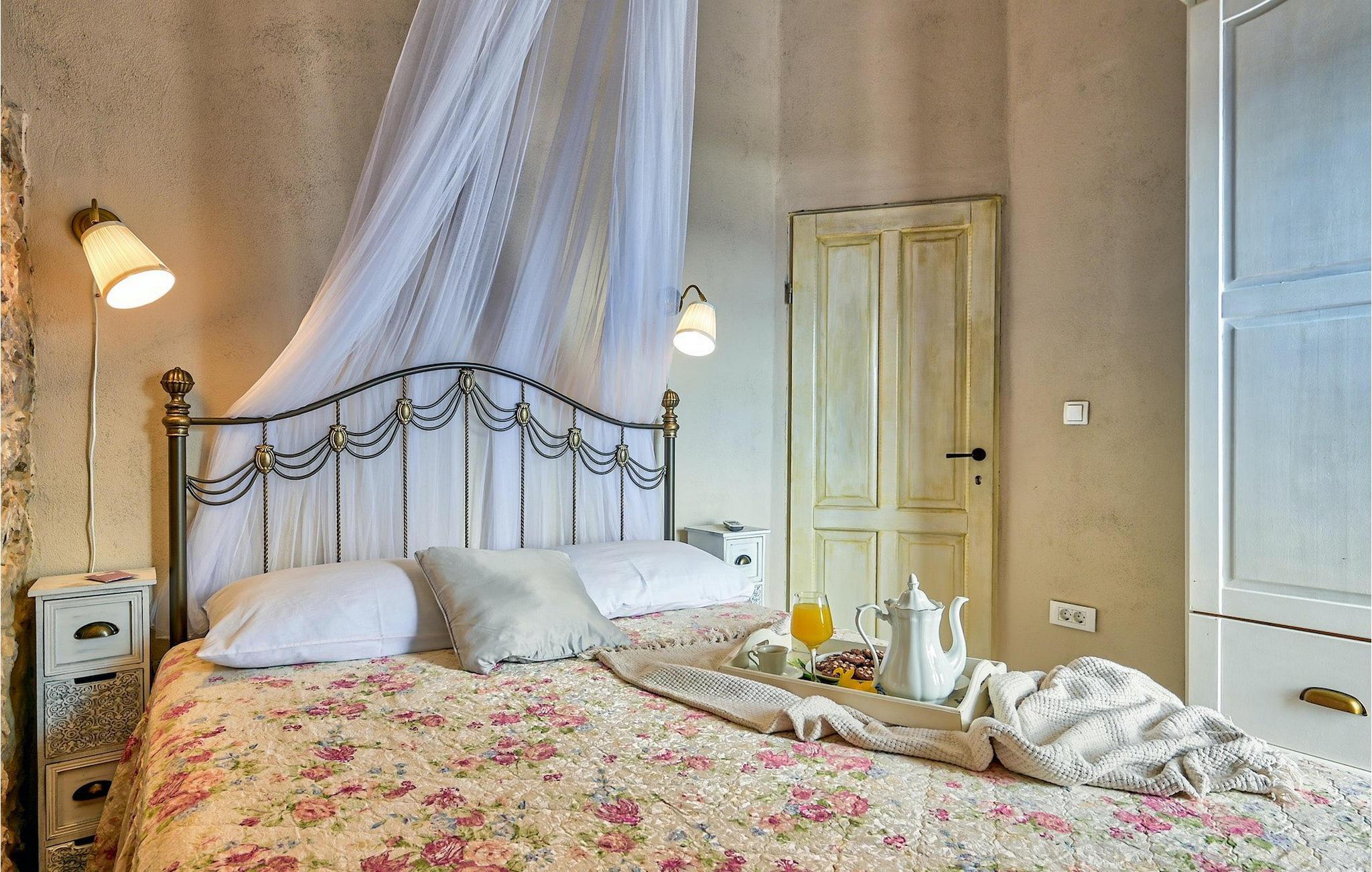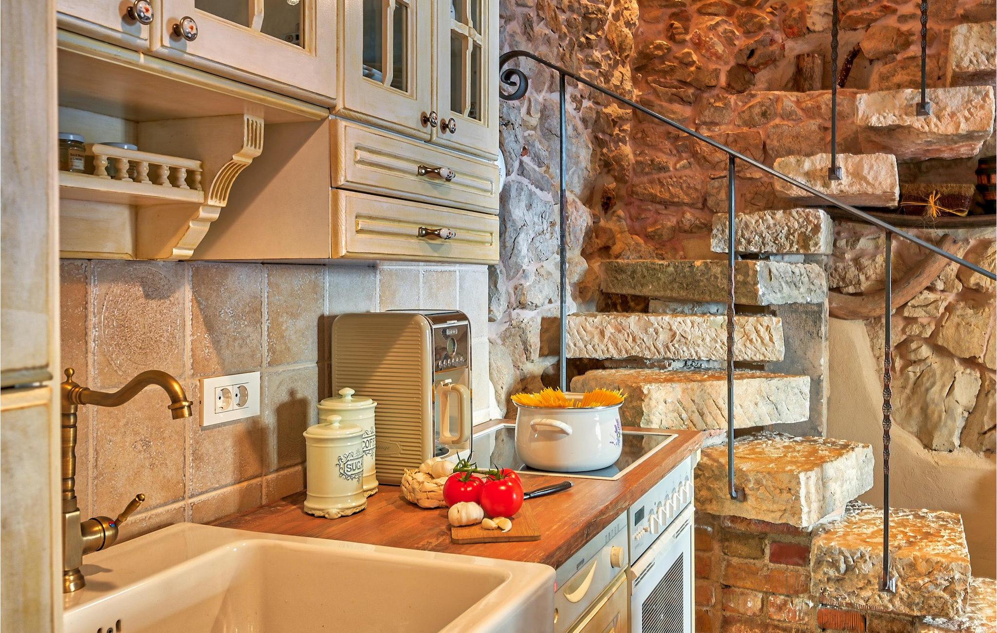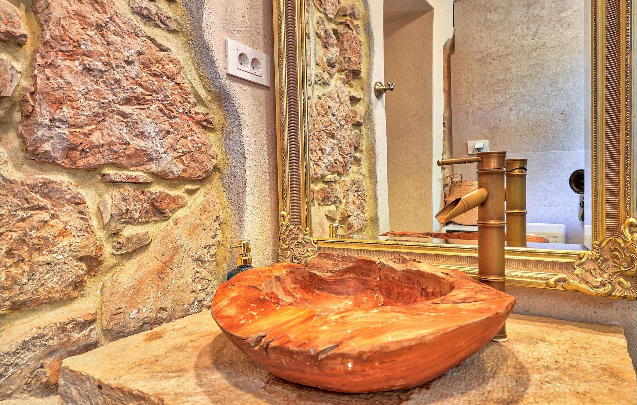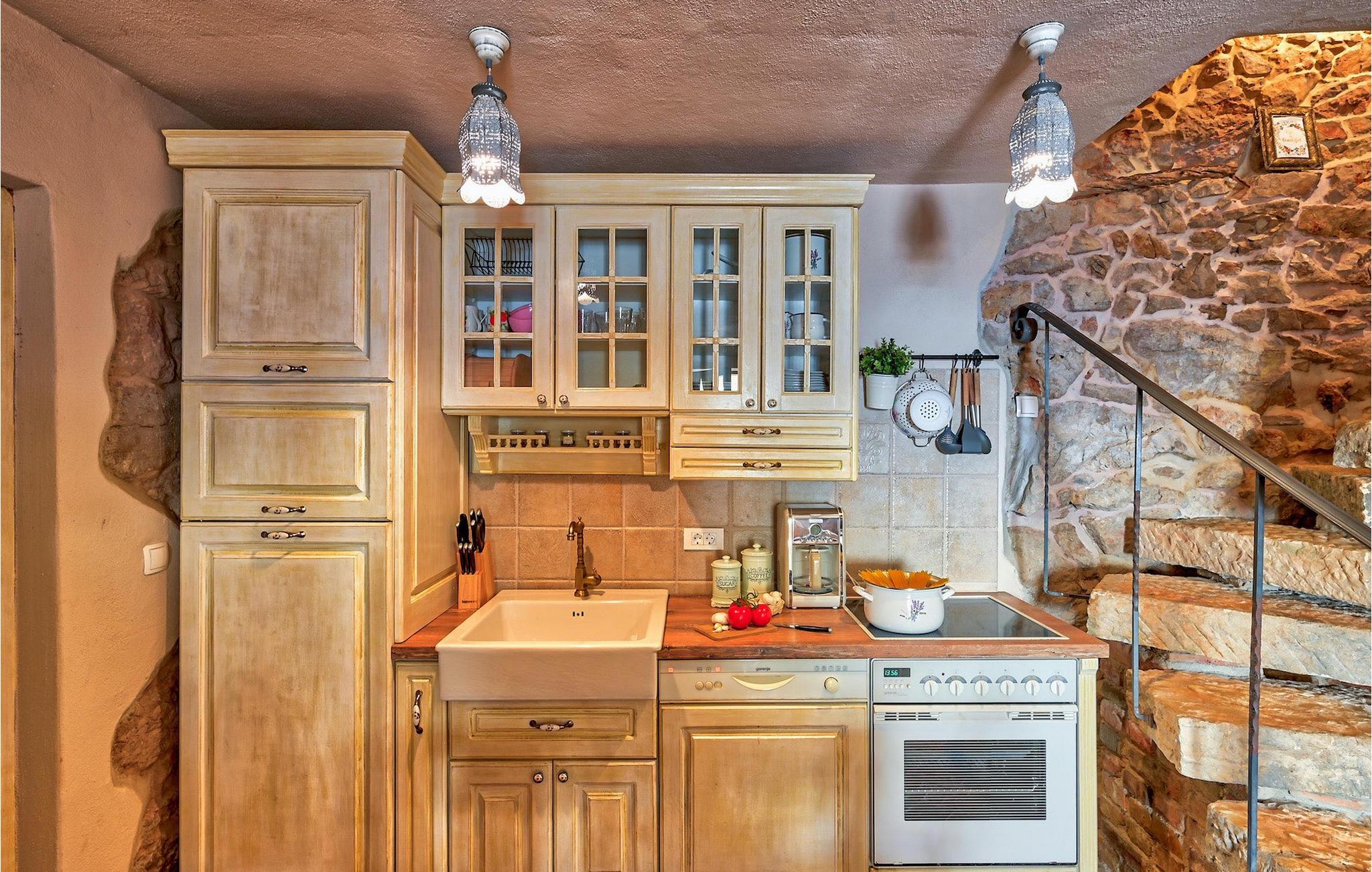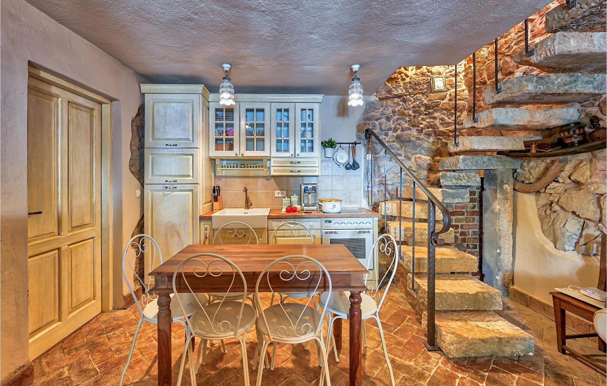 I stueetagen er der køkken og spise- og opholdsstue med brændeovn, et soveværelse med to senge og et badeværelse med bruseniche. Du kommer til første sal ved at gå op ad den autentiske stentrappe, hvor du kan finde to soveværelser med dobbeltseng, et badeværelse og udgang til altan.