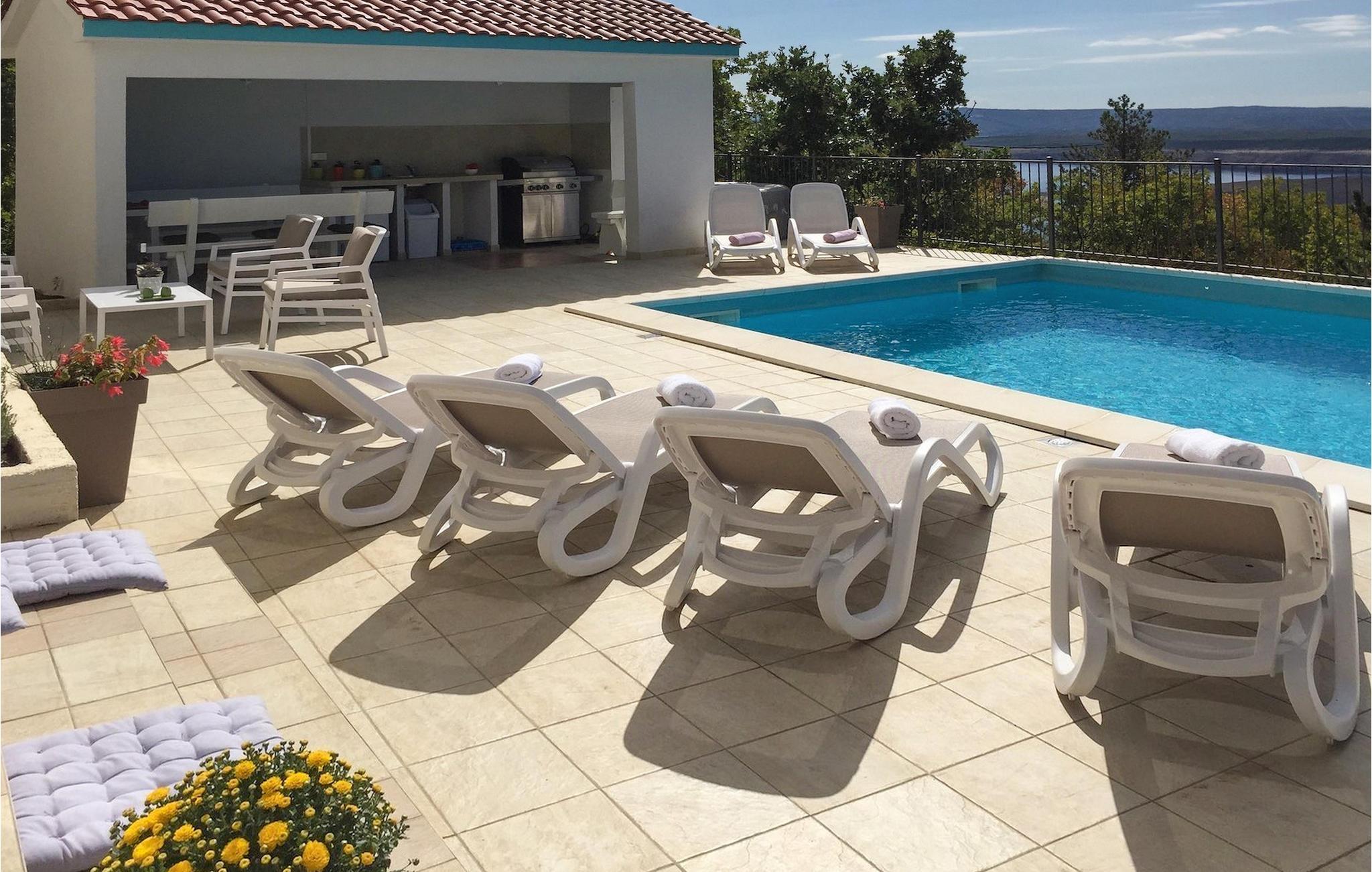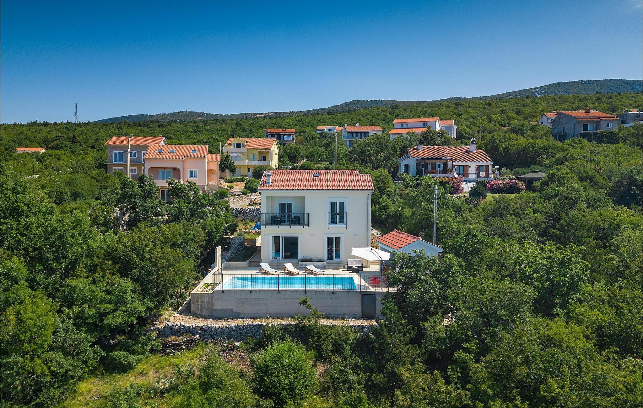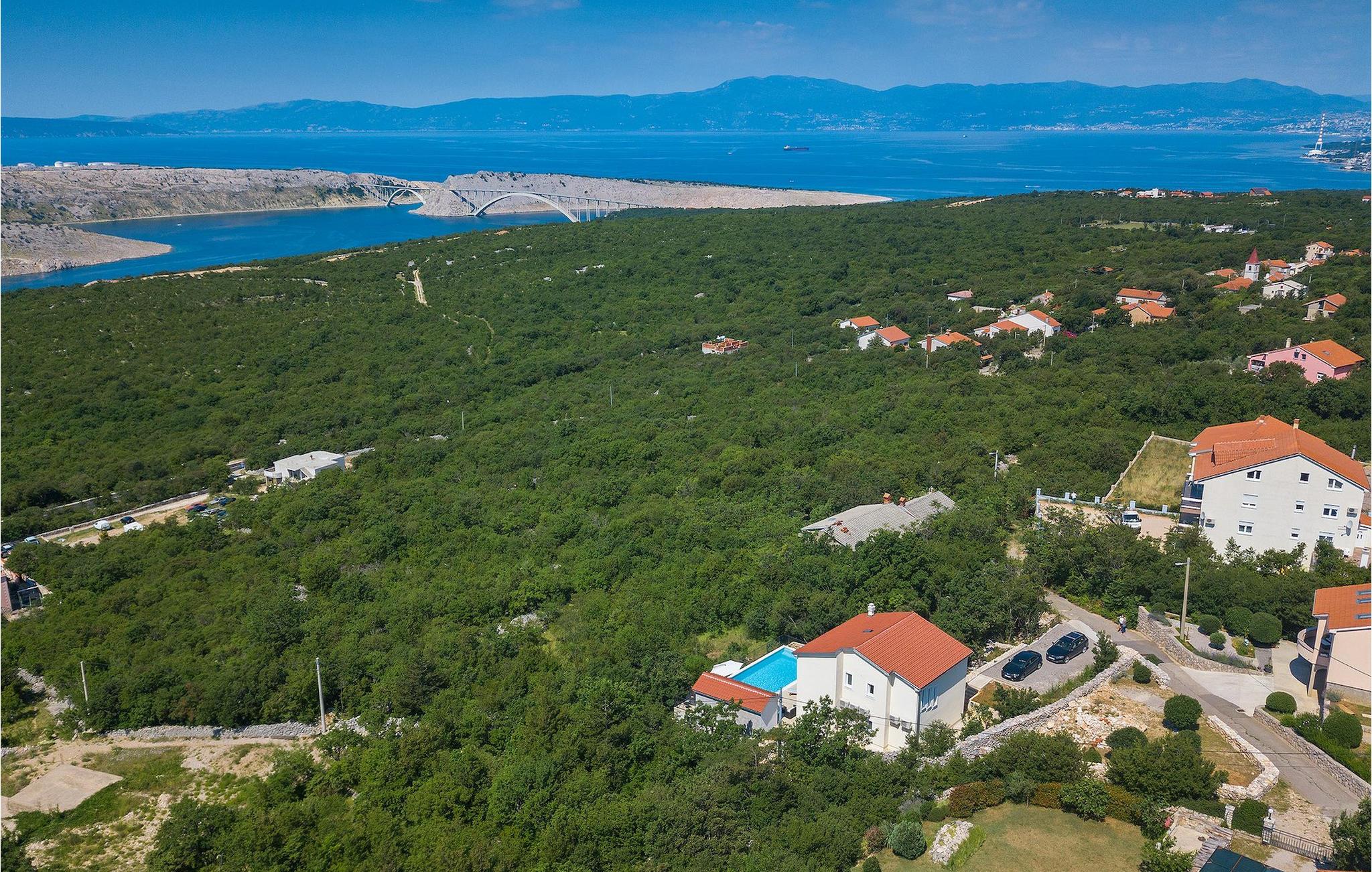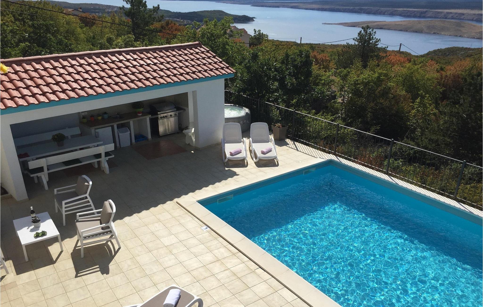 Villa Aqua ligger i den lille landsby Smrika nær øen Krk. Det kan rumme op til 8 personer og tilbyder nok plads til familier eller vennegrupper. Fra ejendommen kan du nyde en betagende udsigt over havet og øerne. Den private pool indbyder til en forfriskning på varme sommerdage. Der er liggestole omkring poolen, hvor du kan slappe af. Villaen byder på et charmerende interiør. Stueetagen af villaen byder på et åbent rum med et fuldt udstyret køkken med spiseplads, hyggelig stue og et badeværelse. På første sal er der 3 komfortable soveværelser og 2 badeværelser. 2 soveværelser med hver en dobbeltseng og udgang til fælles altan som er perfekt til at nyde morgenkaffen. Placeringen af villaen tilbyder fuldstændig privatliv - en fantastisk ferie er garanteret. Book nu og nyd Villa Aqua. Villa Aqua ligger i den lille landsby Šmrika nær øen Krk. Kraljevica, den nærmeste strand, ligger kun 1,2 kilometer fra villaen. Villa Aqua overrasker sine besøgende med sin beliggenhed. Dens magiske udsigt strækker sig til øen Krk. Restauranter og caféer ligger i landsbyen Šmrika. Supermarkeder kan findes i Crikvenica, som ligger omkring 9 kilometer fra villaen. Sørg for at udforske naturen omkring Villa Aqua og nyd den skønhed, den byder på.
