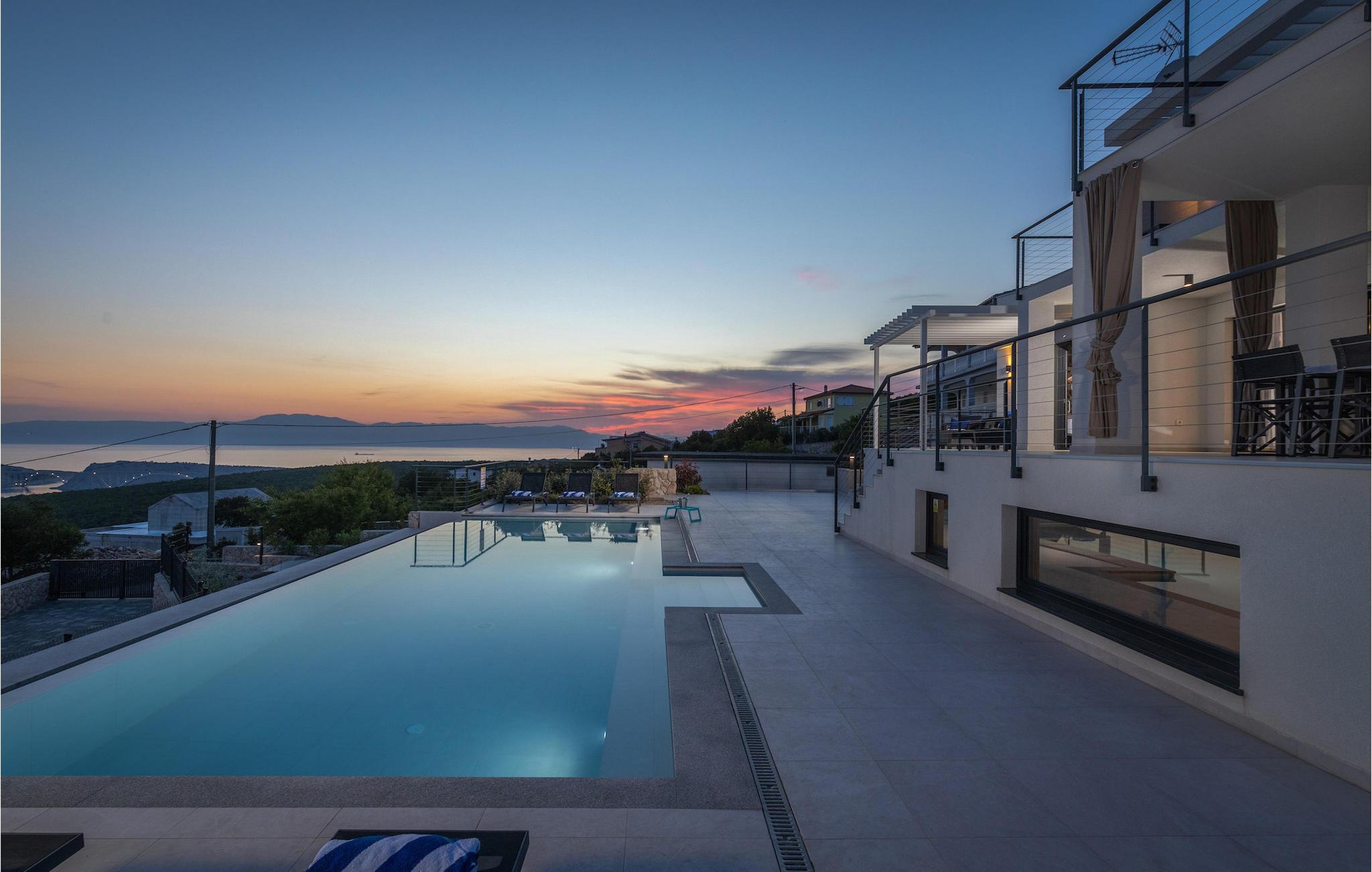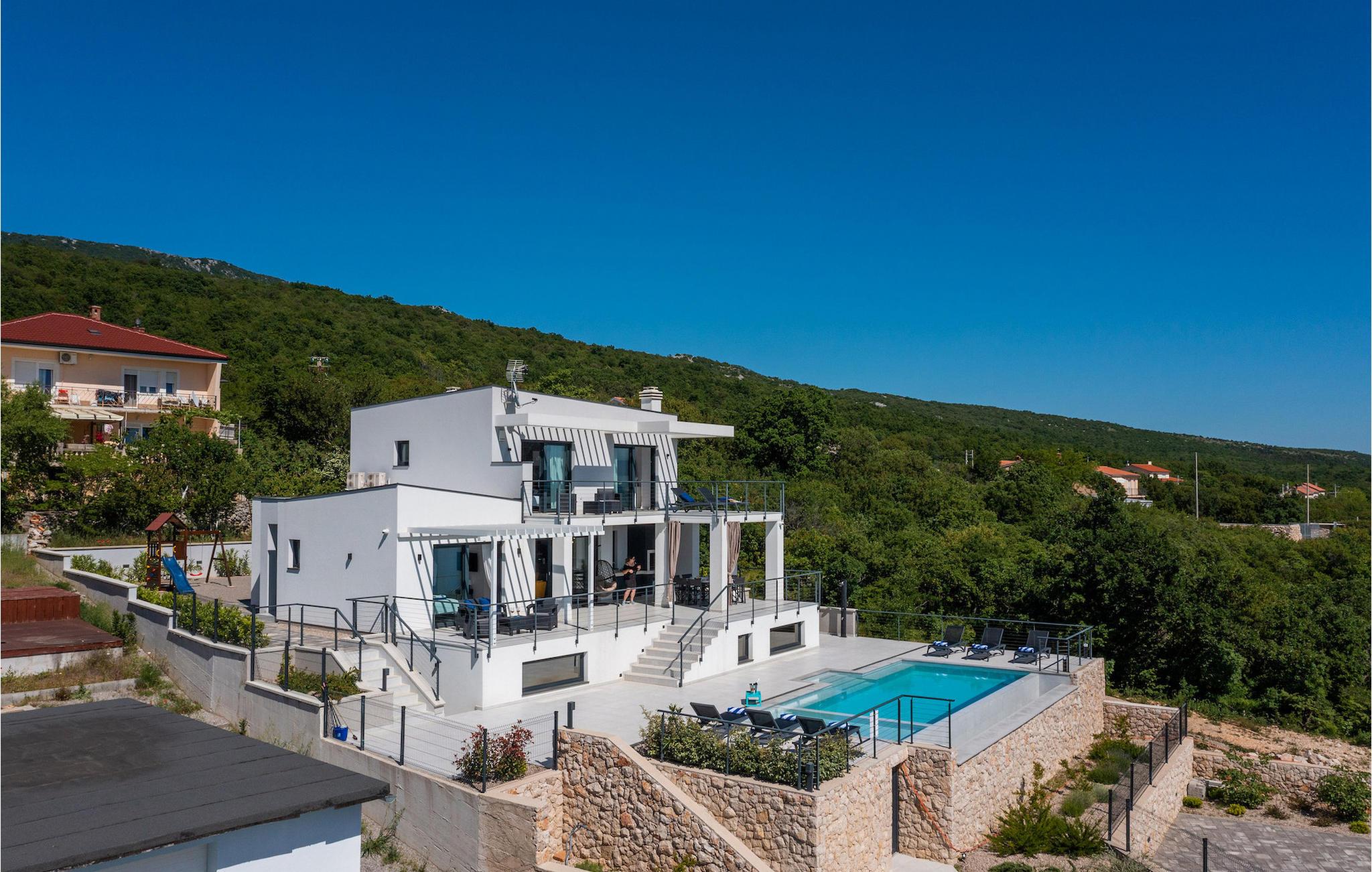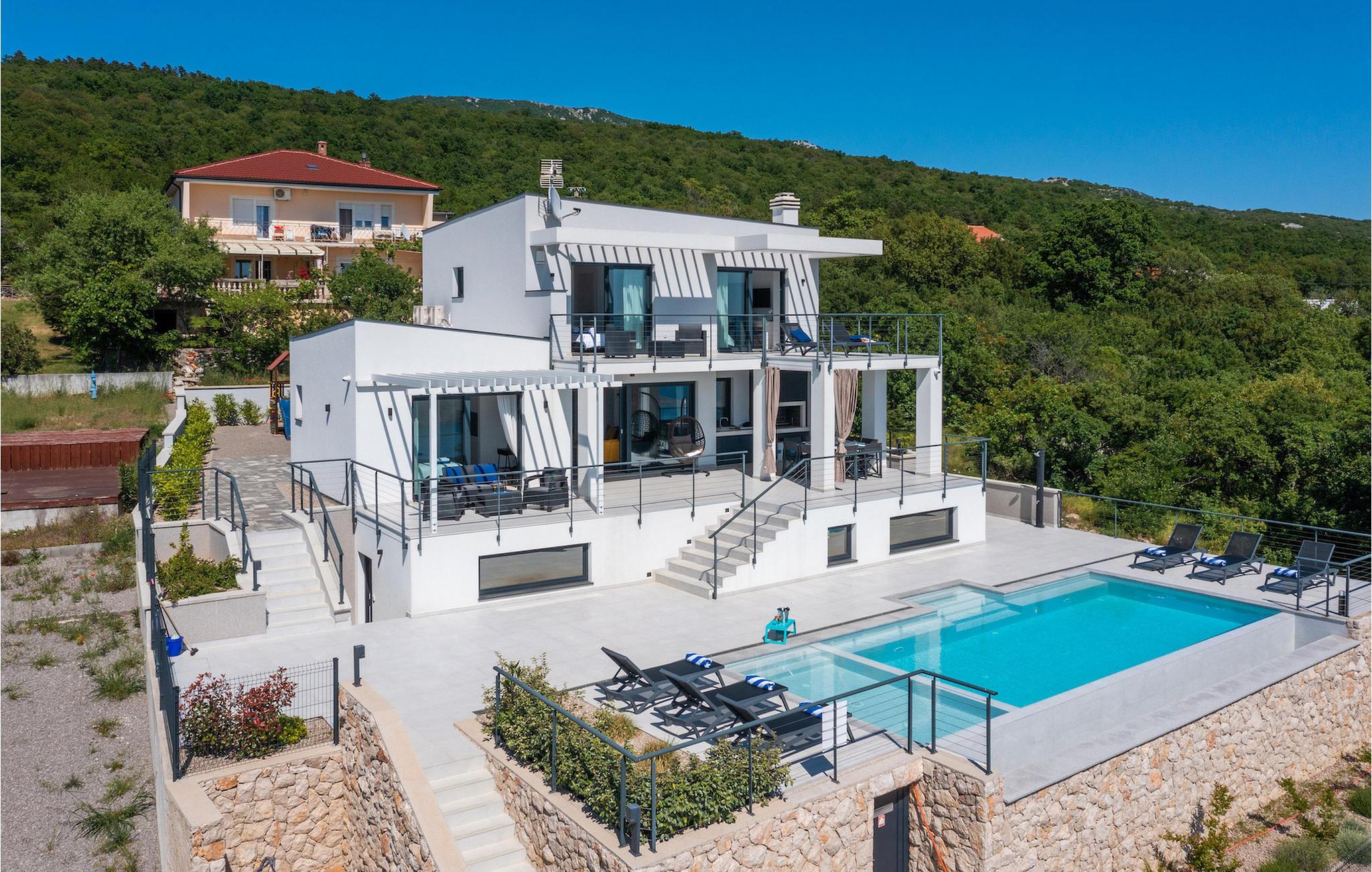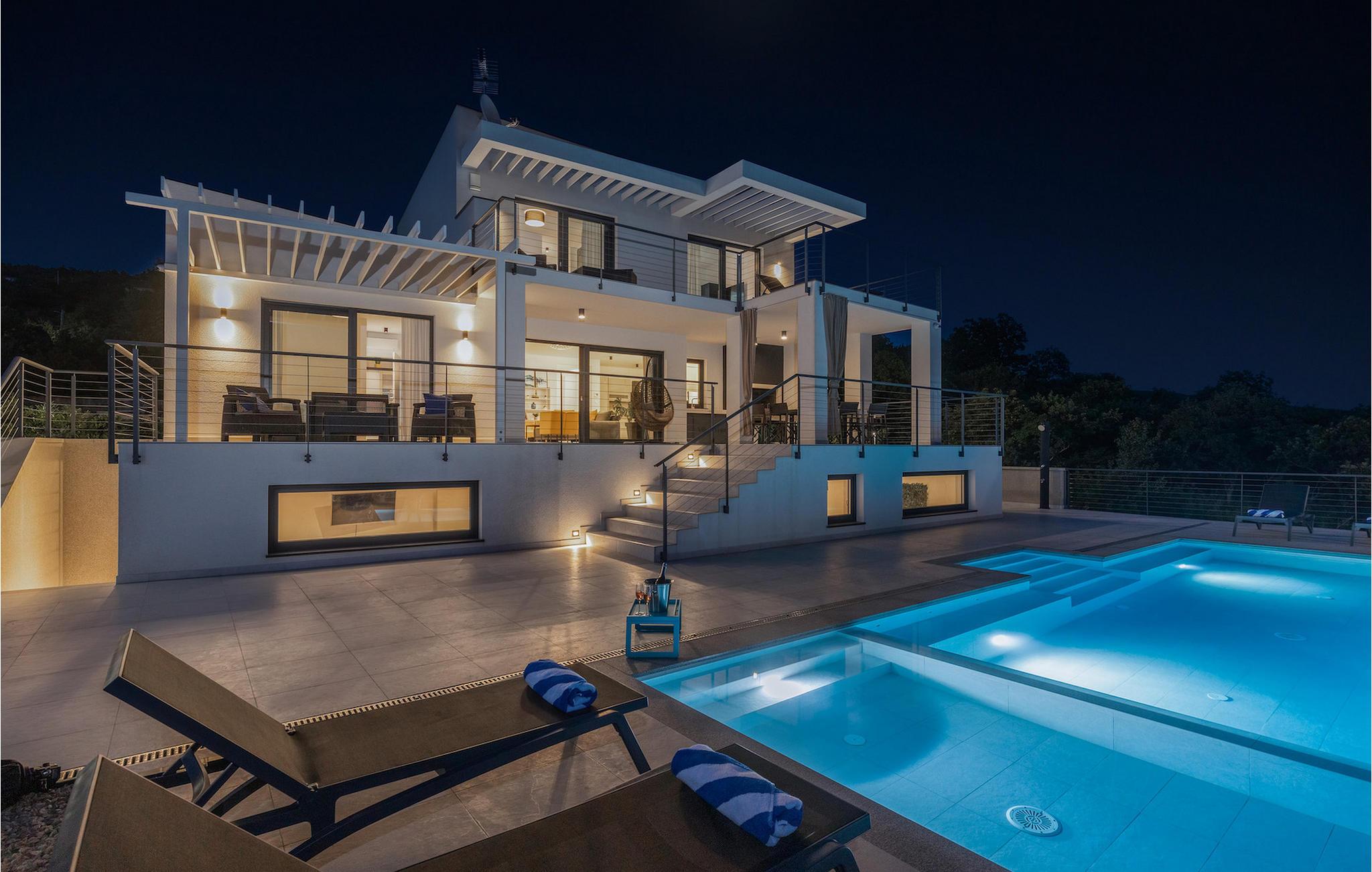 Hvis du leder efter en villa væk fra byens travlhed og tæt på havet, så er Villa Visum ideel for dig med sine mange ekstra faciliteter og beliggenhed. Du vil blive overrasket over panoramaudsigten, der omslutter hele villaen. Villaen er beliggende på en svag skråning, bestående af flere niveauer. Indgangen til ejendommen er placeret på forsiden, lavere niveau. Trappen fører dig op til det niveau, hvor poolen er, mens terrassen og husets stueetage er placeret i niveauet over. Villaen har tre soveværelser til seks gæster, med mulighed for at indkvartere en ekstra gæst i et af de tre soveværelser. Alle tre værelser er lyse og komfortable og har eget badeværelse, tv og aircondition. To værelser med dobbeltseng er placeret på første sal og har adgang til balkonen med en fantastisk udsigt over Kvarner bugten og øen Krk. Det tredje soveværelse ligger i stueetagen og har to enkeltsenge. En af sengene kan omdannes til en dobbeltseng efter anmodning og giver derfor mulighed for at rumme en ekstra gæst. Værelset har udgang til terrasse med panoramaudsigt. Stuen er også placeret i stueetagen, den har et tv og en elektrisk pejs, og er organiseret i et åbent rum koncept med et fuldt udstyret køkken og spiseplads. Hele rummet har aircondition. Den nederste etage byder på yderligere faciliteter, såsom et spillelokale med bordfodbold, dart og Playstation. På samme etage er der et fuldt udstyret fitnesscenter samt et wellness-område med sauna, hydromassagekar og bruser. Den indbydende pool er opdelt i to dele. Den mindre, lavvandede del, med sine 0,5 m dybde, er til vores yngre gæster. Den større del giver yderligere mulighed for afslapning med en indbygget bænk med massagedyser. Villaen byder også på en lille legeplads for børn med rutsjebane, klatrestativ og gynge. Ejendommen er fuldt indhegnet og har sin egen private parkeringsplads til 3 biler.