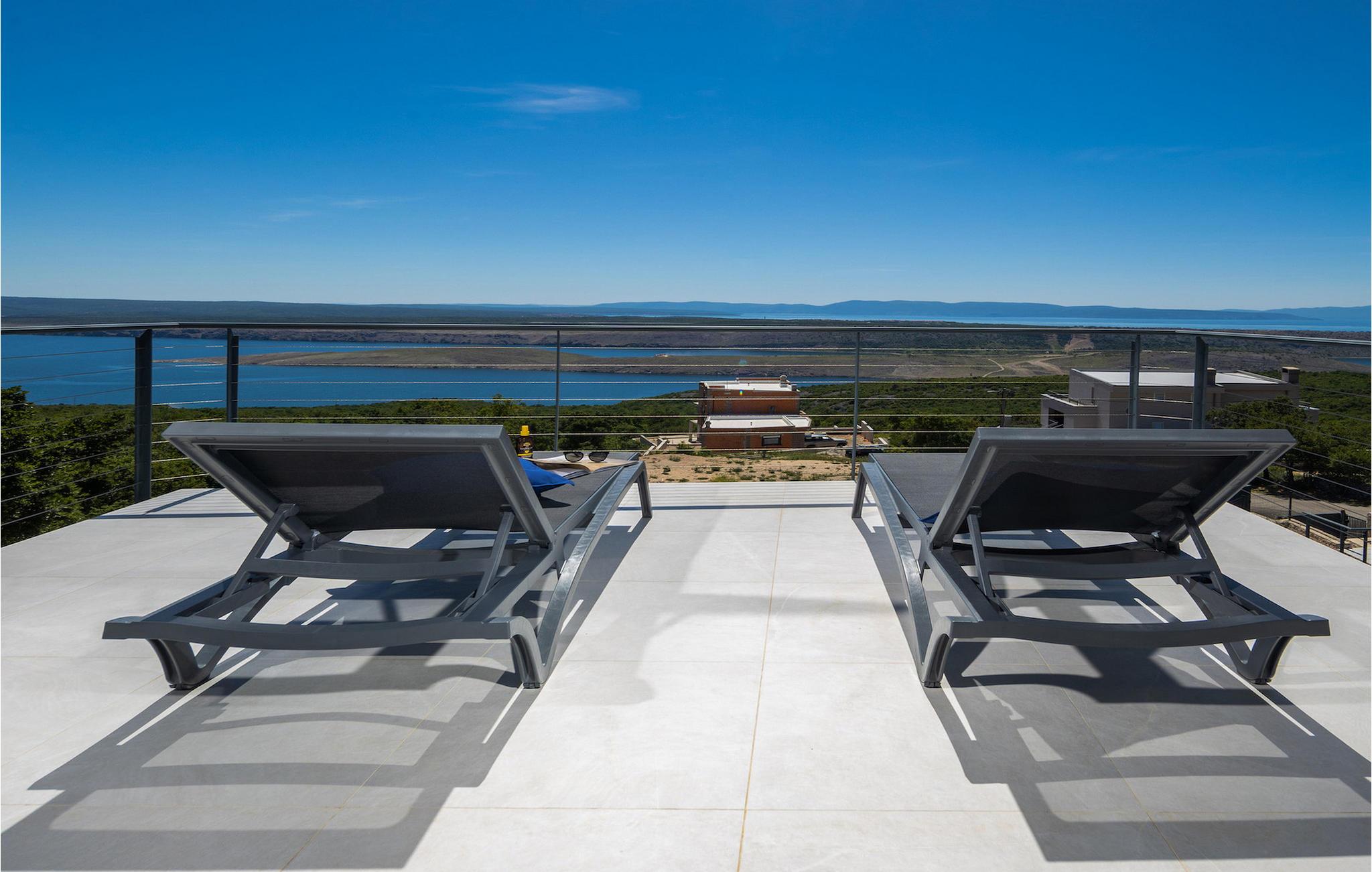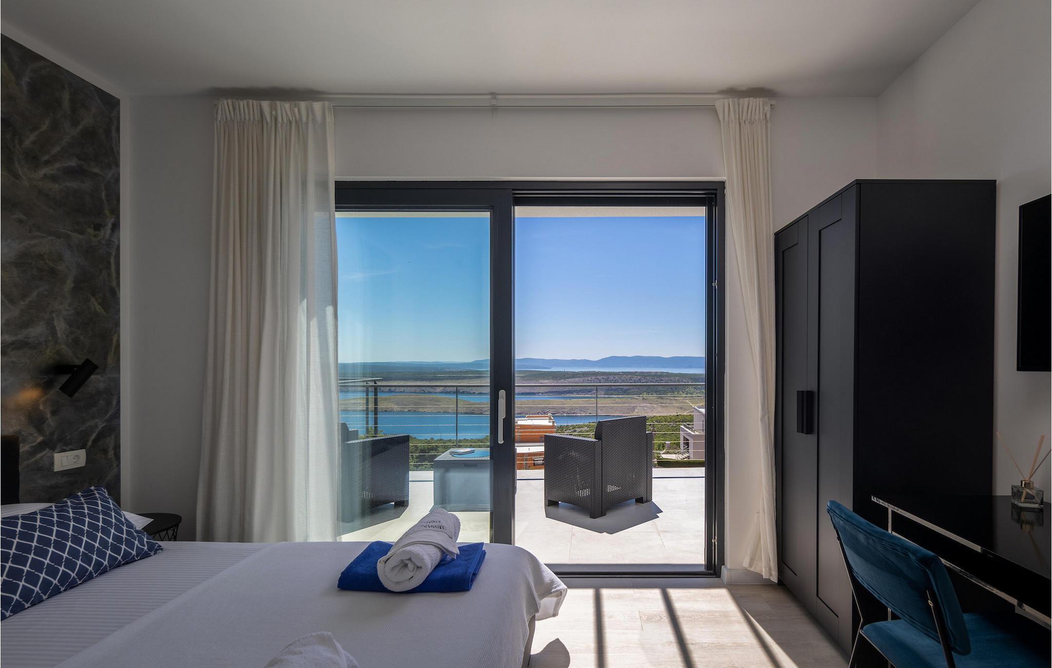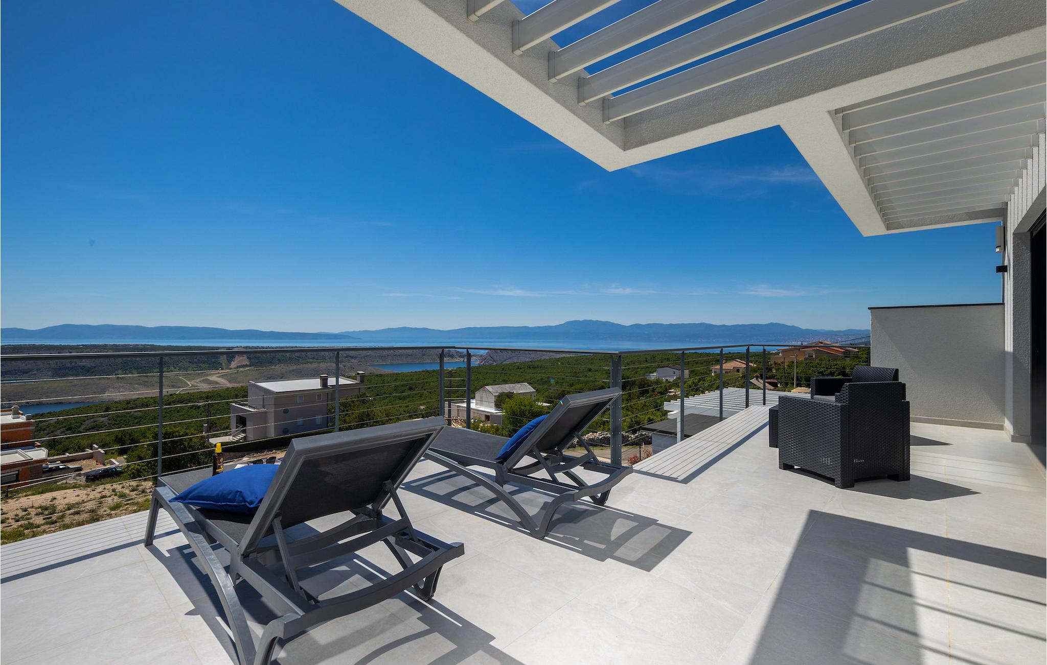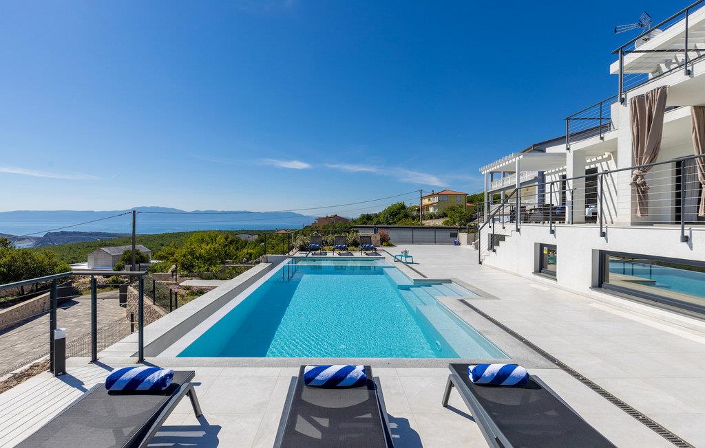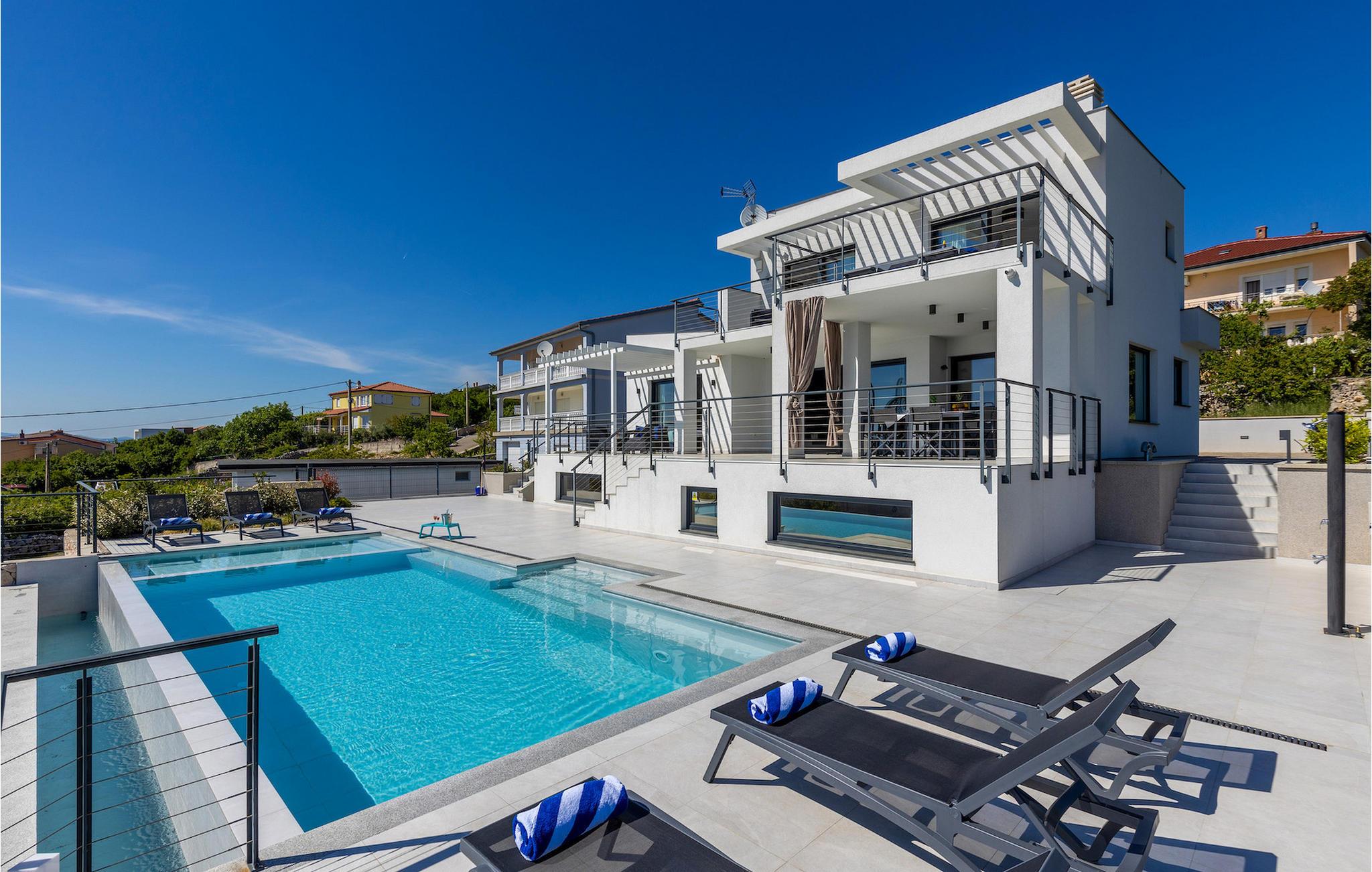 Hvis du leder efter en villa væk fra byens travlhed og tæt på havet, så er Villa Visum ideel for dig med sine mange ekstra faciliteter og beliggenhed. Du vil blive overrasket over panoramaudsigten, der omslutter hele villaen. Villaen er beliggende på en svag skråning, bestående af flere niveauer. Indgangen til ejendommen er placeret på forsiden, lavere niveau. Trappen fører dig op til det niveau, hvor poolen er, mens terrassen og husets stueetage er placeret i niveauet over. Villaen har tre soveværelser til seks gæster, med mulighed for at indkvartere en ekstra gæst i et af de tre soveværelser. Alle tre værelser er lyse og komfortable og har eget badeværelse, tv og aircondition. To værelser med dobbeltseng er placeret på første sal og har adgang til balkonen med en fantastisk udsigt over Kvarner bugten og øen Krk. Det tredje soveværelse ligger i stueetagen og har to enkeltsenge. En af sengene kan omdannes til en dobbeltseng efter anmodning og giver derfor mulighed for at rumme en ekstra gæst. Værelset har udgang til terrasse med panoramaudsigt. Stuen er også placeret i stueetagen, den har et tv og en elektrisk pejs, og er organiseret i et åbent rum koncept med et fuldt udstyret køkken og spiseplads. Hele rummet har aircondition. Den nederste etage byder på yderligere faciliteter, såsom et spillelokale med bordfodbold, dart og Playstation. På samme etage er der et fuldt udstyret fitnesscenter samt et wellness-område med sauna, hydromassagekar og bruser. Den indbydende pool er opdelt i to dele. Den mindre, lavvandede del, med sine 0,5 m dybde, er til vores yngre gæster. Den større del giver yderligere mulighed for afslapning med en indbygget bænk med massagedyser. Villaen byder også på en lille legeplads for børn med rutsjebane, klatrestativ og gynge. Ejendommen er fuldt indhegnet og har sin egen private parkeringsplads til 3 biler.