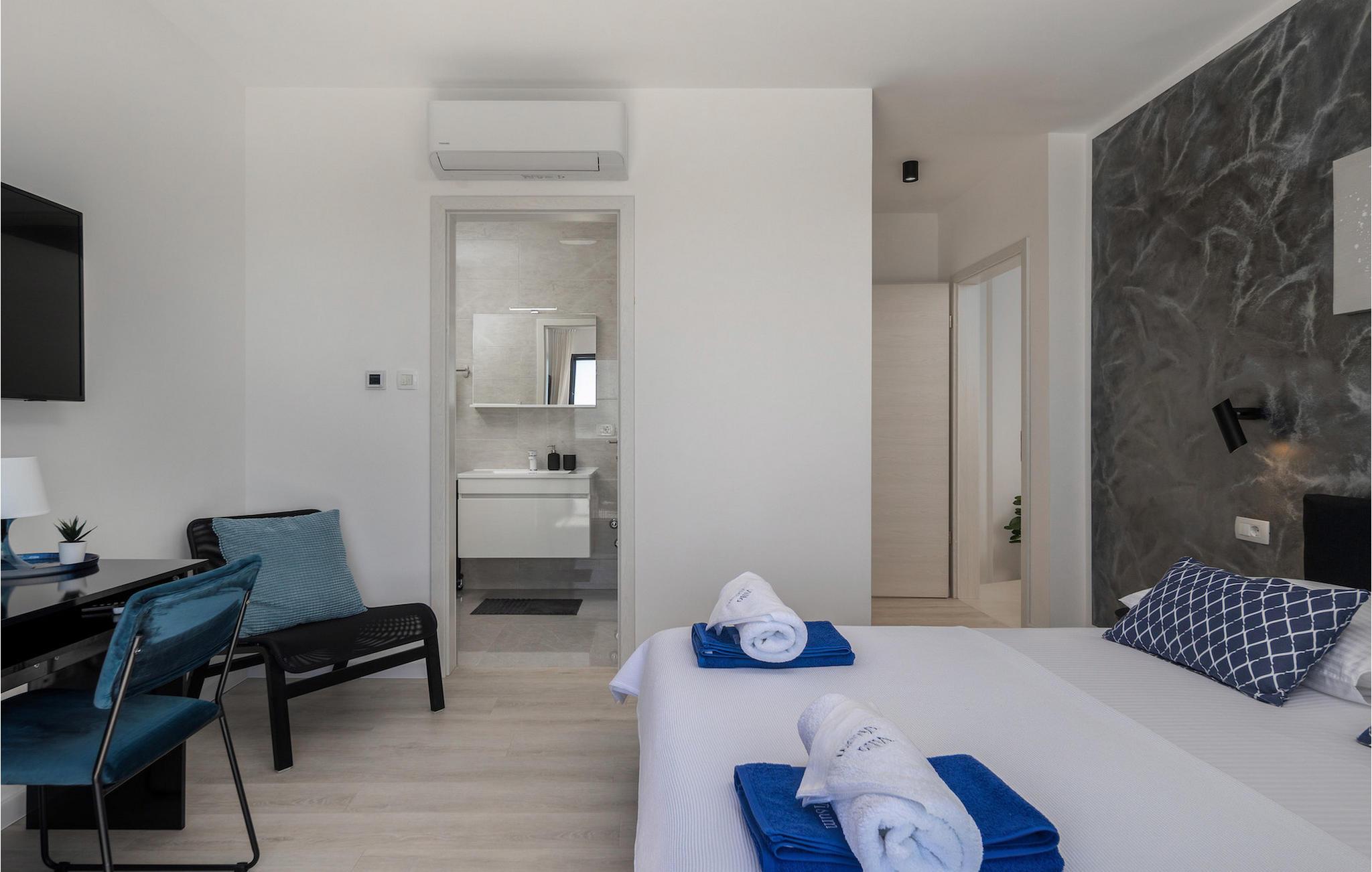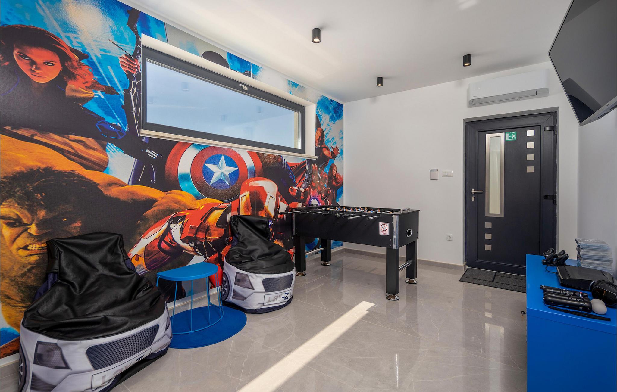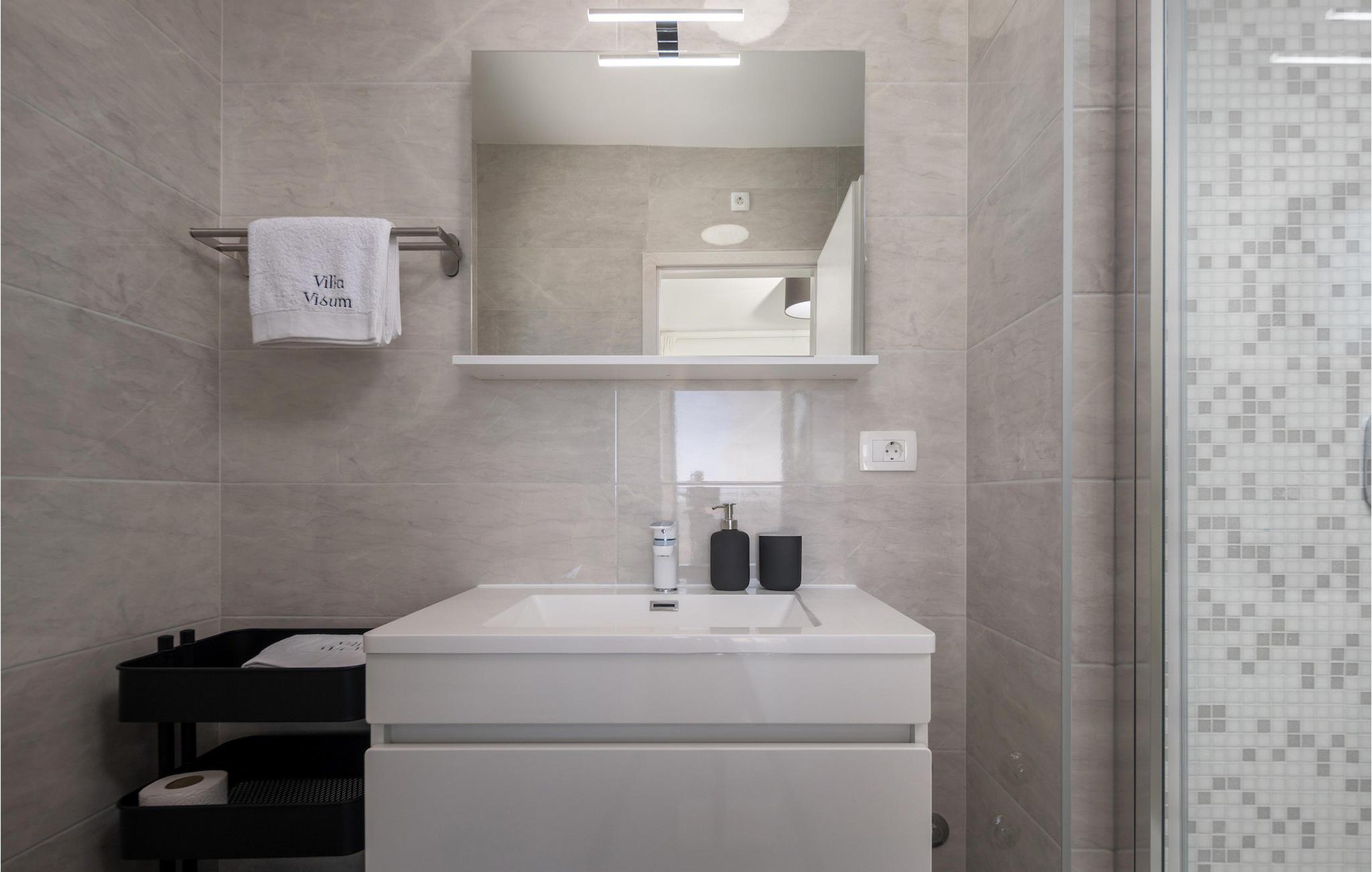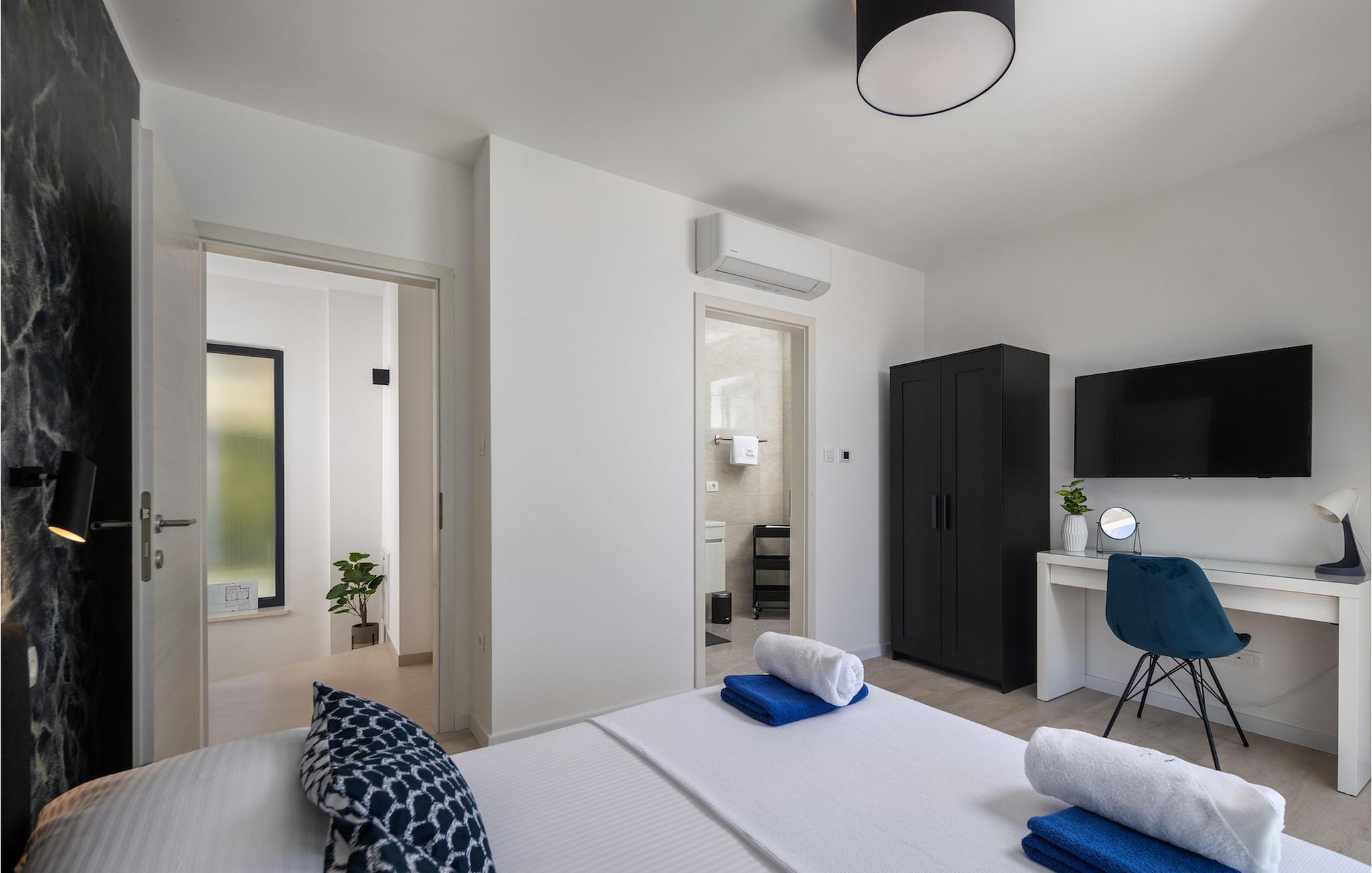 Hvis du leder efter en villa væk fra byens travlhed og tæt på havet, så er Villa Visum ideel for dig med sine mange ekstra faciliteter og beliggenhed. Du vil blive overrasket over panoramaudsigten, der omslutter hele villaen. Villaen er beliggende på en svag skråning, bestående af flere niveauer. Indgangen til ejendommen er placeret på forsiden, lavere niveau. Trappen fører dig op til det niveau, hvor poolen er, mens terrassen og husets stueetage er placeret i niveauet over. Villaen har tre soveværelser til seks gæster, med mulighed for at indkvartere en ekstra gæst i et af de tre soveværelser. Alle tre værelser er lyse og komfortable og har eget badeværelse, tv og aircondition. To værelser med dobbeltseng er placeret på første sal og har adgang til balkonen med en fantastisk udsigt over Kvarner bugten og øen Krk. Det tredje soveværelse ligger i stueetagen og har to enkeltsenge. En af sengene kan omdannes til en dobbeltseng efter anmodning og giver derfor mulighed for at rumme en ekstra gæst. Værelset har udgang til terrasse med panoramaudsigt. Stuen er også placeret i stueetagen, den har et tv og en elektrisk pejs, og er organiseret i et åbent rum koncept med et fuldt udstyret køkken og spiseplads. Hele rummet har aircondition. Den nederste etage byder på yderligere faciliteter, såsom et spillelokale med bordfodbold, dart og Playstation. På samme etage er der et fuldt udstyret fitnesscenter samt et wellness-område med sauna, hydromassagekar og bruser. Den indbydende pool er opdelt i to dele. Den mindre, lavvandede del, med sine 0,5 m dybde, er til vores yngre gæster. Den større del giver yderligere mulighed for afslapning med en indbygget bænk med massagedyser. Villaen byder også på en lille legeplads for børn med rutsjebane, klatrestativ og gynge. Ejendommen er fuldt indhegnet og har sin egen private parkeringsplads til 3 biler.