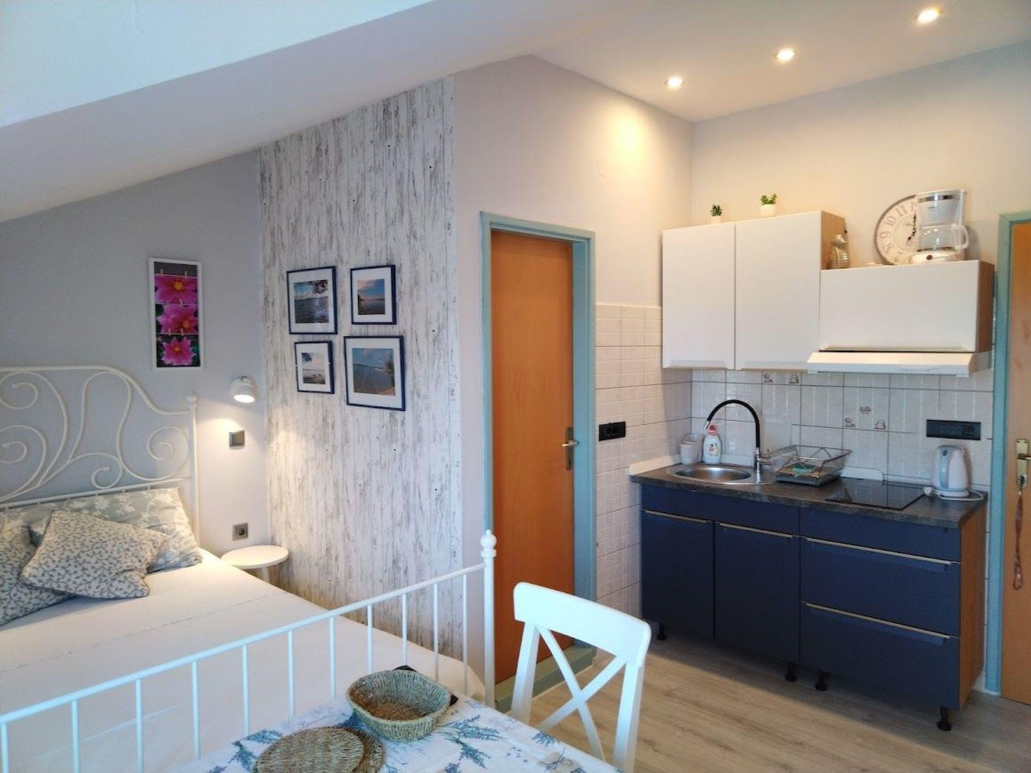 This fully-equipped studio is on the first floor and can accommodate two people. It has a combined living and sleeping room with a double bed and a dining space with a table and chairs. The kitchen is small, with two hotplates and a fridge. The bathroom has a shower.