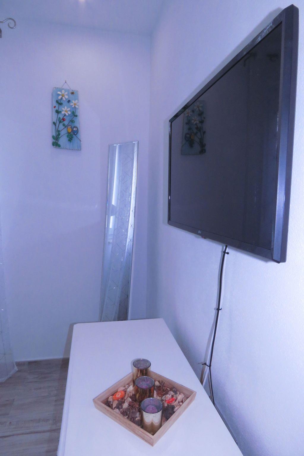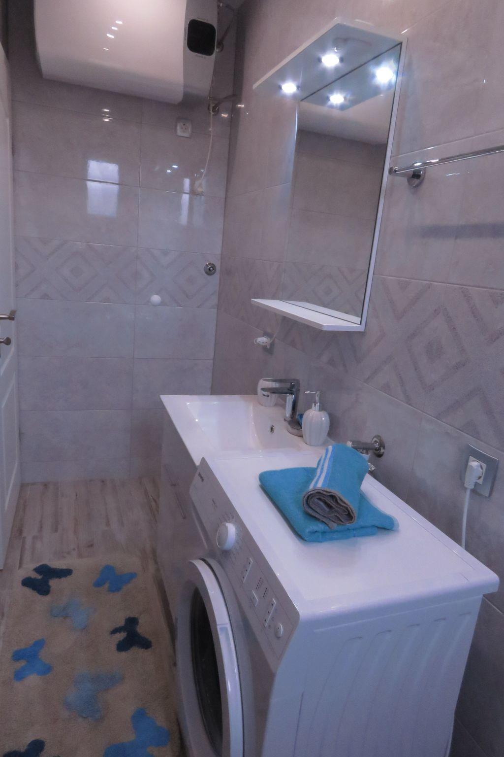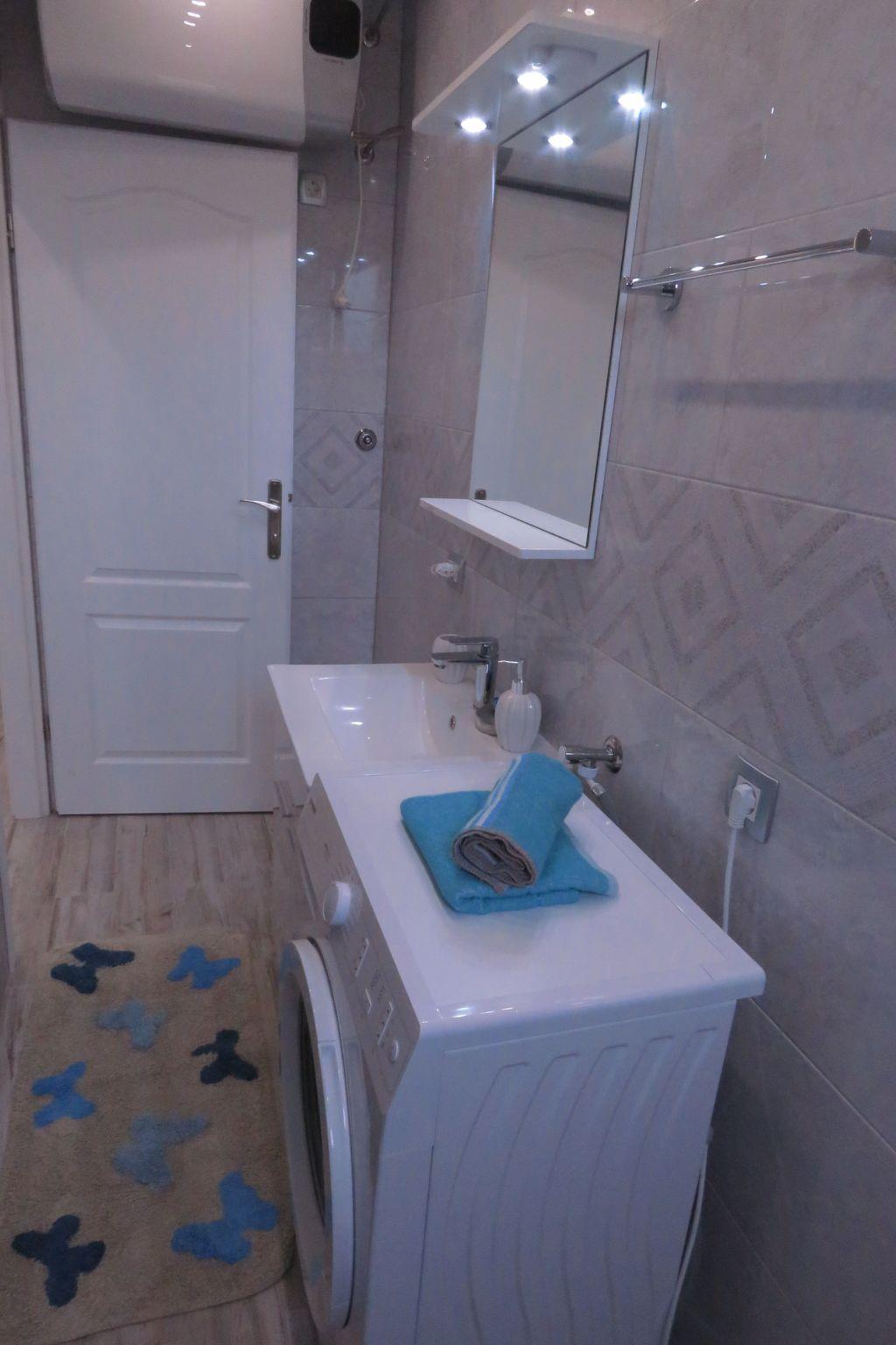 The kitchen is equipped with stove, oven, kettle, fridge and coffee machine. Dining table has 4 chairs. There is a sofa in the living area that can be transformed into bed (1,60 x 2m). The bedroom is equipped with a double bed (1,6 x 2m), two cabinets, a commode, tv/sat and a closet. The bathroom has a toilet, basin, shower and washing machine. Also there is a terrace in front of the apartment with chairs and a table where you can spend your summer nights. On request, we can offer you a baby cot. All in all, you have your peace and quietness.