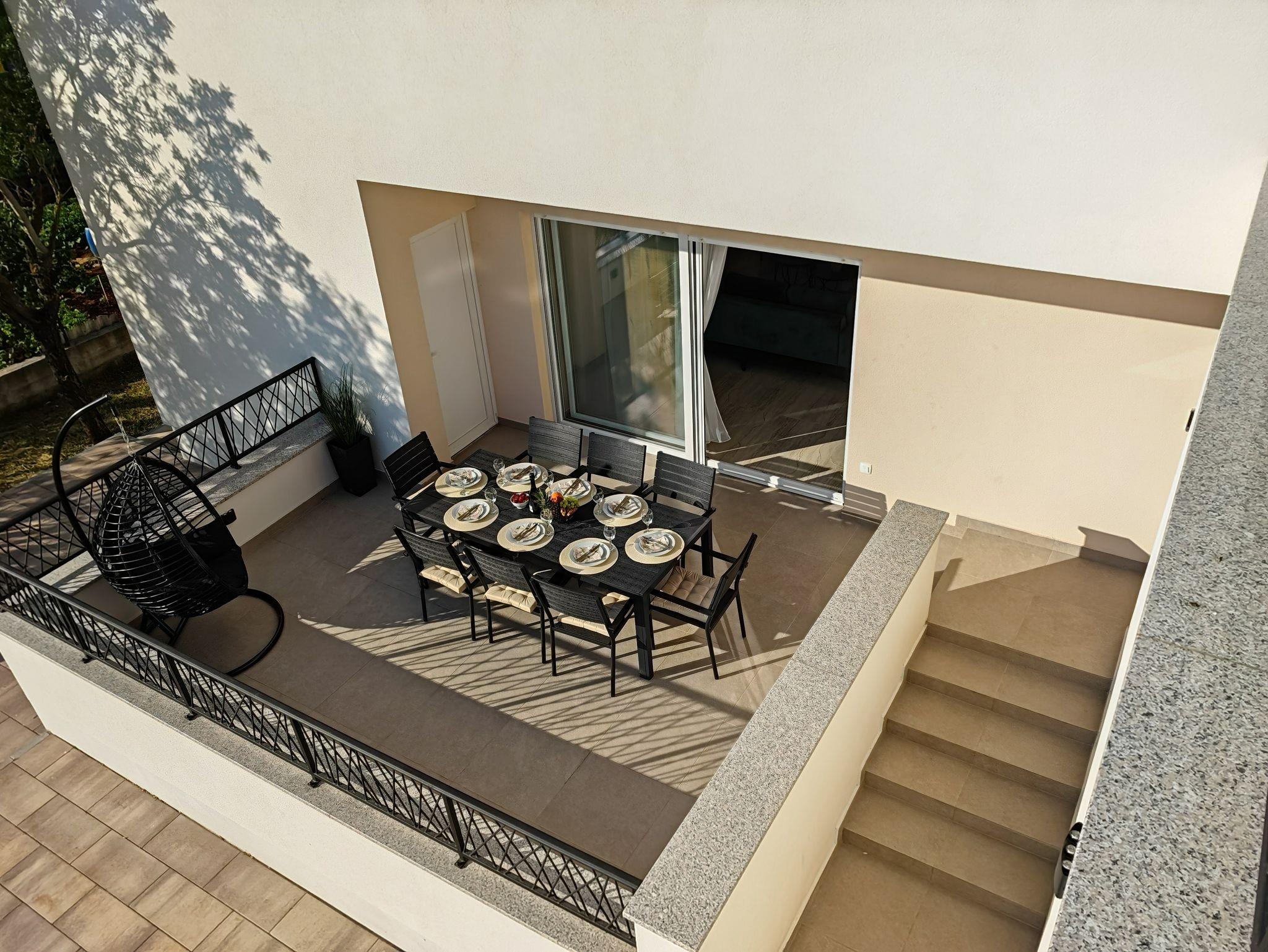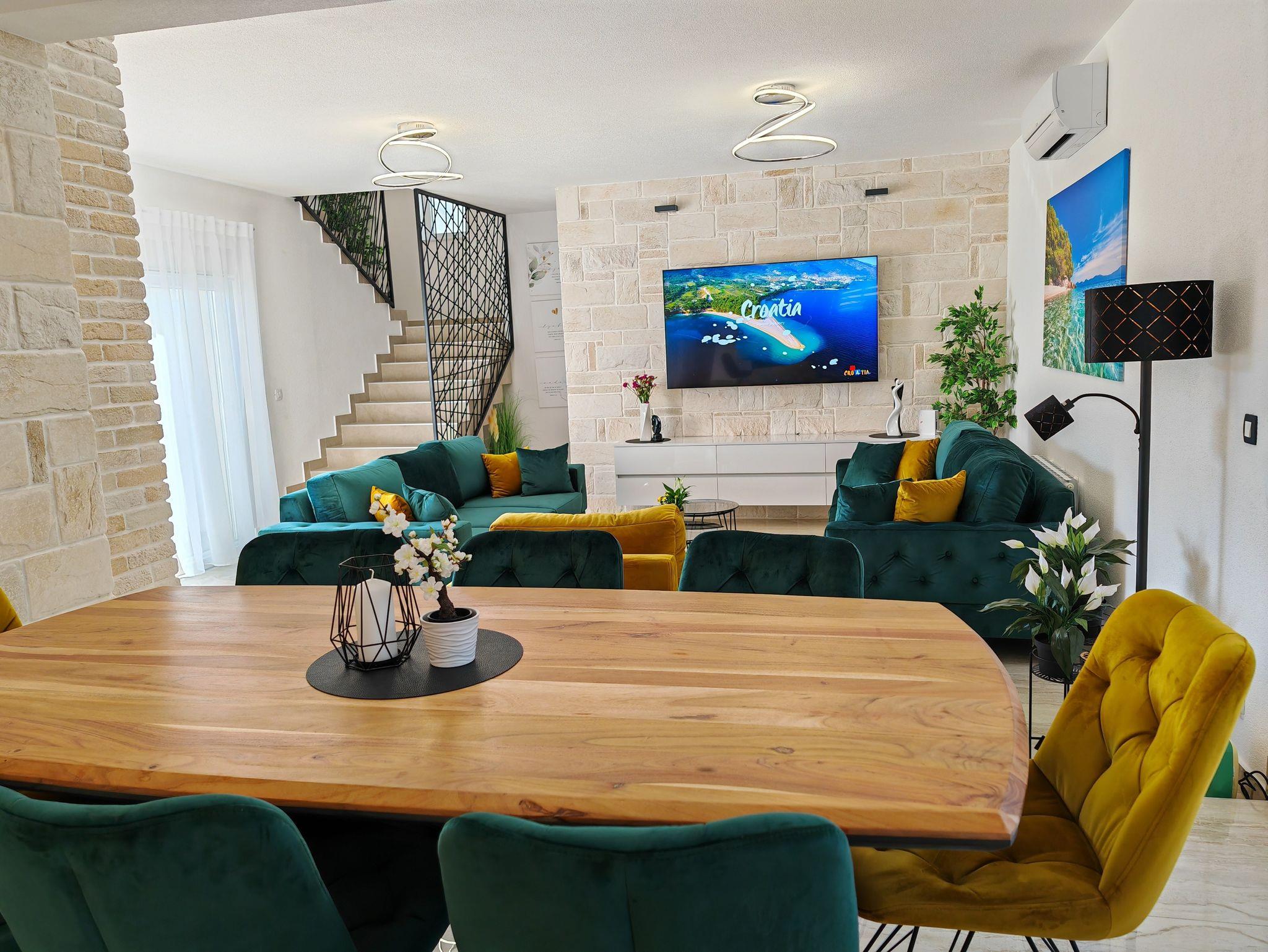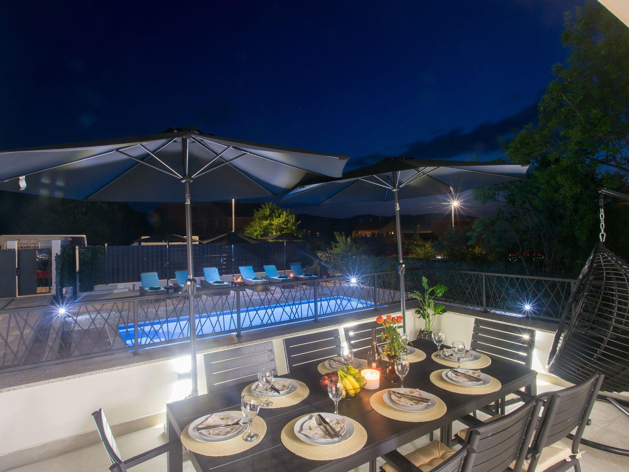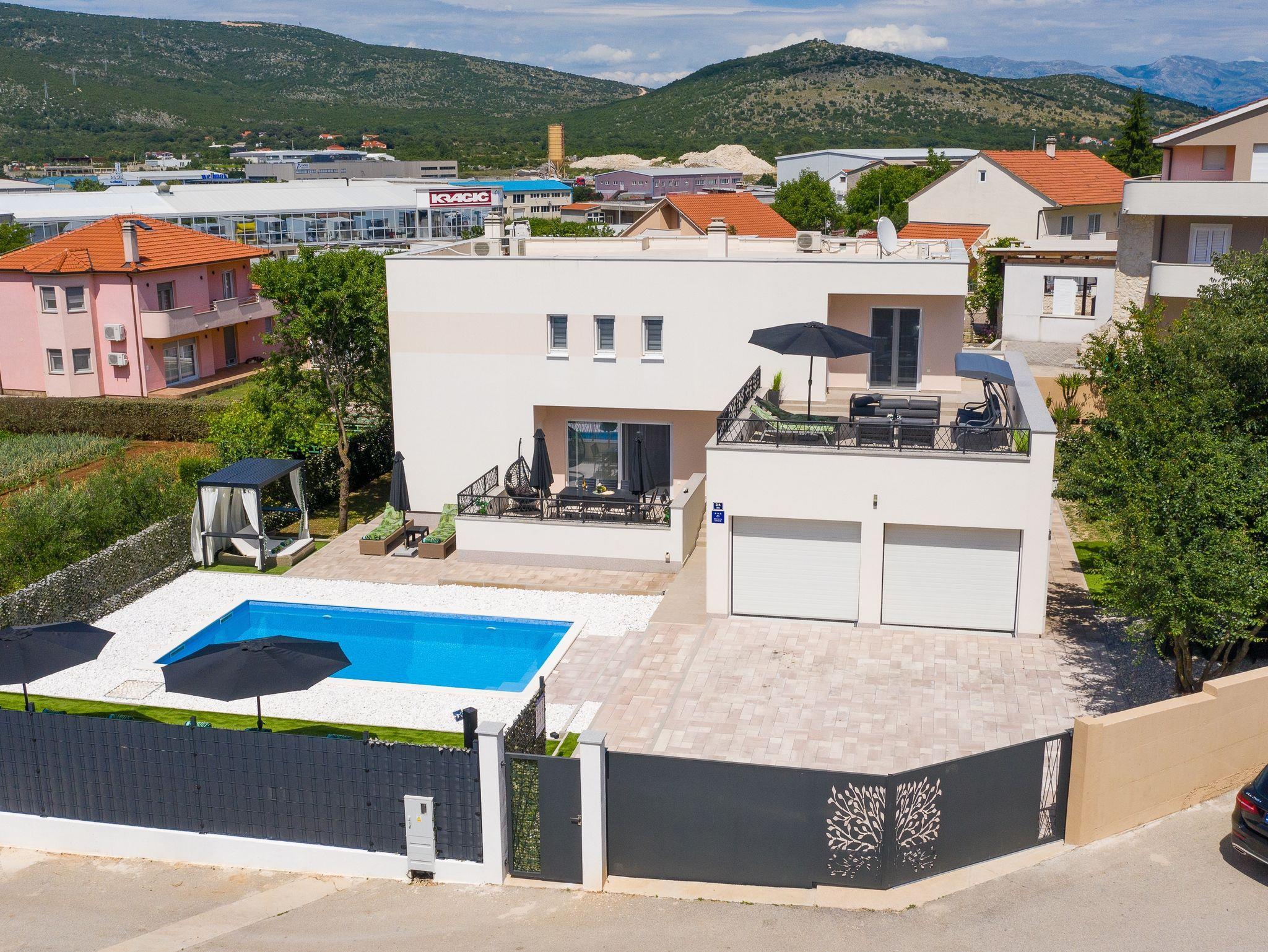 Haus bietet Platz für 10 Gäste. Die Betten sind in Schlafzimmern, die es 5 gibt, und in Wohnzimmer, innerhalb einer Gesamtfläche von 170m2, angeordnet. Die Gäste haben eine eigene Terrasse zur Verfügung, auf der sie in warmen Sommernächten genießen können. Für vollen Genuss und Entspannung gibt es einen privaten Grill für Gäste dieser Unterkunft. Während ihres Aufenthalts können sich Gäste im privaten Schwimmbad entspannen. IM PREIS INBEGRIFFEN: Kurtaxe, Endreinigung, Klimatisierung, Pool, Parkplatz, Garage, Internet, Kinderbett, Bügeleisen, Bügelbrett, Föhn. Die Verfügbarkeit zusätzlicher Dienstleistungen in Ihrem reservierten Termin und die Preise derselben (falls nicht aufgeführt) müssen im Voraus überprüft werden. Zusätzliche Dienstleistungen die in der Zahlungsaufforderung nicht aufgeführt sind werden direkt beim Vermieter bezahlt, angenommen der Gast nutzt auch diese. Ermäßigung auf den Grundpreis: Gratistag 14=13 (bei einem Aufenthalt von 14 Tagen oder mehr erhalten Sie einen Gratistag für den Aufenthalt bis 31.12.26).