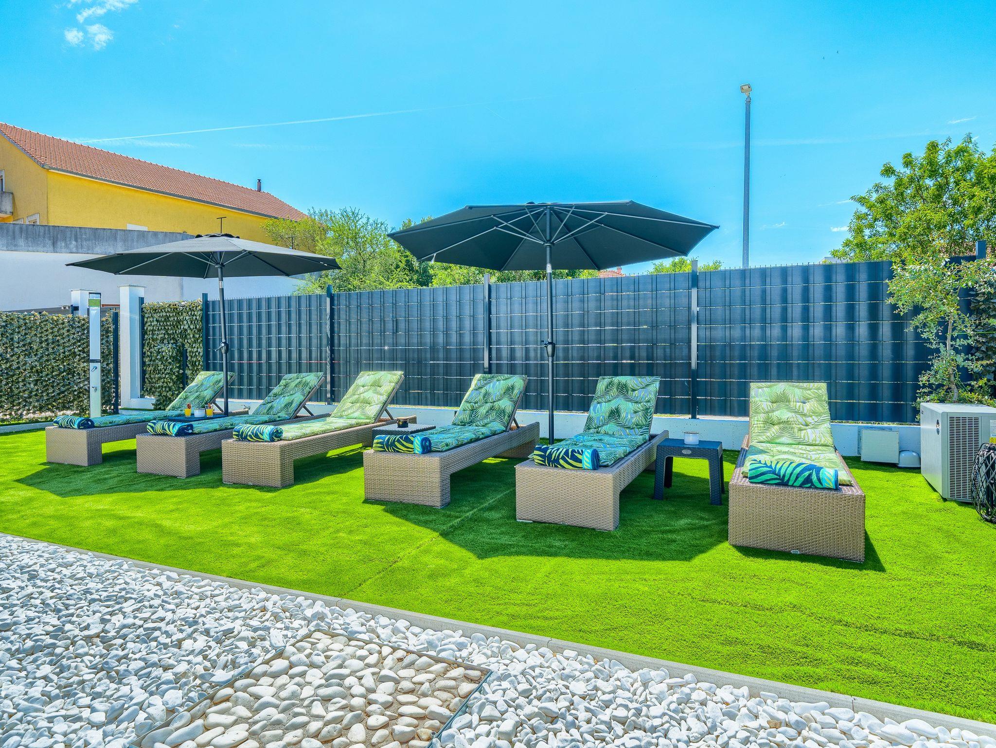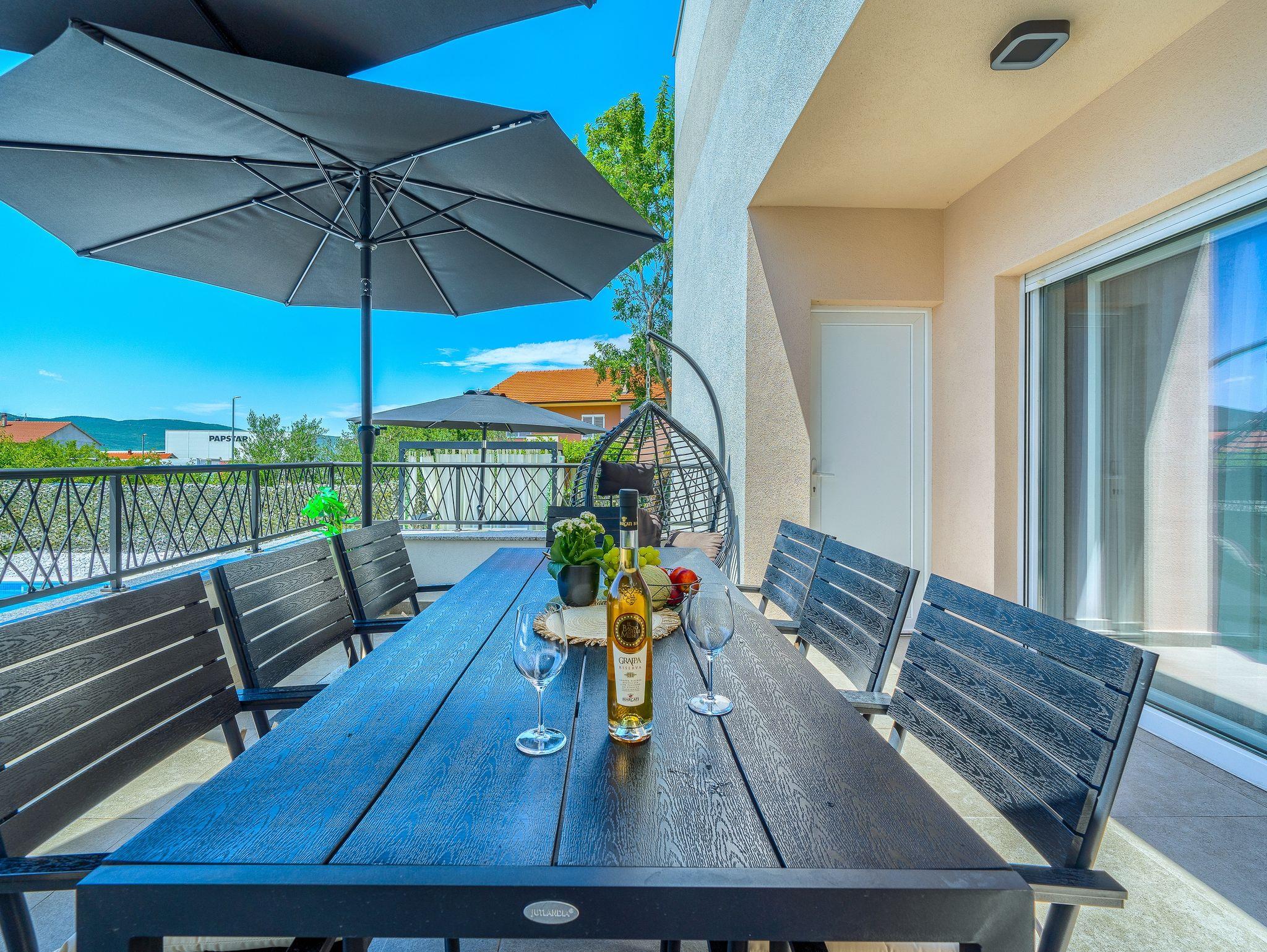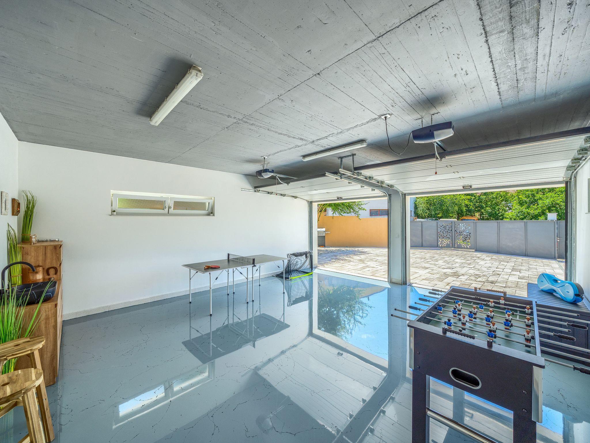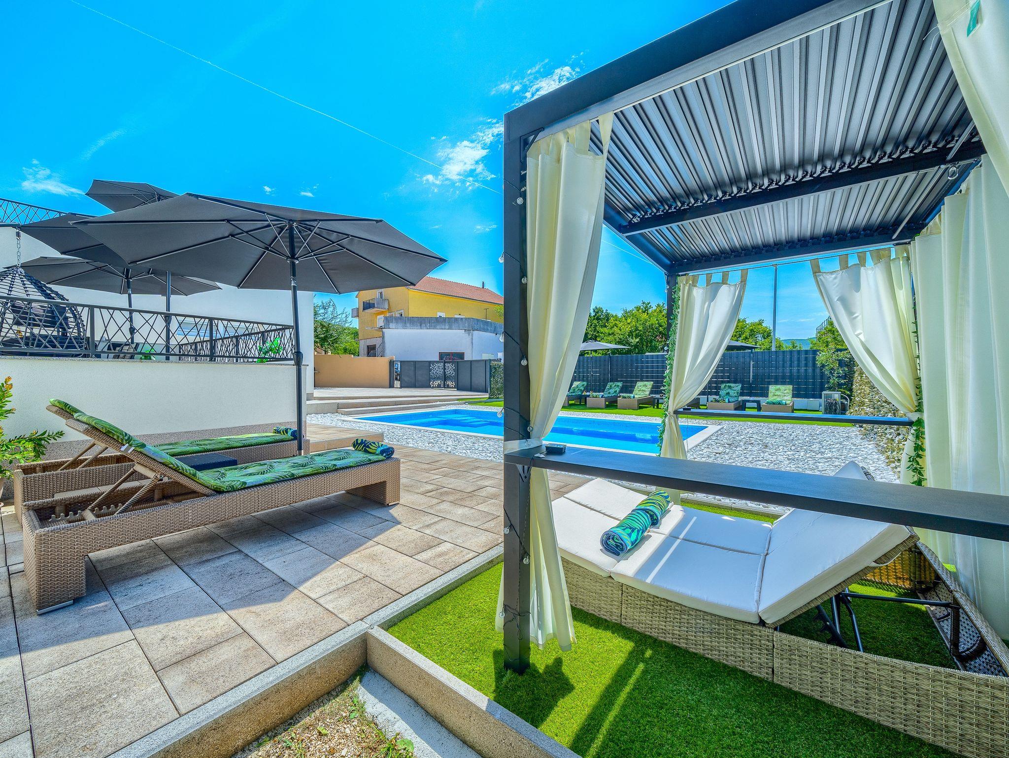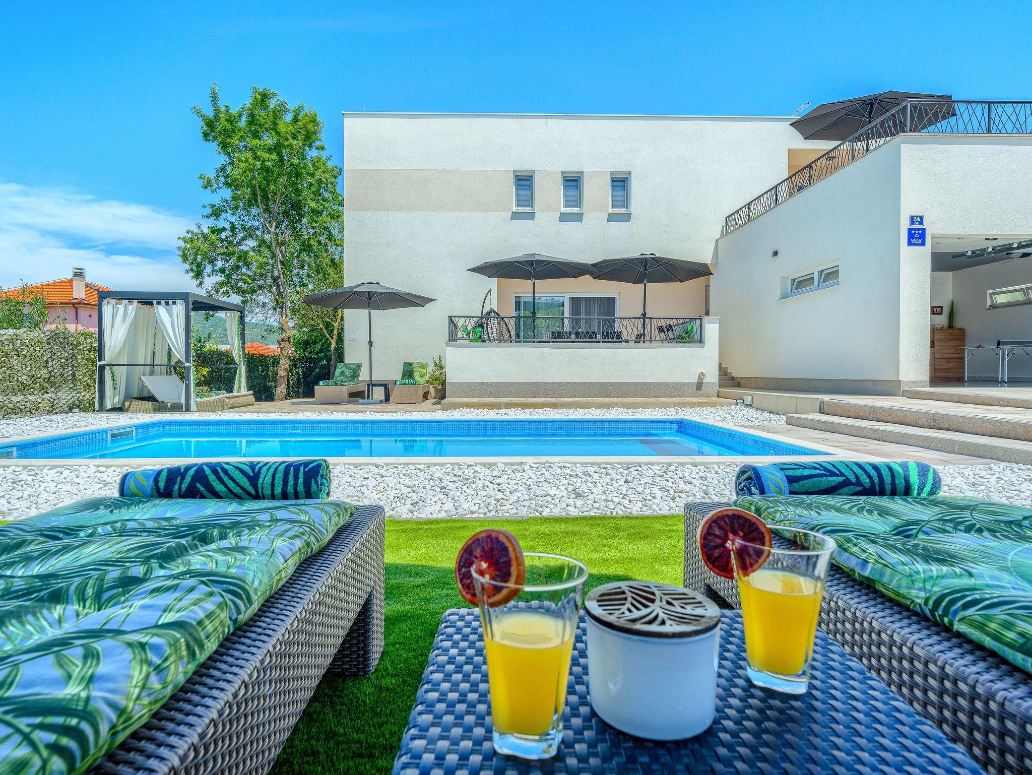Haus bietet Platz für 10 Gäste. Die Betten sind in Schlafzimmern, die es 5 gibt, und in Wohnzimmer, innerhalb einer Gesamtfläche von 170m2, angeordnet. Die Gäste haben eine eigene Terrasse zur Verfügung, auf der sie in warmen Sommernächten genießen können. Für vollen Genuss und Entspannung gibt es einen privaten Grill für Gäste dieser Unterkunft. Während ihres Aufenthalts können sich Gäste im privaten Schwimmbad entspannen. IM PREIS INBEGRIFFEN: Kurtaxe, Endreinigung, Klimatisierung, Pool, Parkplatz, Garage, Internet, Kinderbett, Bügeleisen, Bügelbrett, Föhn. Die Verfügbarkeit zusätzlicher Dienstleistungen in Ihrem reservierten Termin und die Preise derselben (falls nicht aufgeführt) müssen im Voraus überprüft werden. Zusätzliche Dienstleistungen die in der Zahlungsaufforderung nicht aufgeführt sind werden direkt beim Vermieter bezahlt, angenommen der Gast nutzt auch diese. Ermäßigung auf den Grundpreis: Gratistag 14=13 (bei einem Aufenthalt von 14 Tagen oder mehr erhalten Sie einen Gratistag für den Aufenthalt bis 31.12.26).