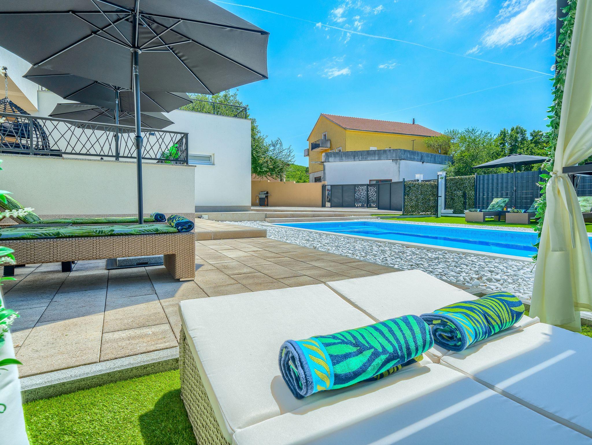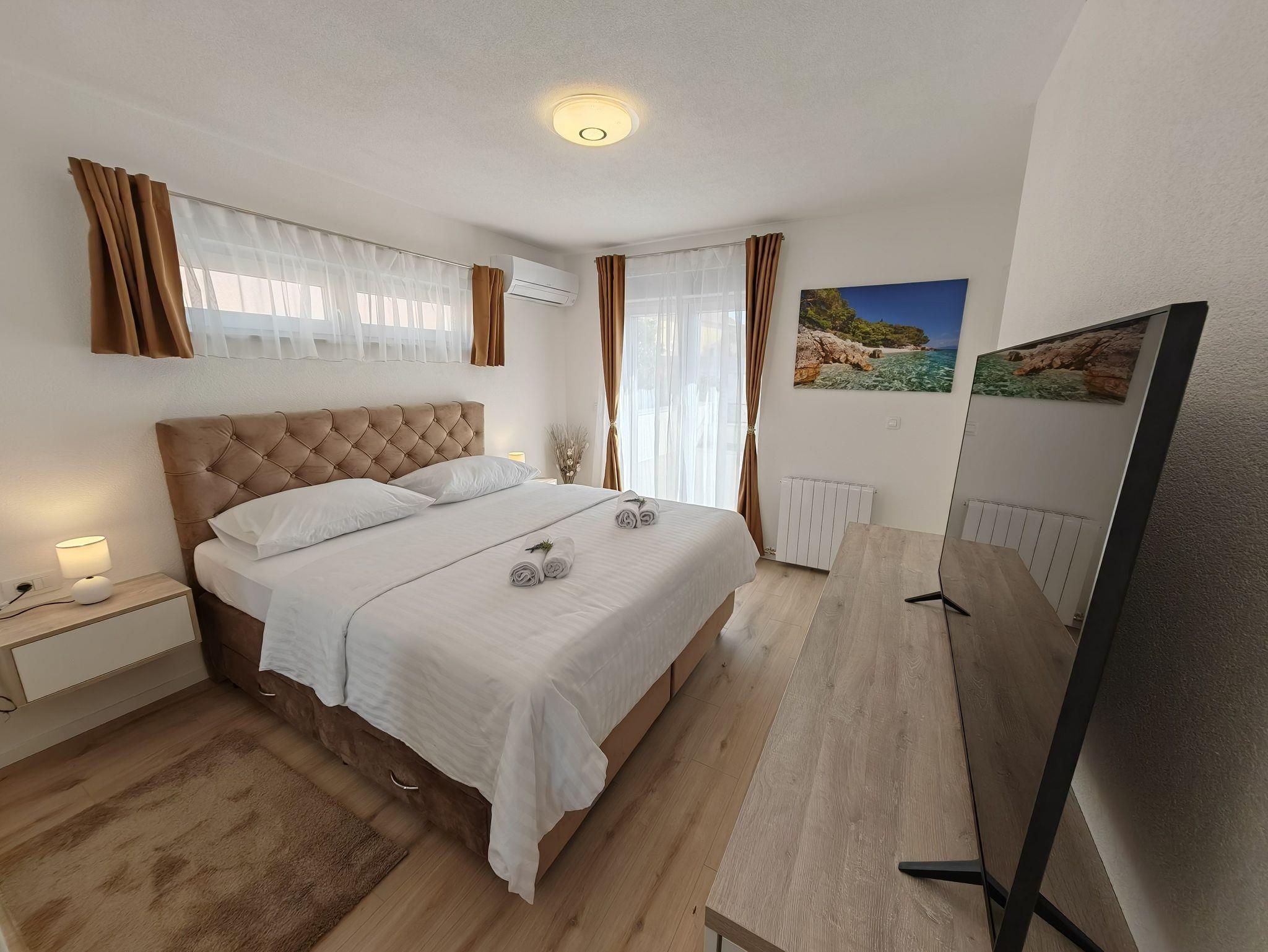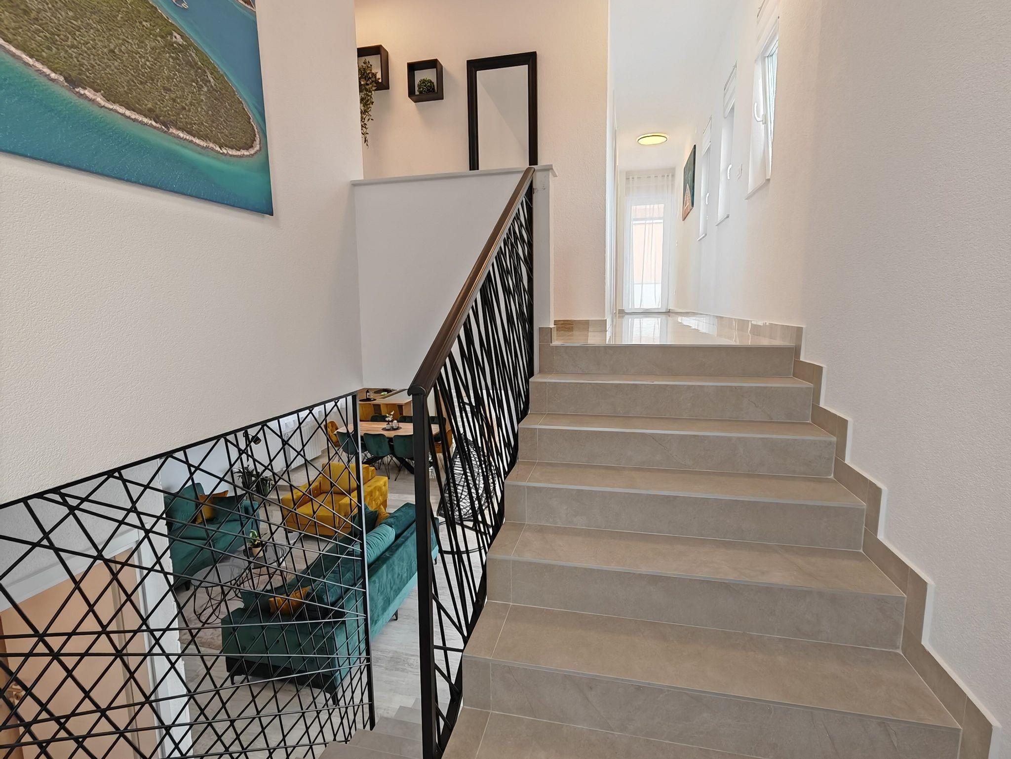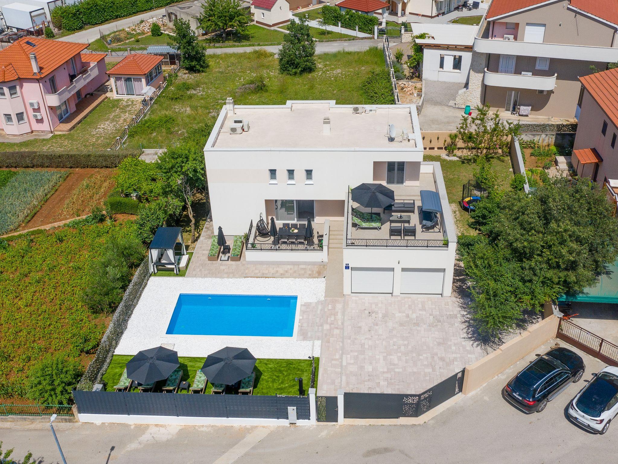 Haus bietet Platz für 10 Gäste. Die Betten sind in Schlafzimmern, die es 5 gibt, und in Wohnzimmer, innerhalb einer Gesamtfläche von 170m2, angeordnet. Die Gäste haben eine eigene Terrasse zur Verfügung, auf der sie in warmen Sommernächten genießen können. Für vollen Genuss und Entspannung gibt es einen privaten Grill für Gäste dieser Unterkunft. Während ihres Aufenthalts können sich Gäste im privaten Schwimmbad entspannen. IM PREIS INBEGRIFFEN: Kurtaxe, Endreinigung, Klimatisierung, Pool, Parkplatz, Garage, Internet, Kinderbett, Bügeleisen, Bügelbrett, Föhn. Die Verfügbarkeit zusätzlicher Dienstleistungen in Ihrem reservierten Termin und die Preise derselben (falls nicht aufgeführt) müssen im Voraus überprüft werden. Zusätzliche Dienstleistungen die in der Zahlungsaufforderung nicht aufgeführt sind werden direkt beim Vermieter bezahlt, angenommen der Gast nutzt auch diese. Ermäßigung auf den Grundpreis: Gratistag 14=13 (bei einem Aufenthalt von 14 Tagen oder mehr erhalten Sie einen Gratistag für den Aufenthalt bis 31.12.26).