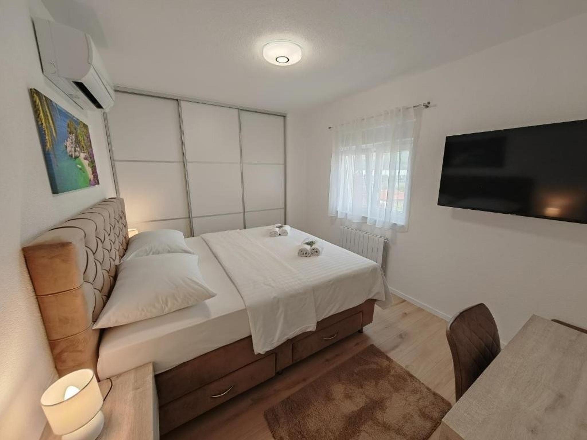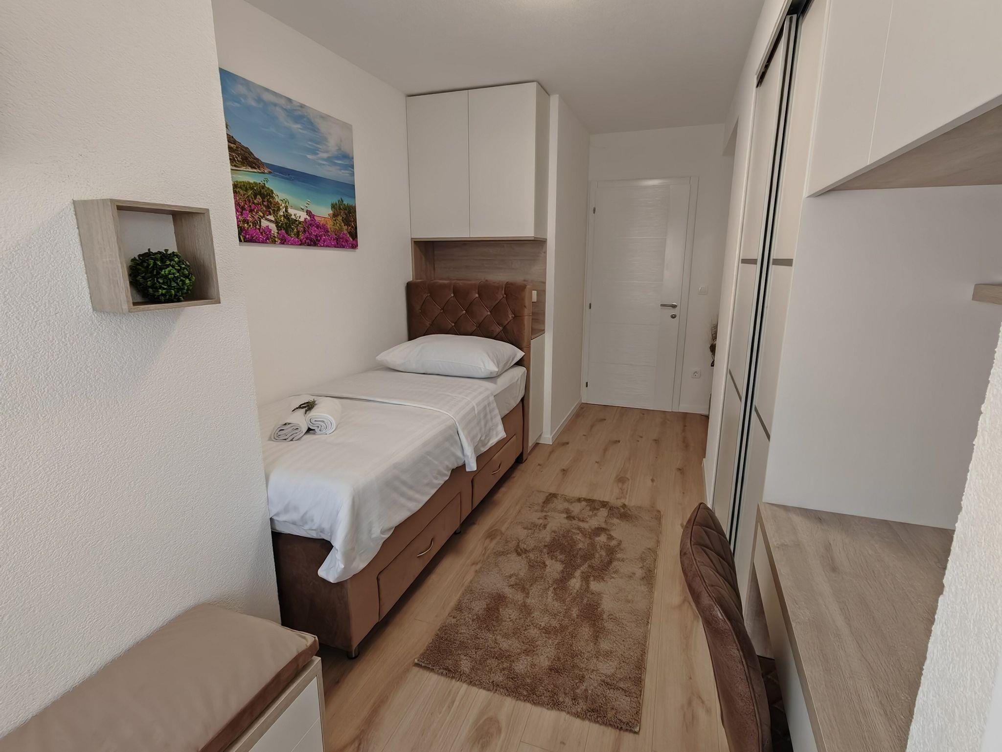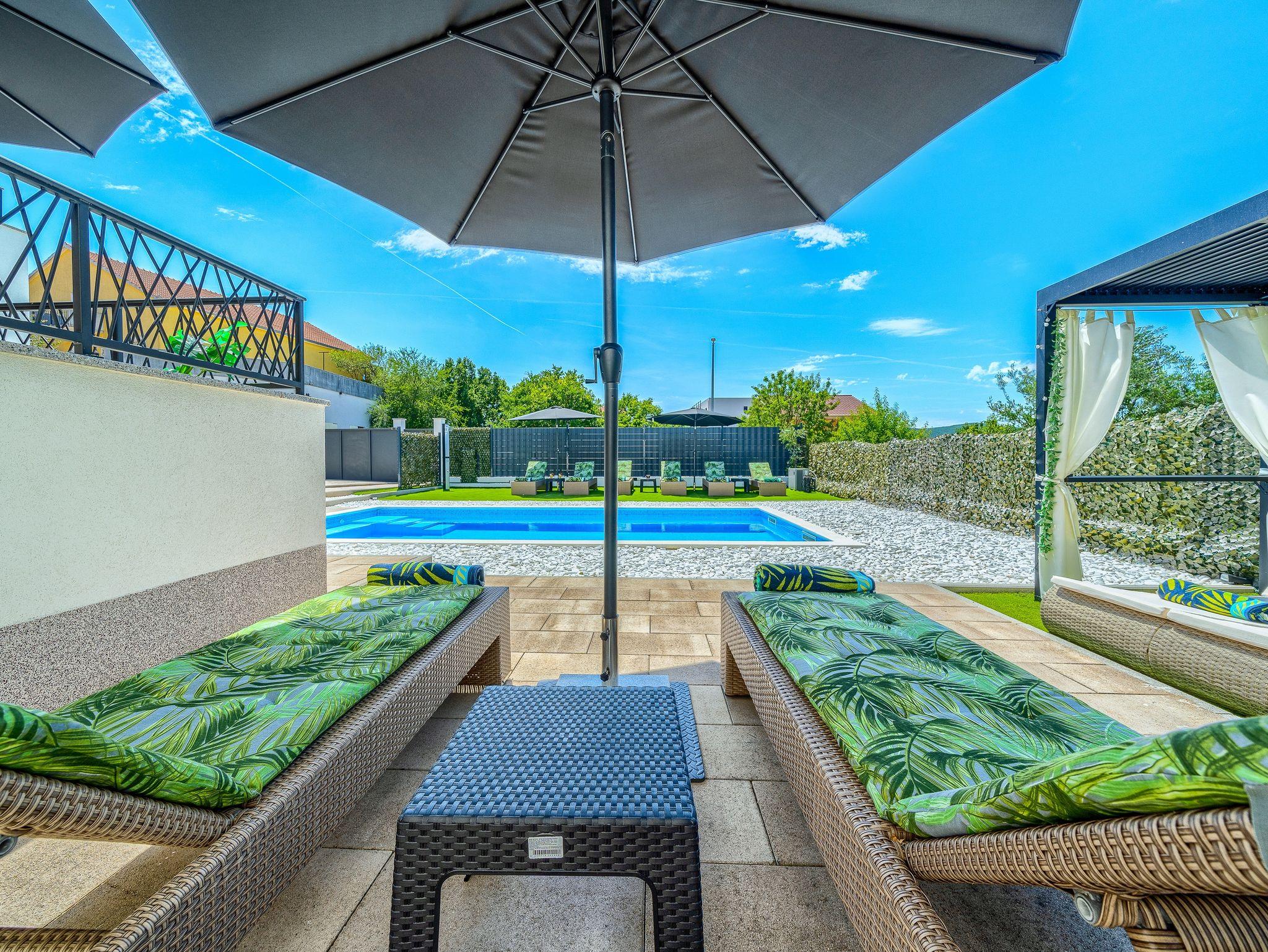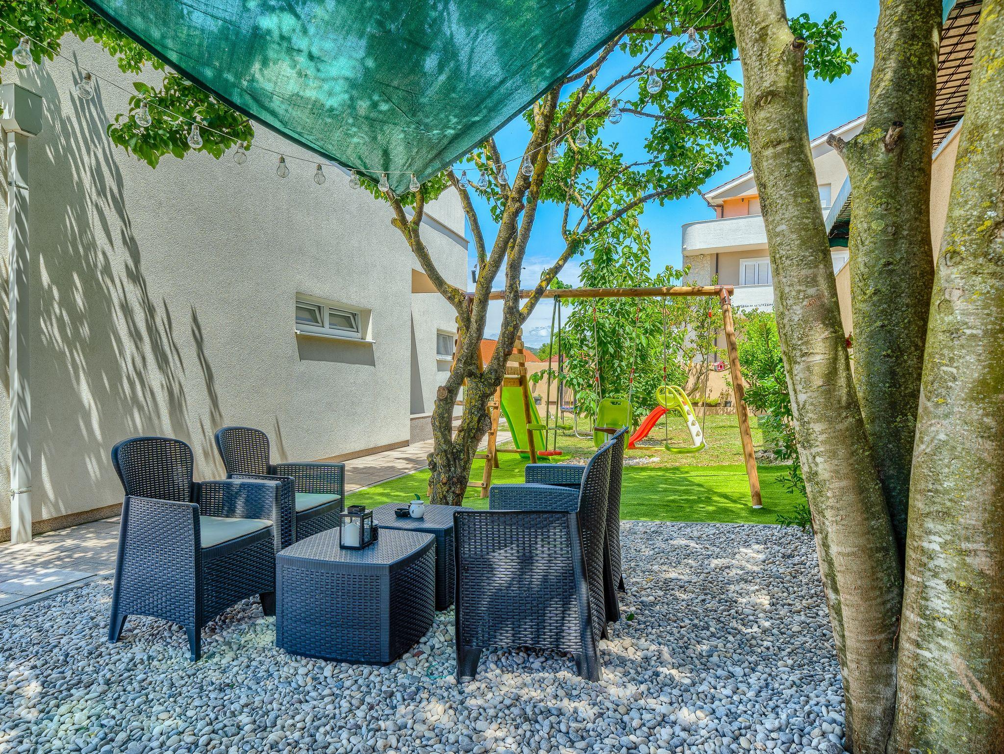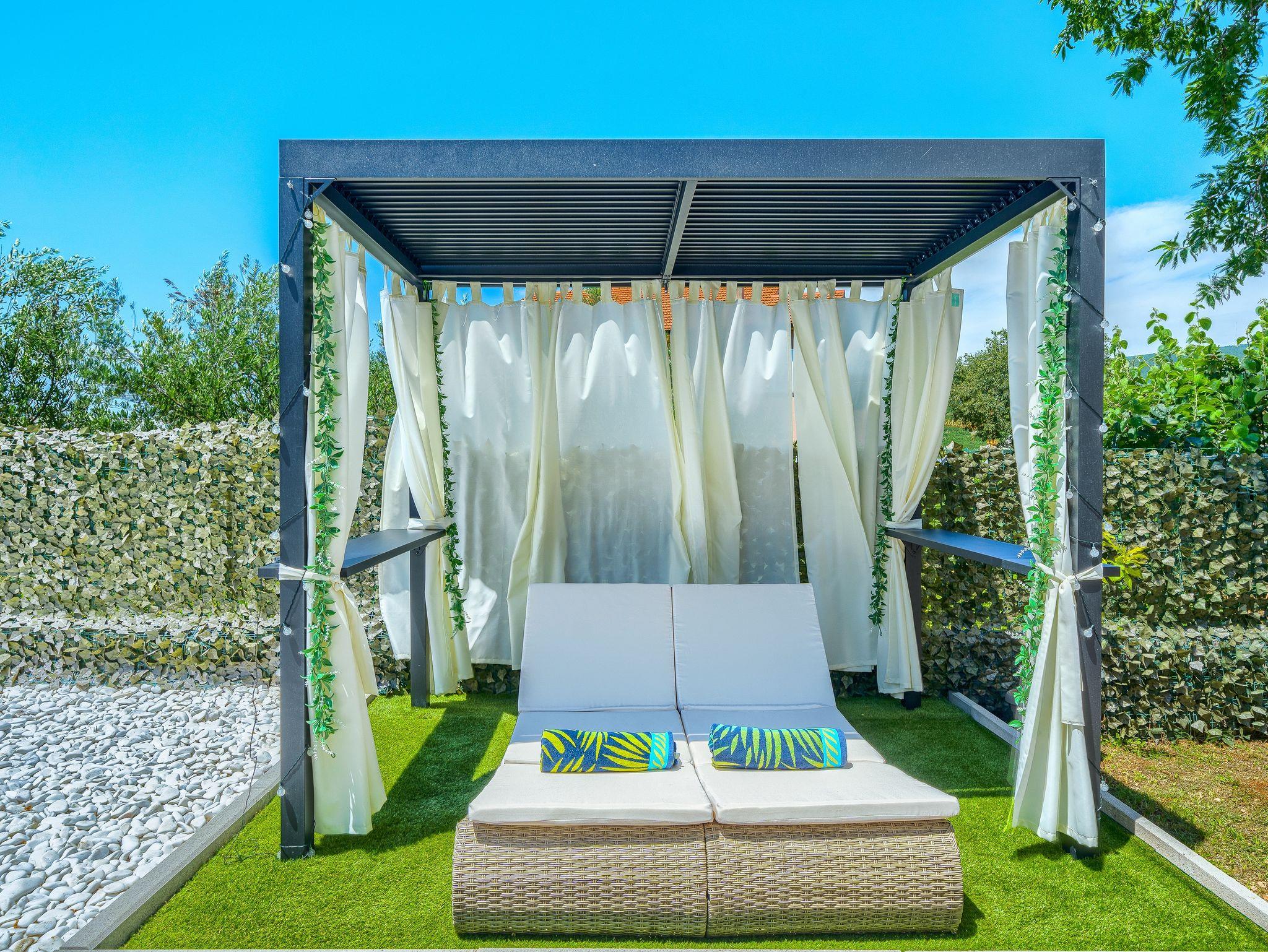 Haus bietet Platz für 10 Gäste. Die Betten sind in Schlafzimmern, die es 5 gibt, und in Wohnzimmer, innerhalb einer Gesamtfläche von 170m2, angeordnet. Die Gäste haben eine eigene Terrasse zur Verfügung, auf der sie in warmen Sommernächten genießen können. Für vollen Genuss und Entspannung gibt es einen privaten Grill für Gäste dieser Unterkunft. Während ihres Aufenthalts können sich Gäste im privaten Schwimmbad entspannen. IM PREIS INBEGRIFFEN: Kurtaxe, Endreinigung, Klimatisierung, Pool, Parkplatz, Garage, Internet, Kinderbett, Bügeleisen, Bügelbrett, Föhn. Die Verfügbarkeit zusätzlicher Dienstleistungen in Ihrem reservierten Termin und die Preise derselben (falls nicht aufgeführt) müssen im Voraus überprüft werden. Zusätzliche Dienstleistungen die in der Zahlungsaufforderung nicht aufgeführt sind werden direkt beim Vermieter bezahlt, angenommen der Gast nutzt auch diese. Ermäßigung auf den Grundpreis: Gratistag 14=13 (bei einem Aufenthalt von 14 Tagen oder mehr erhalten Sie einen Gratistag für den Aufenthalt bis 31.12.26).