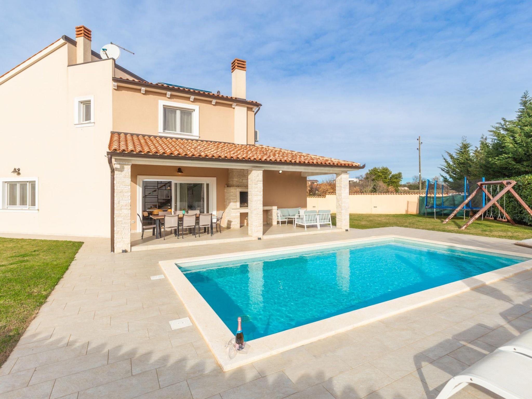 This spacious villa offers a wealth of amenities, including a heated pool, a private garden with swings and a trampoline, a terrace with a barbecue and dining area, and a secure, fenced parking lot.