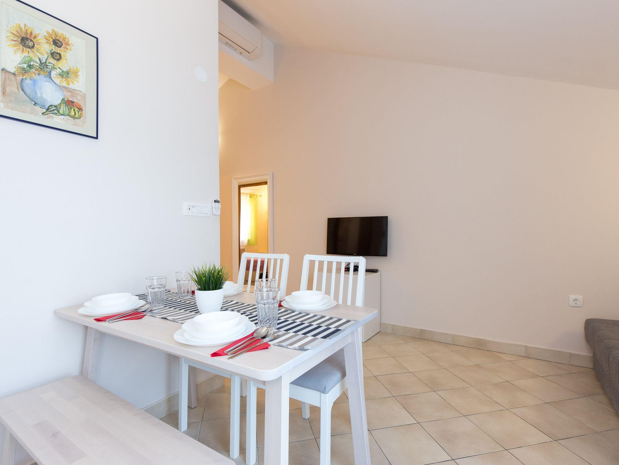 Ferienwohnung bietet Platz für 3 Gäste. Die Betten sind in Schlafzimmern, die es 1 gibt, und in Wohnzimmer, innerhalb einer Gesamtfläche von 34m2, angeordnet. Die Gäste haben einen eigenen Balkon zur Verfügung, auf der sie in warmen Sommernächten genießen können. Das Apartment bietet Meerblick. Es ist erlaubt, Speisen auf dem Gemeinschafts-Grill vorzubereiten. In der Unterkunftseinheit besteht die Möglichkeit des Mitbringens von Haustieren gegen Aufpreis. IM PREIS INBEGRIFFEN: Kurtaxe, Endreinigung, Klimatisierung, Parkplatz, Internet. VERBINDLICHE ZUSÄTZLICHE KOSTEN: Aufzahlung für Kurzaufenthalte (prozentualer Zuschlag pro Nächtigungsanzahl: 30% - 1, 20% - 2, 10% - 3). UNVERBINDLICHE ZUSÄTZLICHE KOSTEN: Haustiere (5,00 € pro Nacht). Die Verfügbarkeit zusätzlicher Dienstleistungen in Ihrem reservierten Termin und die Preise derselben (falls nicht aufgeführt) müssen im Voraus überprüft werden. Zusätzliche Dienstleistungen die in der Zahlungsaufforderung nicht aufgeführt sind werden direkt beim Vermieter bezahlt, angenommen der Gast nutzt auch diese.
