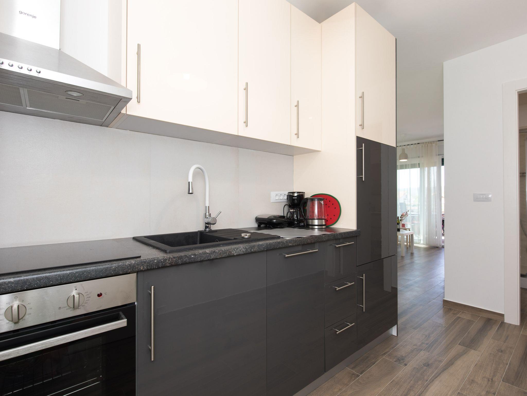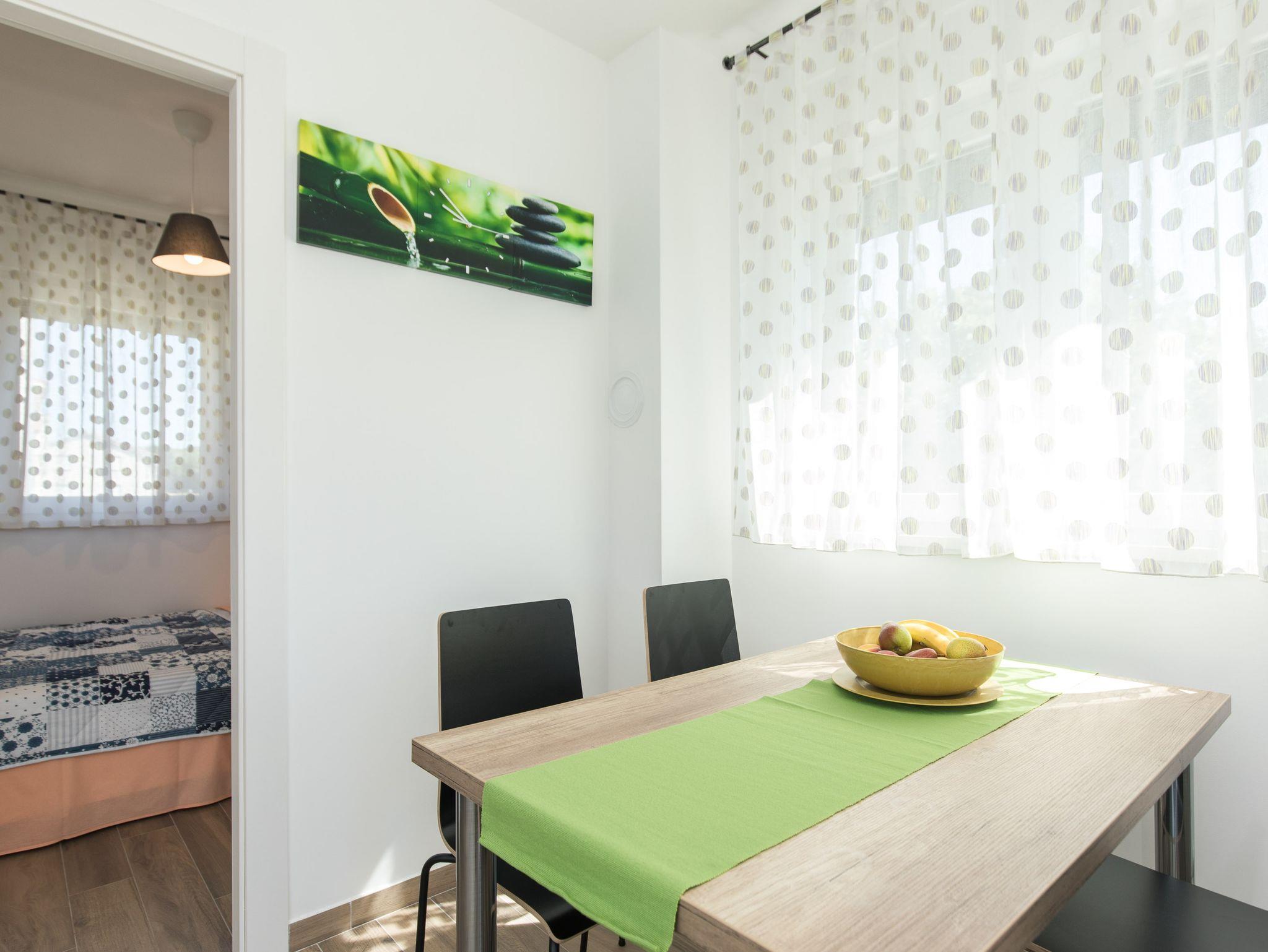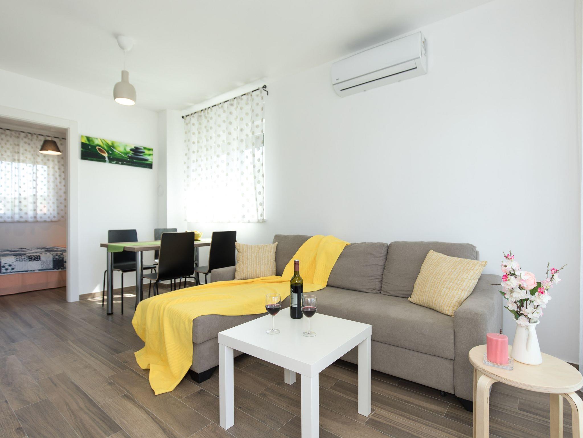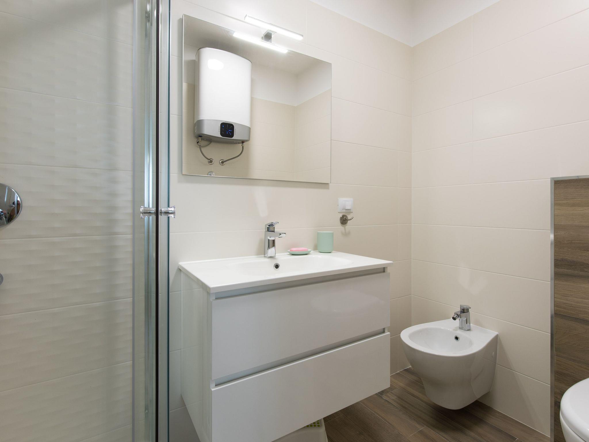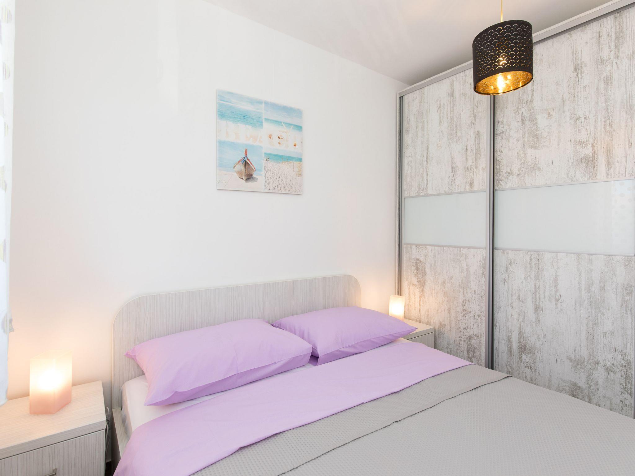 Ferienwohnung bietet Platz für 4 Gäste. Die Betten sind in Schlafzimmern, die es 2 gibt, innerhalb einer Gesamtfläche von 42m2, angeordnet. Die Gäste haben eine eigene Terrasse zur Verfügung, auf der sie in warmen Sommernächten genießen können. Es ist erlaubt, Speisen auf dem Gemeinschafts-Grill vorzubereiten. IM PREIS INBEGRIFFEN: Kurtaxe, Endreinigung, Klimatisierung, Parkplatz, Internet. VERBINDLICHE ZUSÄTZLICHE KOSTEN: Aufzahlung für Kurzaufenthalte (prozentualer Zuschlag pro Nächtigungsanzahl: 30% - 1, 20% - 2, 10% - 3). Die Verfügbarkeit zusätzlicher Dienstleistungen in Ihrem reservierten Termin und die Preise derselben (falls nicht aufgeführt) müssen im Voraus überprüft werden. Zusätzliche Dienstleistungen die in der Zahlungsaufforderung nicht aufgeführt sind werden direkt beim Vermieter bezahlt, angenommen der Gast nutzt auch diese.