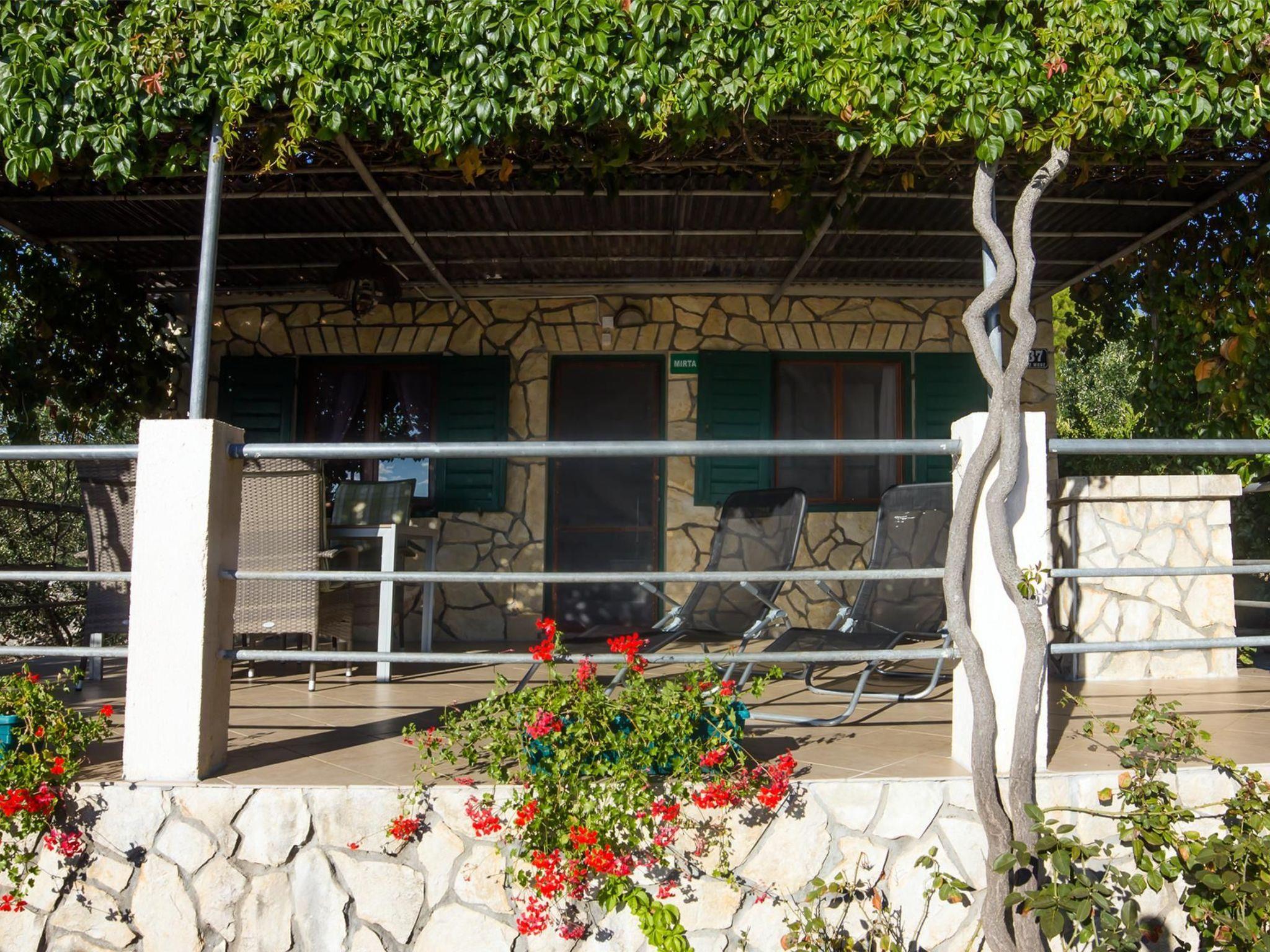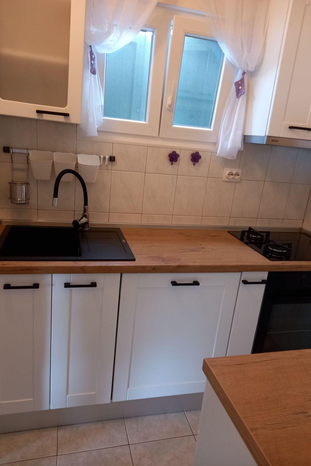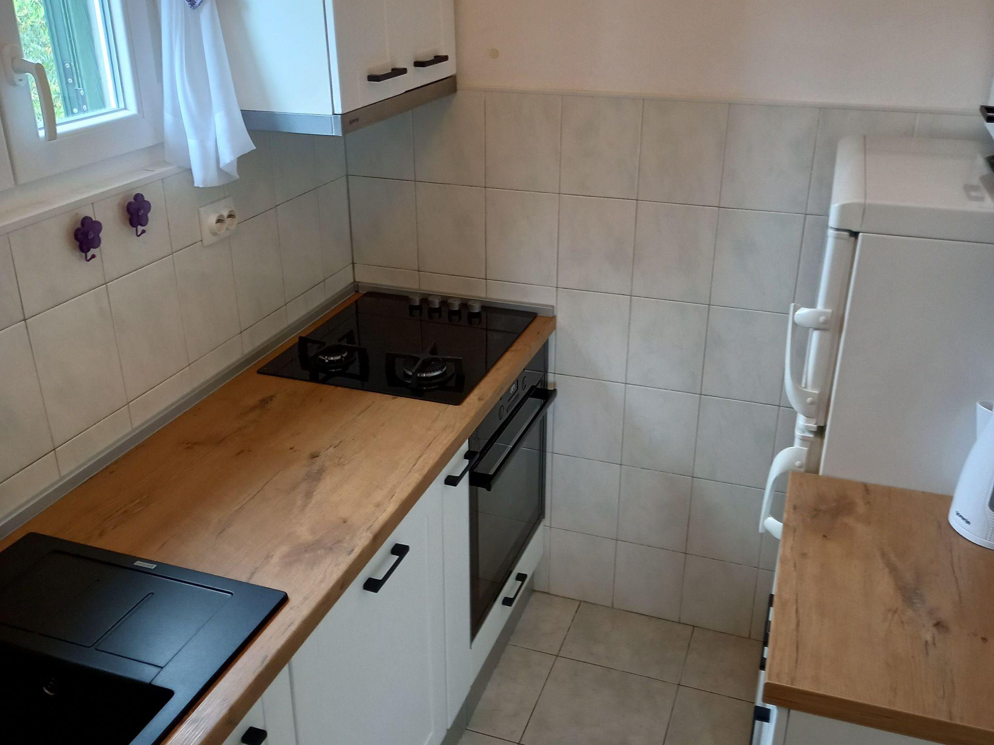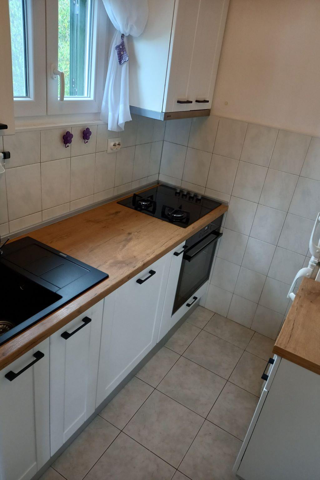 The renovated, one-storey house provides 45m² of space for up to five people. The two bedrooms have a double and two single beds and there is a sofa bed in the living room, as well as a TV, fan and a dining table with a bench and chairs. Next to it there is the separate kitchen with a hob, oven, fridge, dishwasher, kettle and cooking utensils. The bathroom provides a shower, WC and hairdryer.