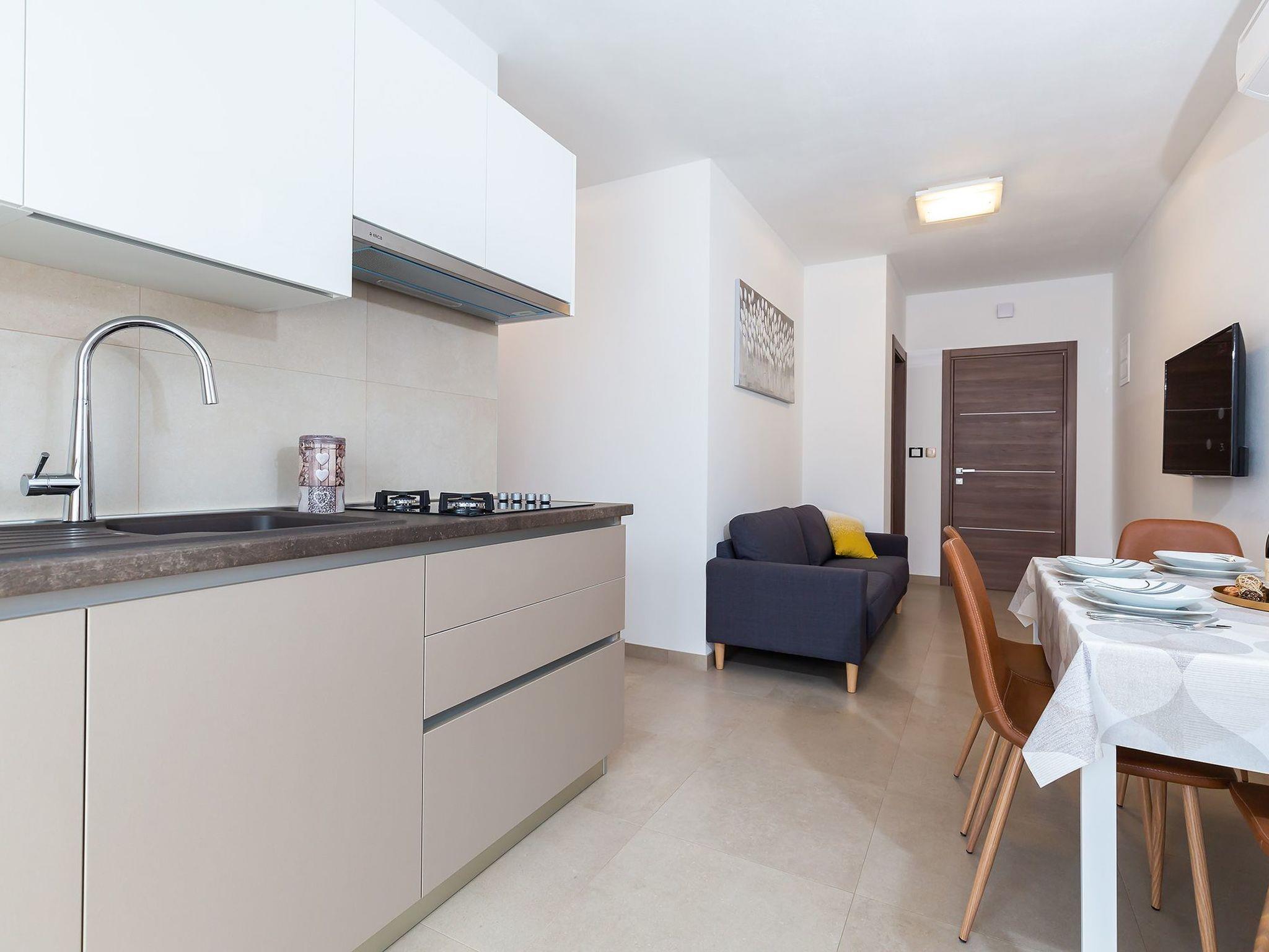 The air-conditioned apartment is on the first floor and can accommodate four people. The living and dining room with a kitchen provides a sofa, a flatscreen TV and a dining table with four chairs. The kitchen unit is fully equipped. The two bedrooms each have a kingsize double bed and a wardrobe. The bathroom consists of a shower, washbasin and toilet. Wi-Fi Internet access is available.