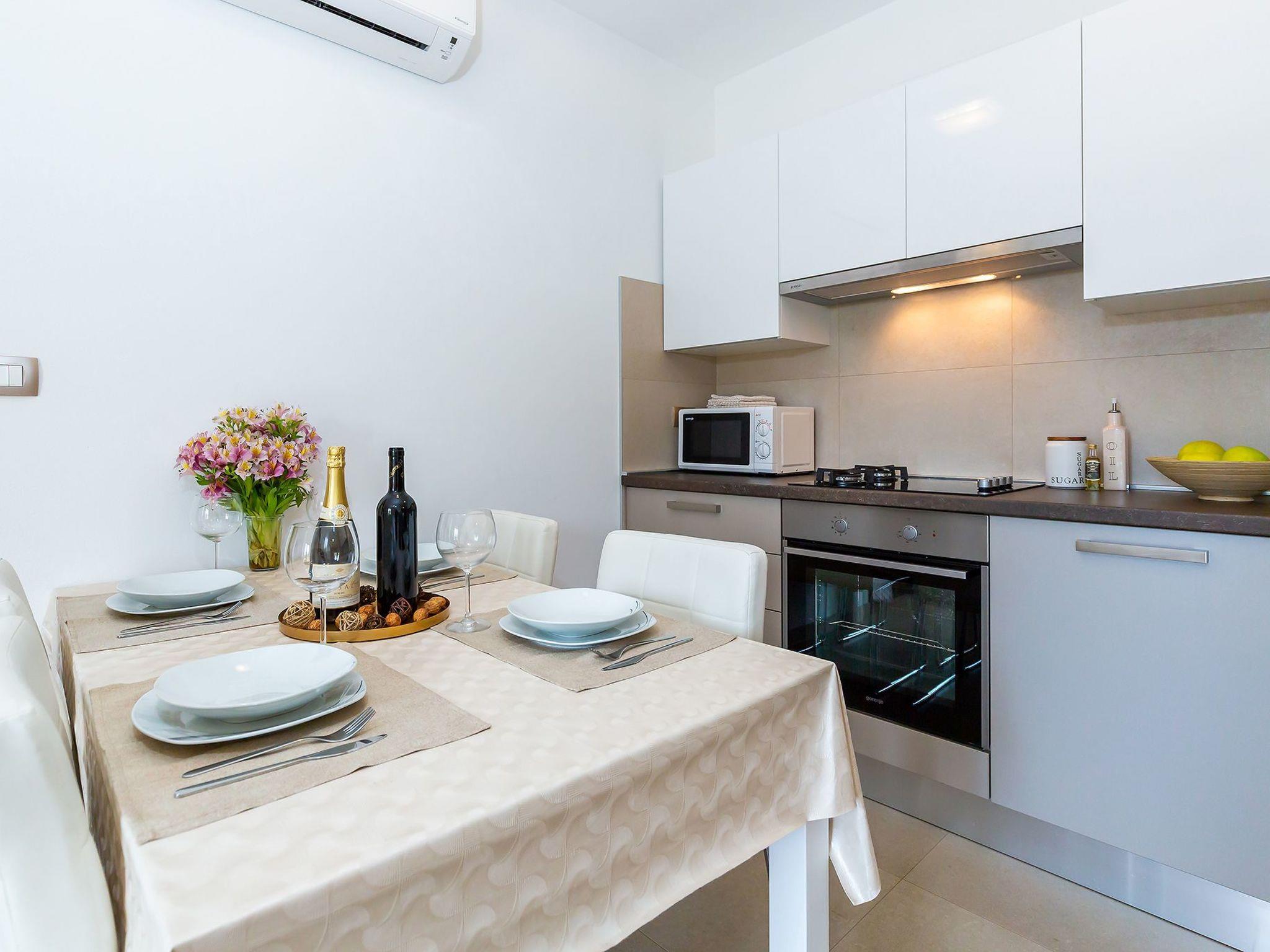 The air-conditioned apartment is on the first floor and can accommodate four people. The living and dining room with the kitchen provides a sofa, a flatscreen TV and a dining table with four chairs. The kitchen unit is fully-equipped. The two bedrooms are each furnished with a kingsize double bed and a wardrobe. The bathroom comprises a shower, washbasin and toilet. Wi-Fi Internet is available.