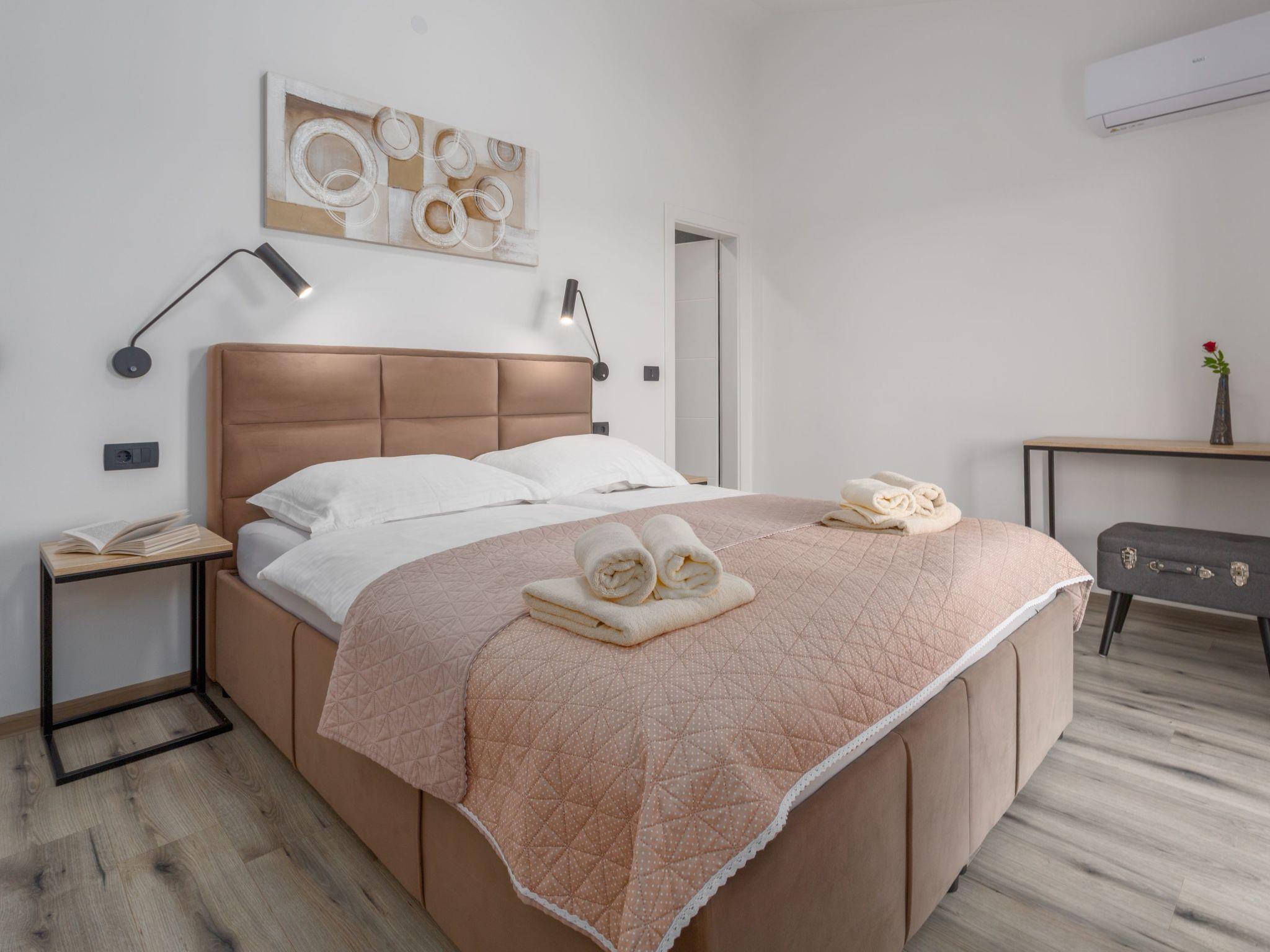 Inside, Villa Stefany impresses with its luxurious furnishings, which extend over two floors and a total area of 160 m². The ground floor offers an air-conditioned living room with a fireplace and a pull-out sofa bed for two additional guests, from which you have direct access to the terrace and garden. A fully equipped kitchen with dining table and a separate WC round off the space on offer. On the upper floor you will find a bedroom with a double bed and another with two separate beds, each with its own bathroom with shower/WC and access to a shared balcony, which offers a picturesque view of olive groves and the distant sea.