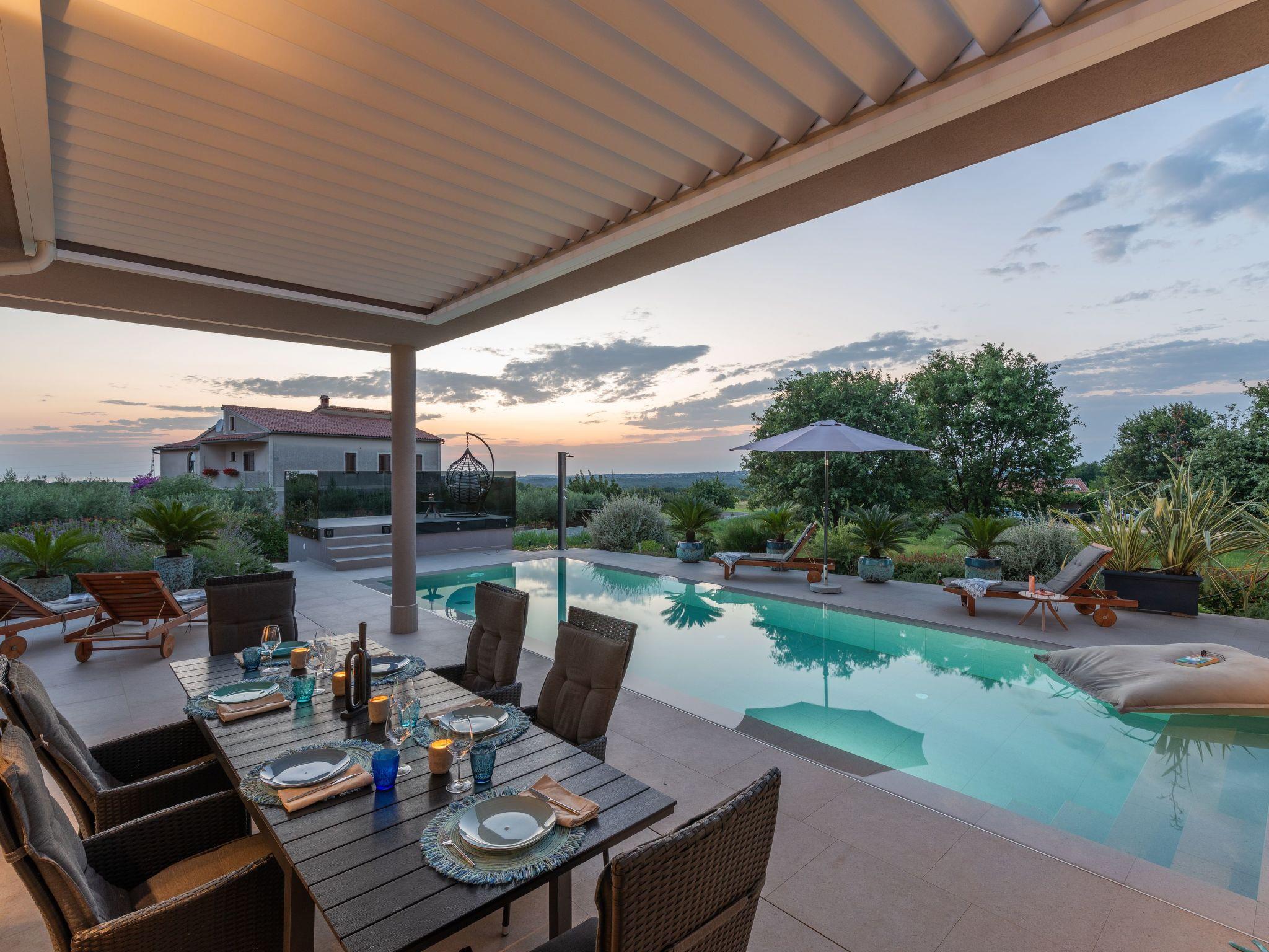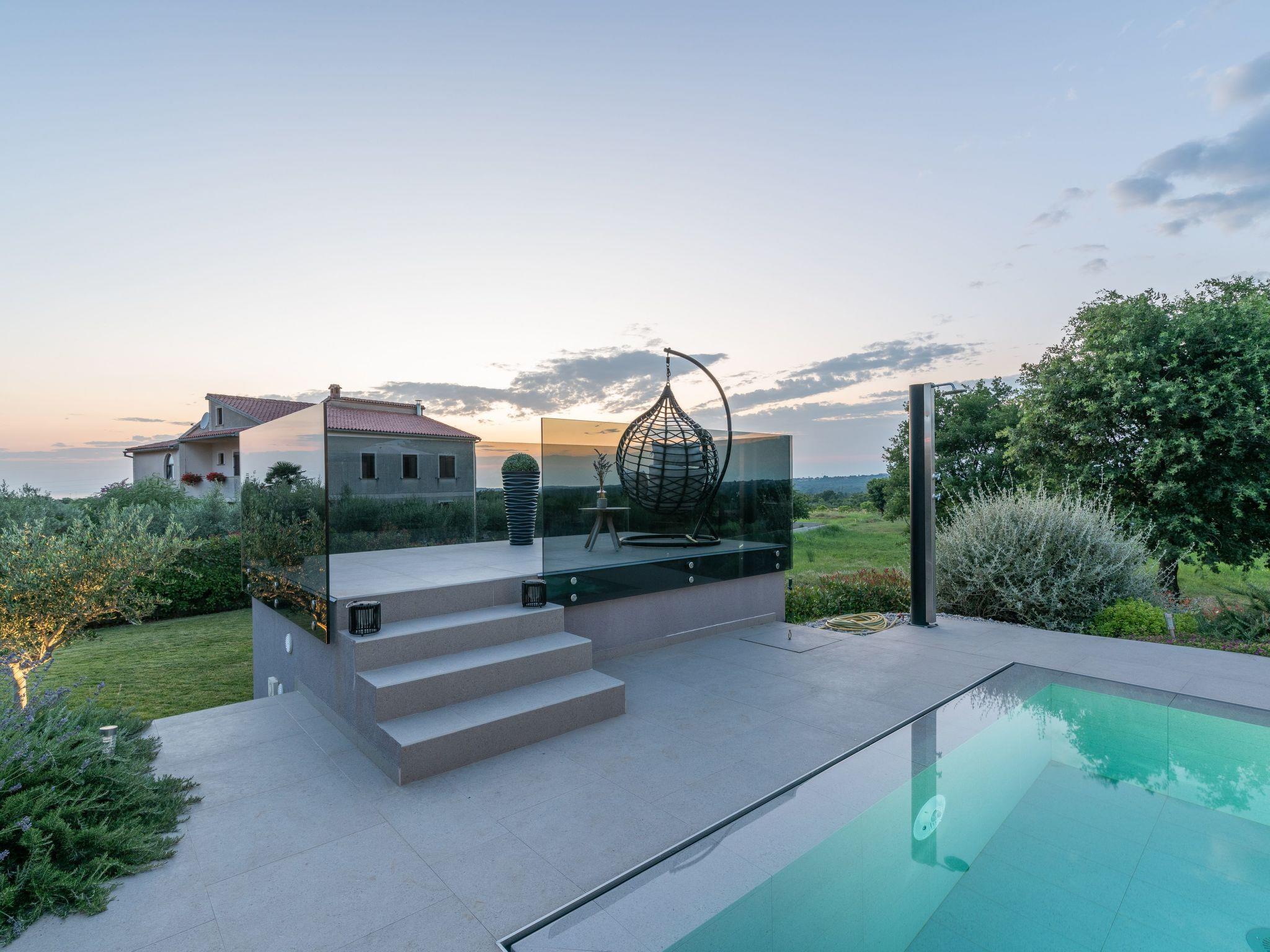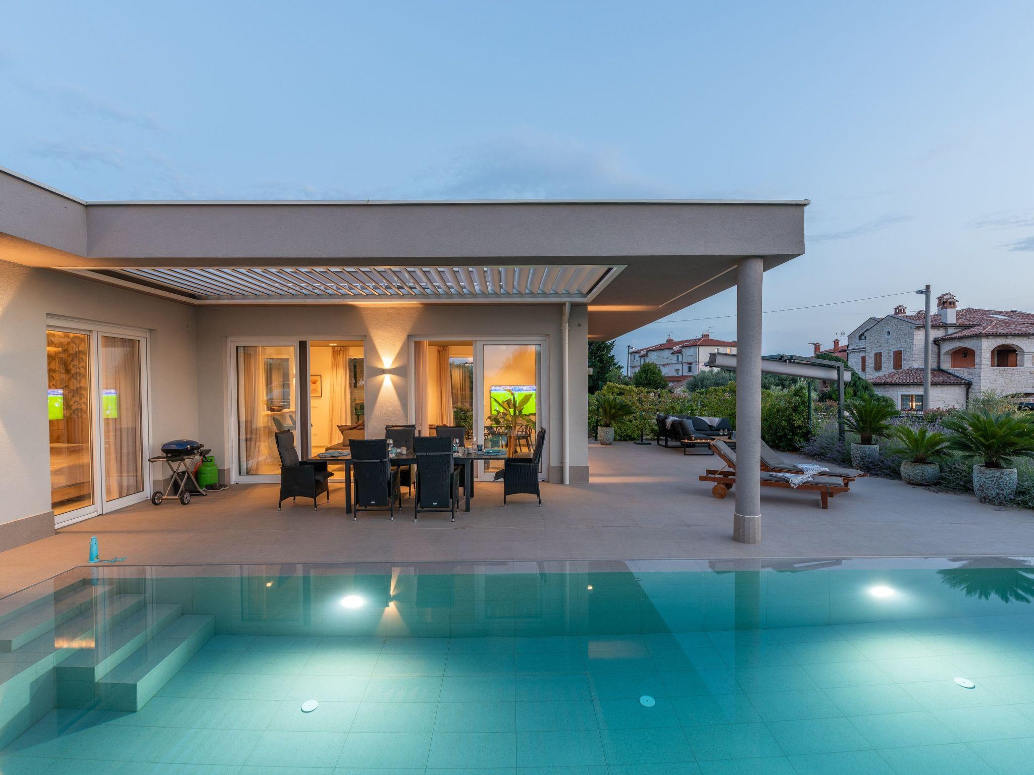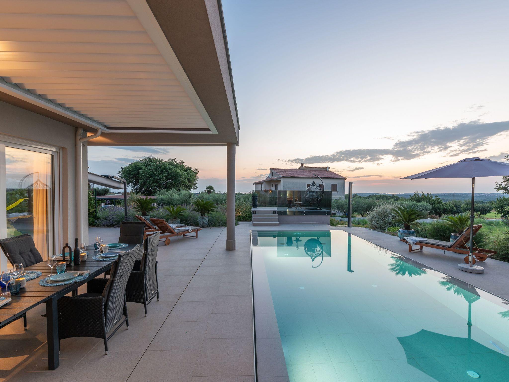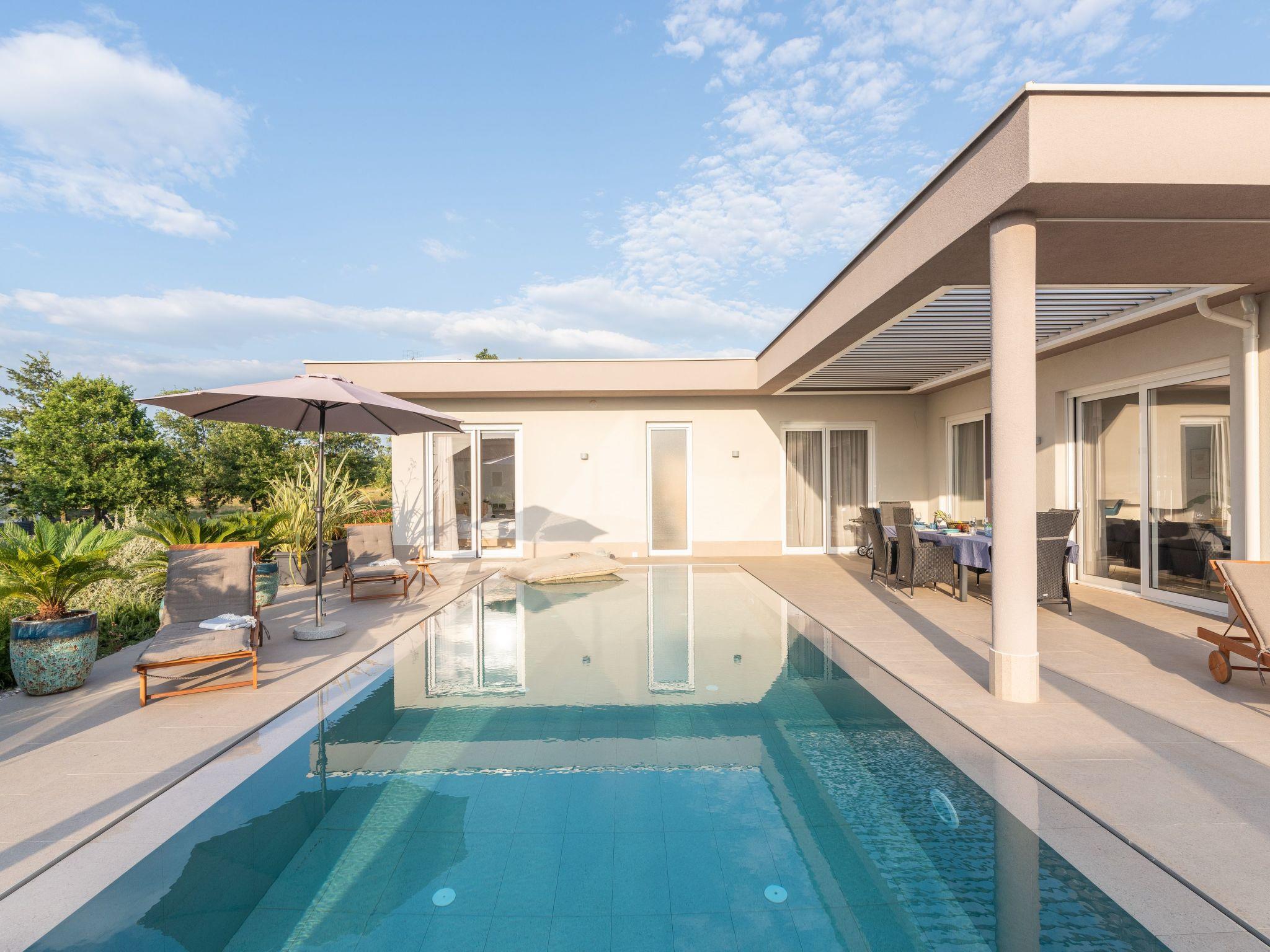 Villa Serena is a modern holiday home in Stranici, only 10 minutes by car from the nearest beach and from Porec. It is located on the edge of the village, on its own fully fenced garden of 1280 m2, where guests have at their disposal a 35m2 outdoor pool with salt water, a covered terrace with table for outdoor dining, barbecue and lounge furniture. A swing is located on the elevated terrace.