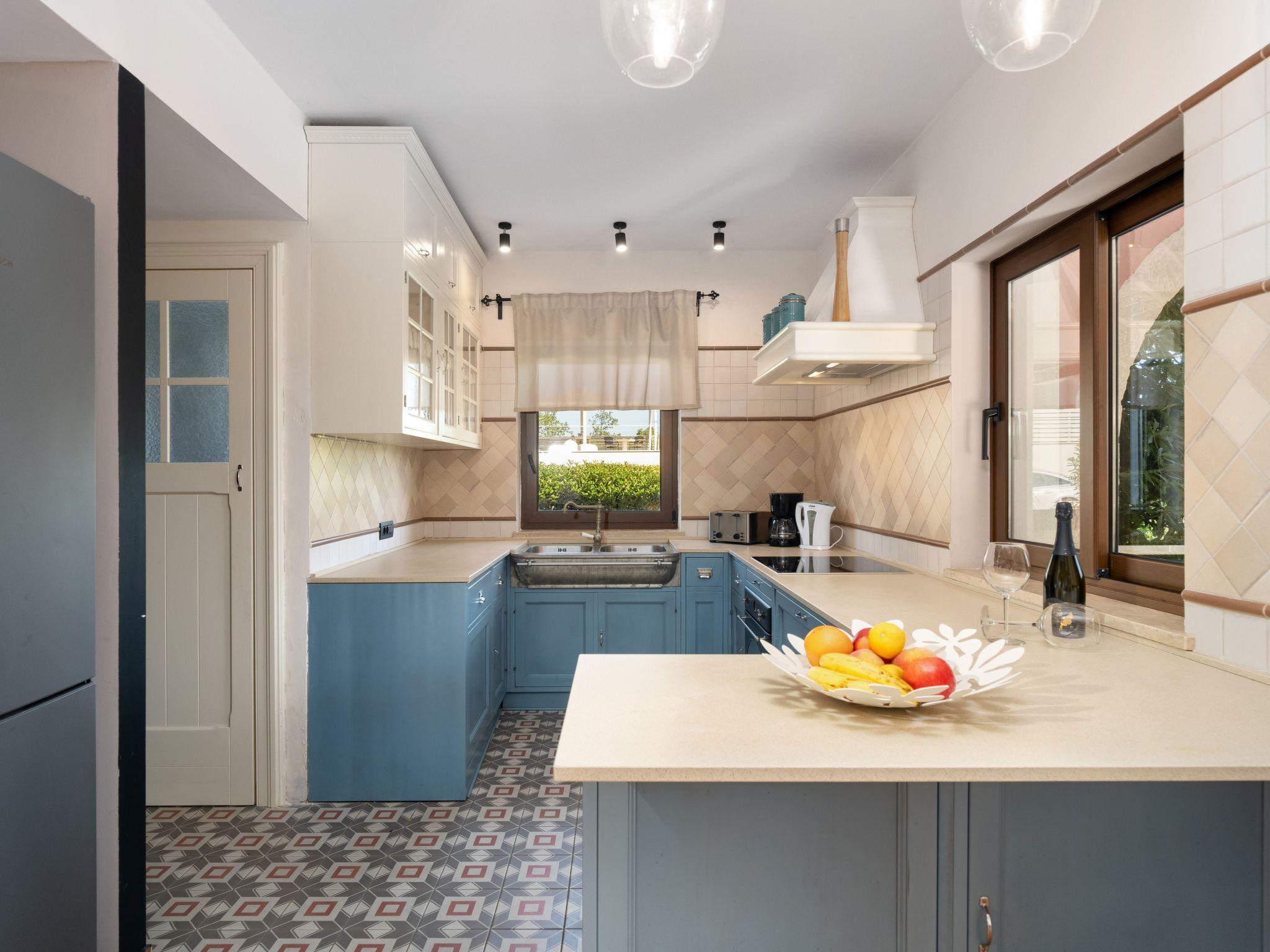 Inside, state-of-the-art comfort awaits you on two levels with 220 m² of living space. A spacious living area with direct access to a covered terrace invites you to linger, while the fully equipped kitchen and adjoining dining room provide the setting for sociable dinners. A comfortable bedroom with a double bed, a bathroom with shower and a separate toilet are also located on the ground floor. The upper floor houses further bedrooms - including a double room with access to the balcony and a single room, both with panoramic sea views, two double rooms with views of the pool and access to a shared balcony, a further bathroom and a laundry room.
