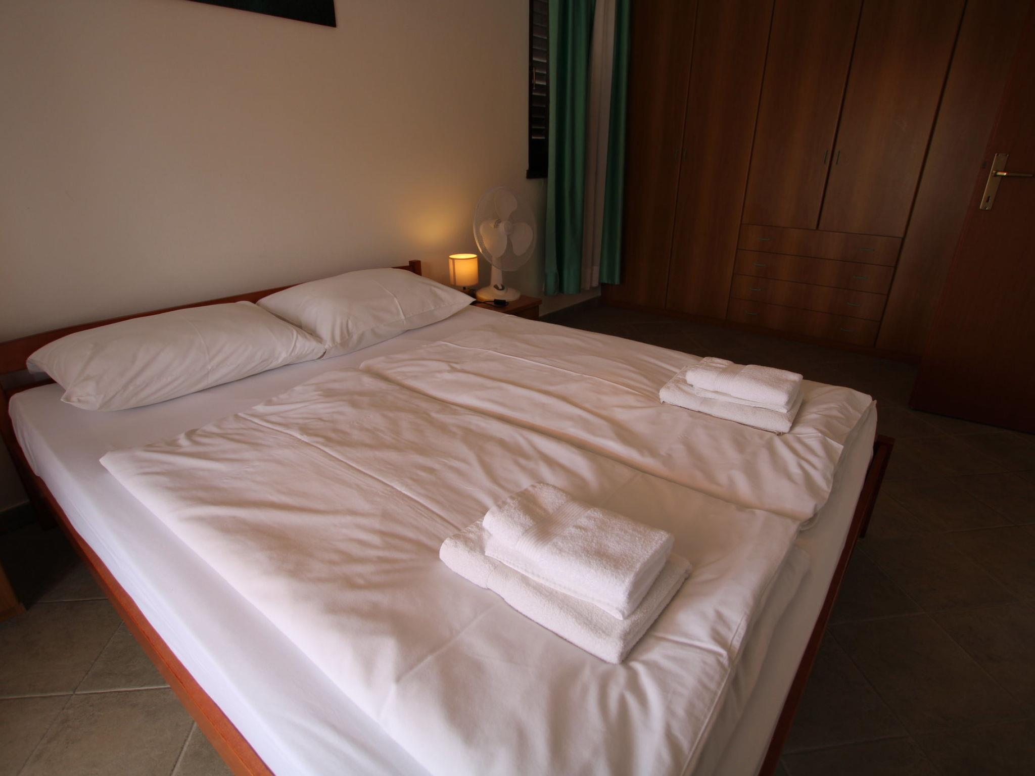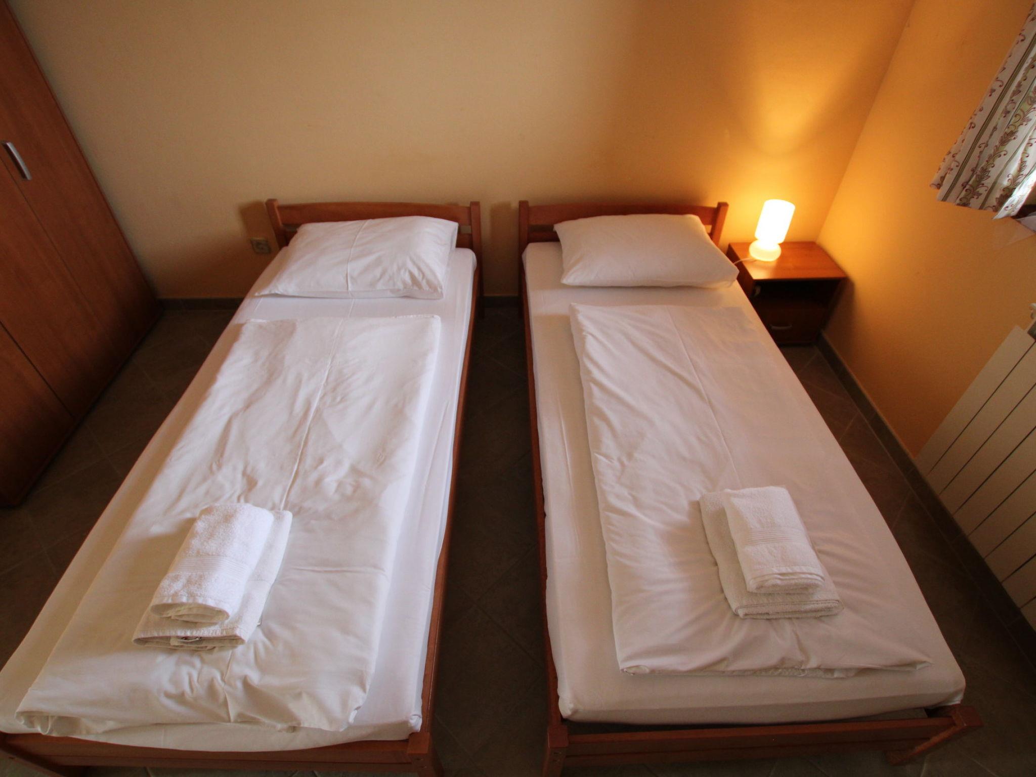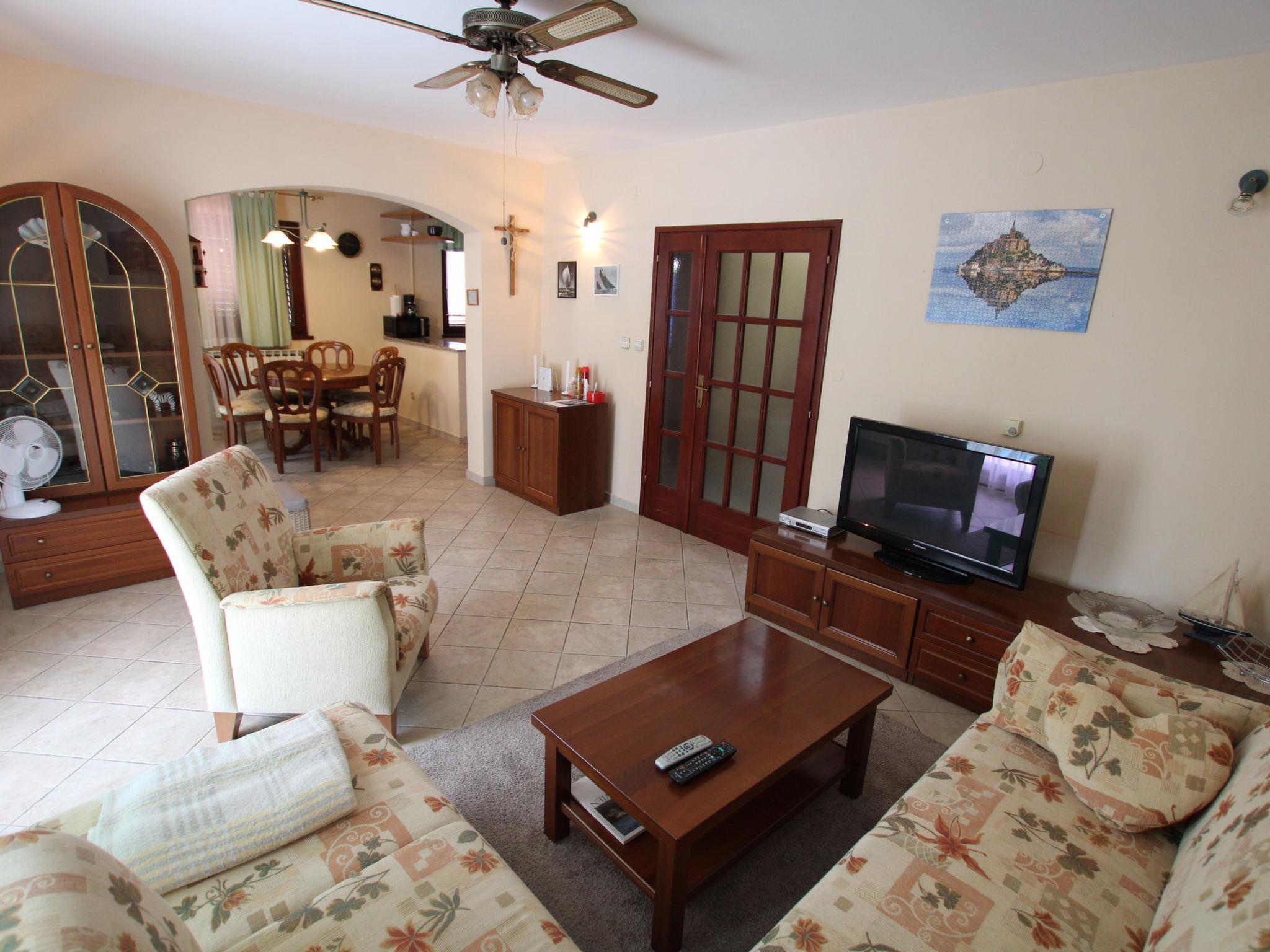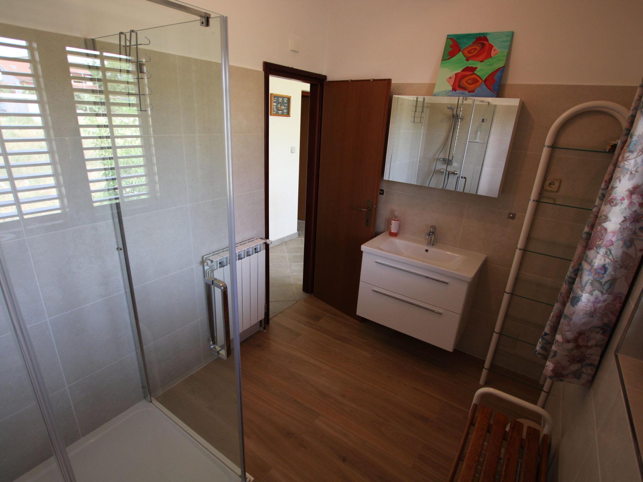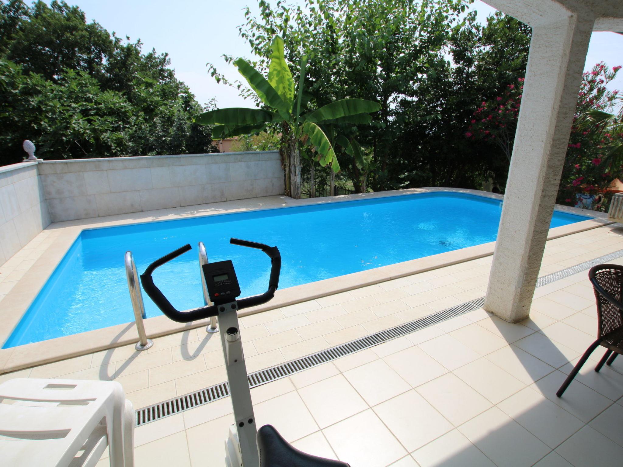 The 110 m2 Villa Viktoria extends over two floors. The house is part of a semi-detached building with a private entrance to its own fenced yard.The ground floor consists of a kitchen, dining room and living room with direct access to the terrace and pool.Kitchen equipment consists of: stove (3 gas + 1 electric), oven, refrigerator with freezer, hood and coffee maker. A flat screen sattv is located in the living area with a sofa. Wifi is available.The terrace is covered with direct access to the pool. A fitness bike is also available.There is one guest toilet on the ground floor.On the first floor there are 3 bedrooms and one bathroom with shower, toilet and sink.One bedroom has a double bed and access to the balcony that it shares with the second bedroom. The second bedroom has a double bed that can be separated, and the third bedroom has two single beds.Pets are welcome with prior notice and a small fee.One parking space is located in front of the house.