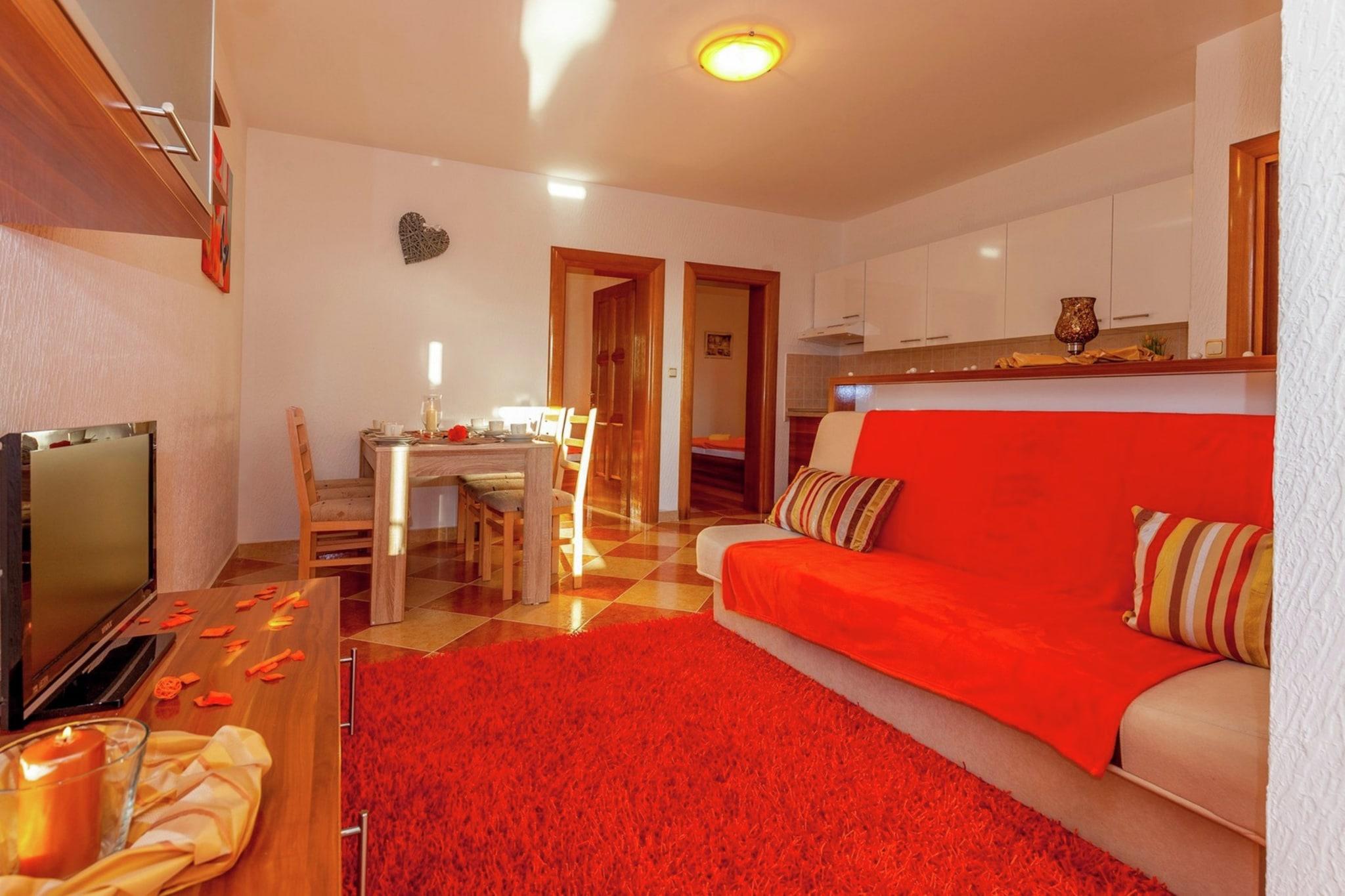 Stor villa lejlighed med overdækket terrasse ligger i stedet Dramalj. Det er en lille turistby forbundet med Crikvenica med lang sti omgivet af middelhavs vegetation kaldet Lungo mare. Rummelig indkvartering ligger i et roligt område, 1 km fra centrum. På grund af denne placering er det et behageligt ophold for alle, der elsker naturen. Med afstanden på 600 meter kan du finde strande og restauranter. Den mest attraktive strand for familier med børn i regionen hedder Kacjak, og det er kun 0,9 km væk. Dramalj og Crikvenica med deres lange tradition for turisme er perler af Crikvenica Riviera på grund af mildt middelhavsklima, smukke sandstrande, småsten og stenstrande og rige historiske og kulturelle arv. Udover vandsport for dem, der søger en aktiv ferie, er der forskellige aktiviteter: cykling, bjergbestigning, fiskeri, dykning, tennis og golf. Nationalpark Risnjak med sine naturlige skønheder samt Gorski Kotar, regionen med bjerge og søer kan nås inden for en times kørsel.