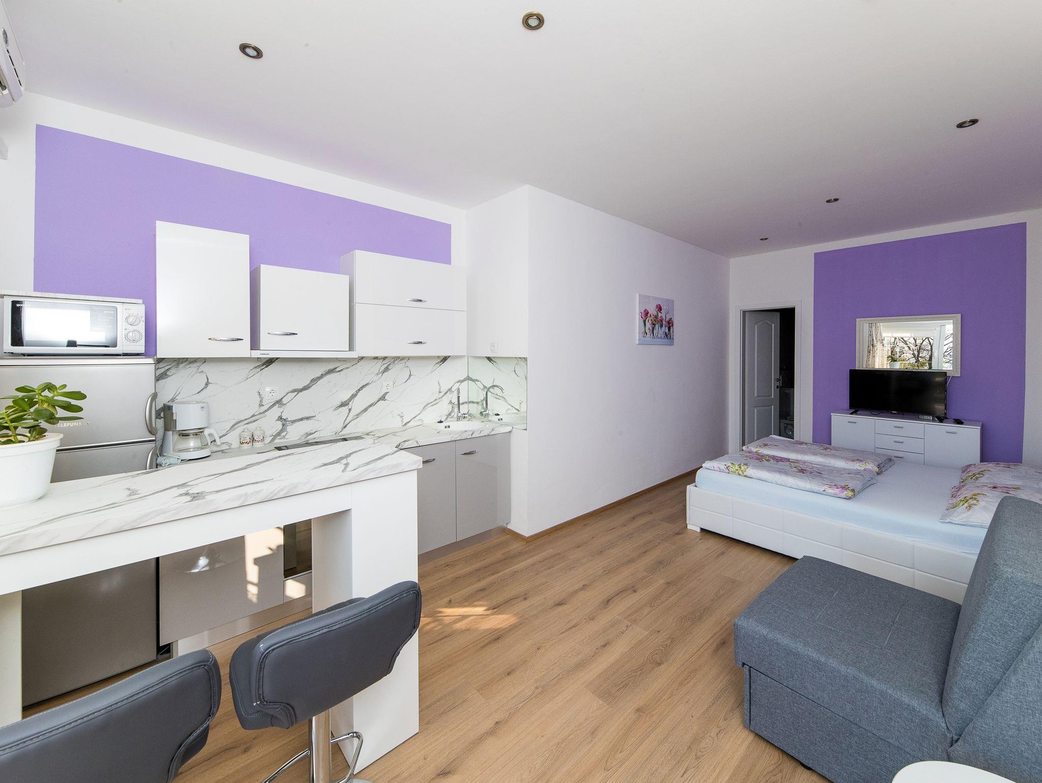 Studio bietet Platz für 2 Gäste. Die Betten sind in Schlafzimmern, die es 1 gibt, innerhalb einer Gesamtfläche von 28m2, angeordnet. Die Gäste haben eine eigene Terrasse zur Verfügung, auf der sie in warmen Sommernächten genießen können. Es ist erlaubt, Speisen auf dem Gemeinschafts-Grill vorzubereiten. Während ihres Aufenthalts können Gäste das gemeinsam zur Nutzung stehende Schwimmbad benutzen. IM PREIS INBEGRIFFEN: Kurtaxe, Endreinigung, Klimatisierung, Zentralheizung, Pool, Parkplatz, Internet, Bügeleisen, Bügelbrett, Föhn. VERBINDLICHE ZUSÄTZLICHE KOSTEN: Aufzahlung für Kurzaufenthalte (prozentualer Zuschlag pro Nächtigungsanzahl: 30% - 1, 20% - 2, 10% - 3). UNVERBINDLICHE ZUSÄTZLICHE KOSTEN: Wäschewaschen (5,00 € Waschen). Die Verfügbarkeit zusätzlicher Dienstleistungen in Ihrem reservierten Termin und die Preise derselben (falls nicht aufgeführt) müssen im Voraus überprüft werden. Zusätzliche Dienstleistungen die in der Zahlungsaufforderung nicht aufgeführt sind werden direkt beim Vermieter bezahlt, angenommen der Gast nutzt auch diese.