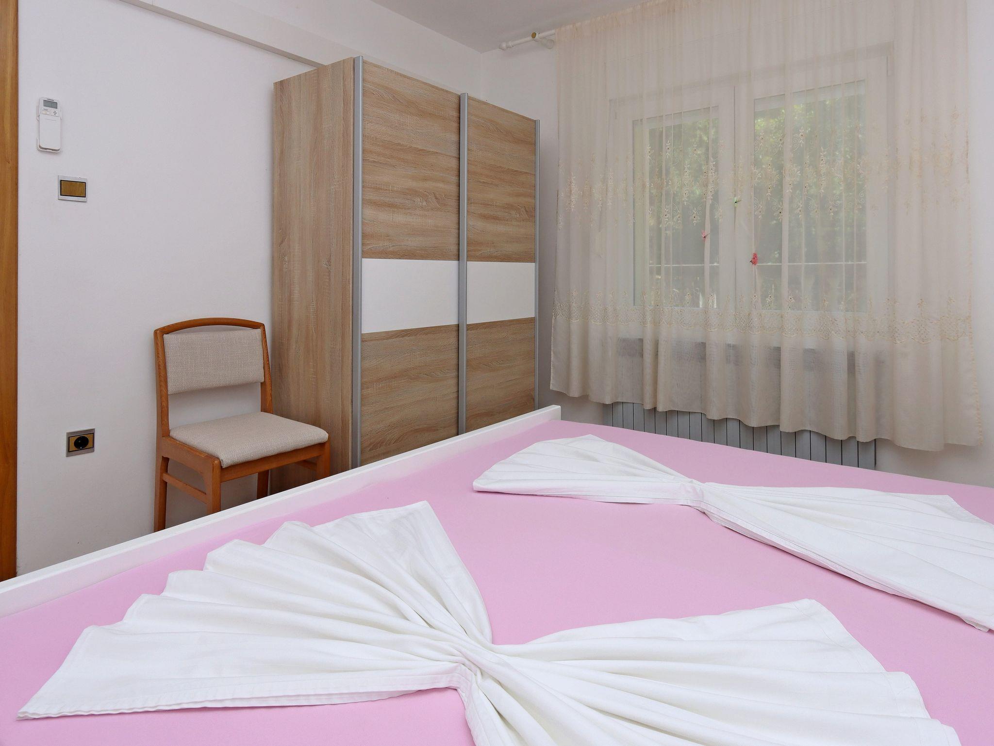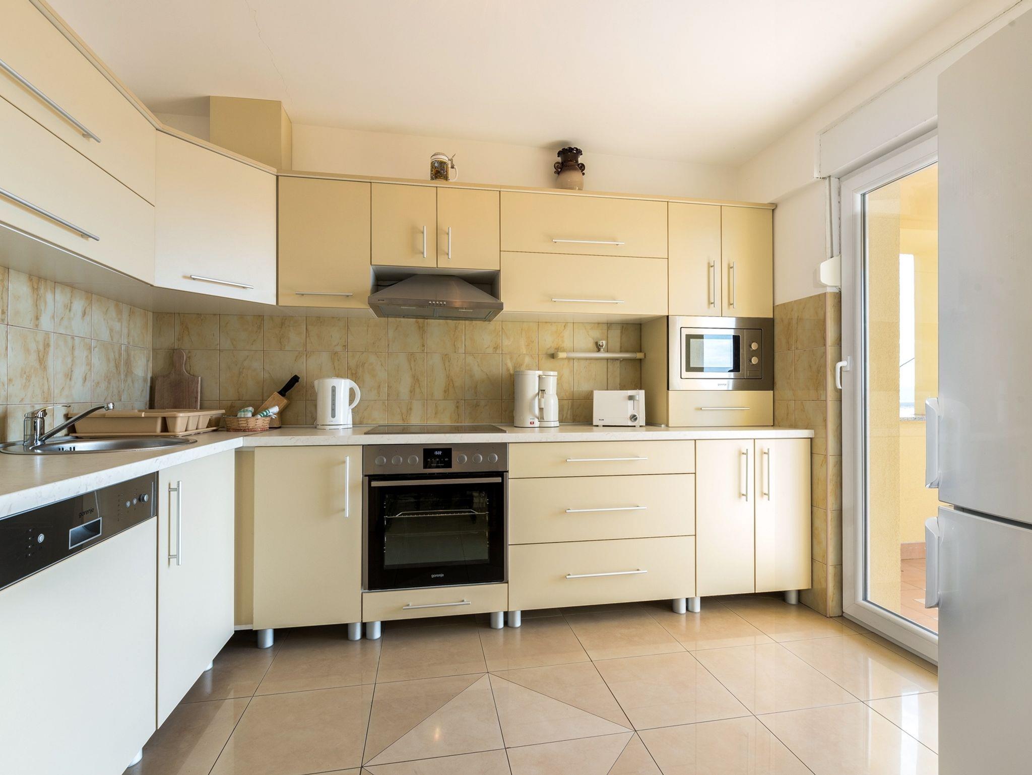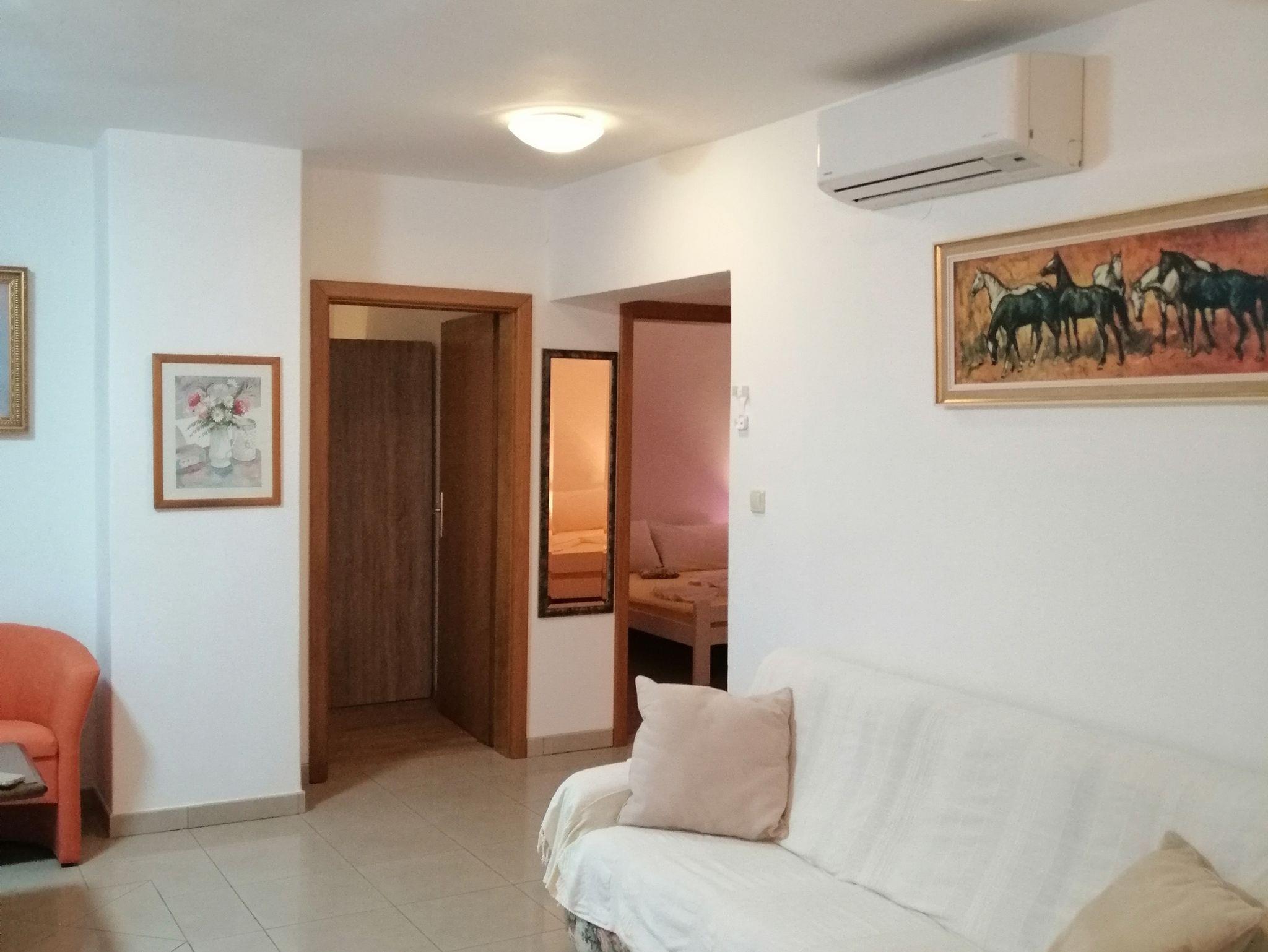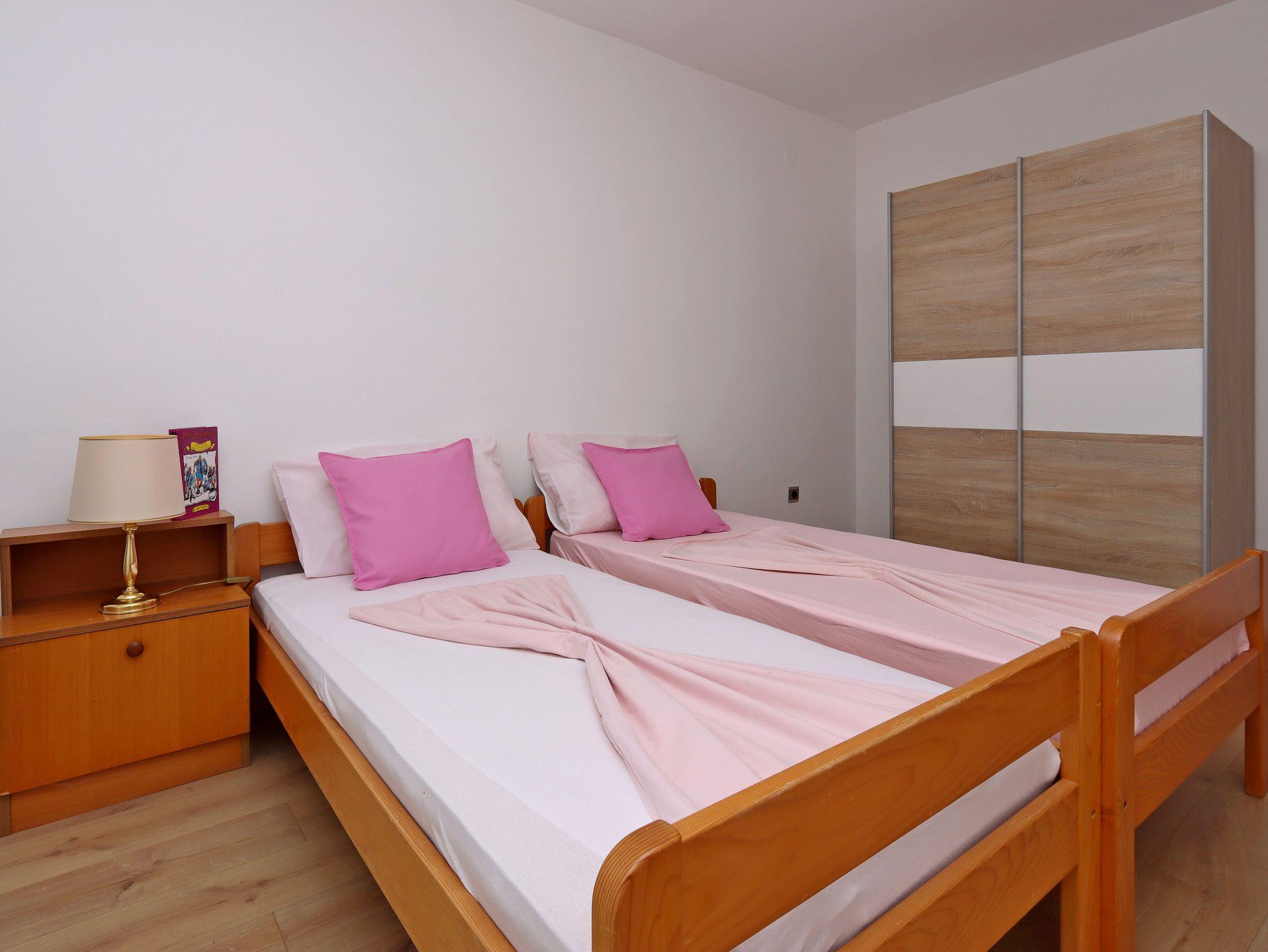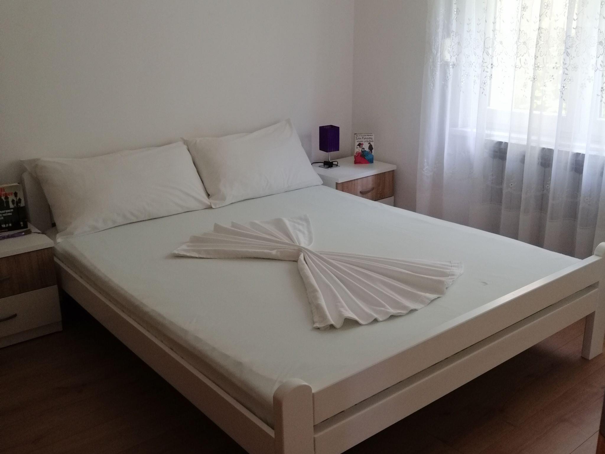 Ferienwohnung bietet Platz für 6 Gäste. Die Betten sind in Schlafzimmern, die es 3 gibt, innerhalb einer Gesamtfläche von 70m2, angeordnet. Die Gäste haben eine eigene Terrasse zur Verfügung, auf der sie in warmen Sommernächten genießen können. Das Apartment bietet Meerblick. Es ist erlaubt, Speisen auf dem Gemeinschafts-Grill vorzubereiten. IM PREIS INBEGRIFFEN: Kurtaxe, Endreinigung, Klimatisierung, Parkplatz, Internet, Kinderbett, Bügeleisen, Bügelbrett, Föhn. VERBINDLICHE ZUSÄTZLICHE KOSTEN: Aufzahlung für Kurzaufenthalte (prozentualer Zuschlag pro Nächtigungsanzahl: 30% - 1, 20% - 2, 10% - 3). UNVERBINDLICHE ZUSÄTZLICHE KOSTEN: Wäschewaschen (5,00 € Waschen). Die Verfügbarkeit zusätzlicher Dienstleistungen in Ihrem reservierten Termin und die Preise derselben (falls nicht aufgeführt) müssen im Voraus überprüft werden. Zusätzliche Dienstleistungen die in der Zahlungsaufforderung nicht aufgeführt sind werden direkt beim Vermieter bezahlt, angenommen der Gast nutzt auch diese. Ermäßigung auf den Grundpreis: Gratistag 14=13 (bei einem Aufenthalt von 14 Tagen oder mehr erhalten Sie einen Gratistag für den Aufenthalt bis 31.12.26).