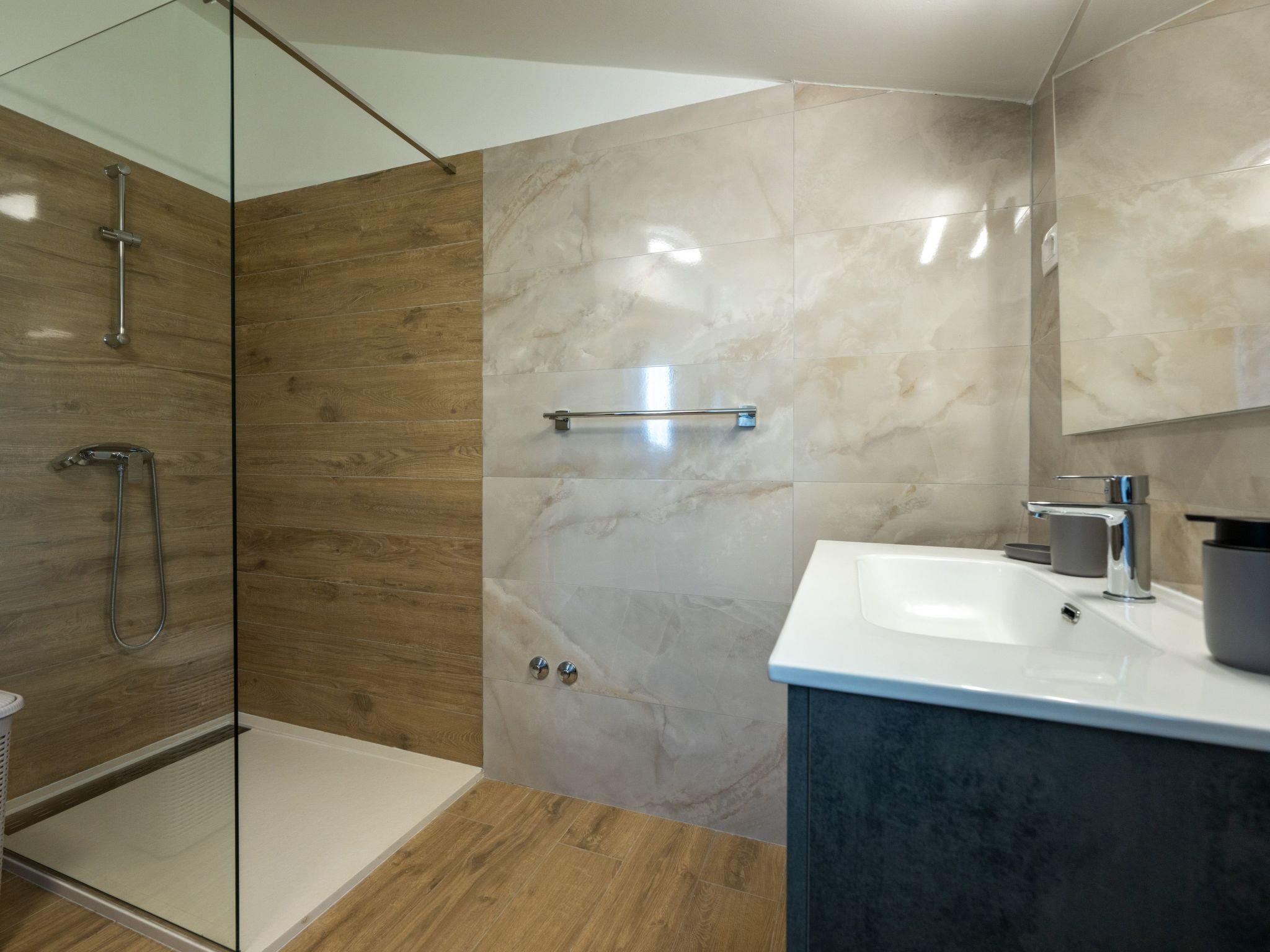 - bathroom with shower, toilette, washbasin, washing machine, hairdryer