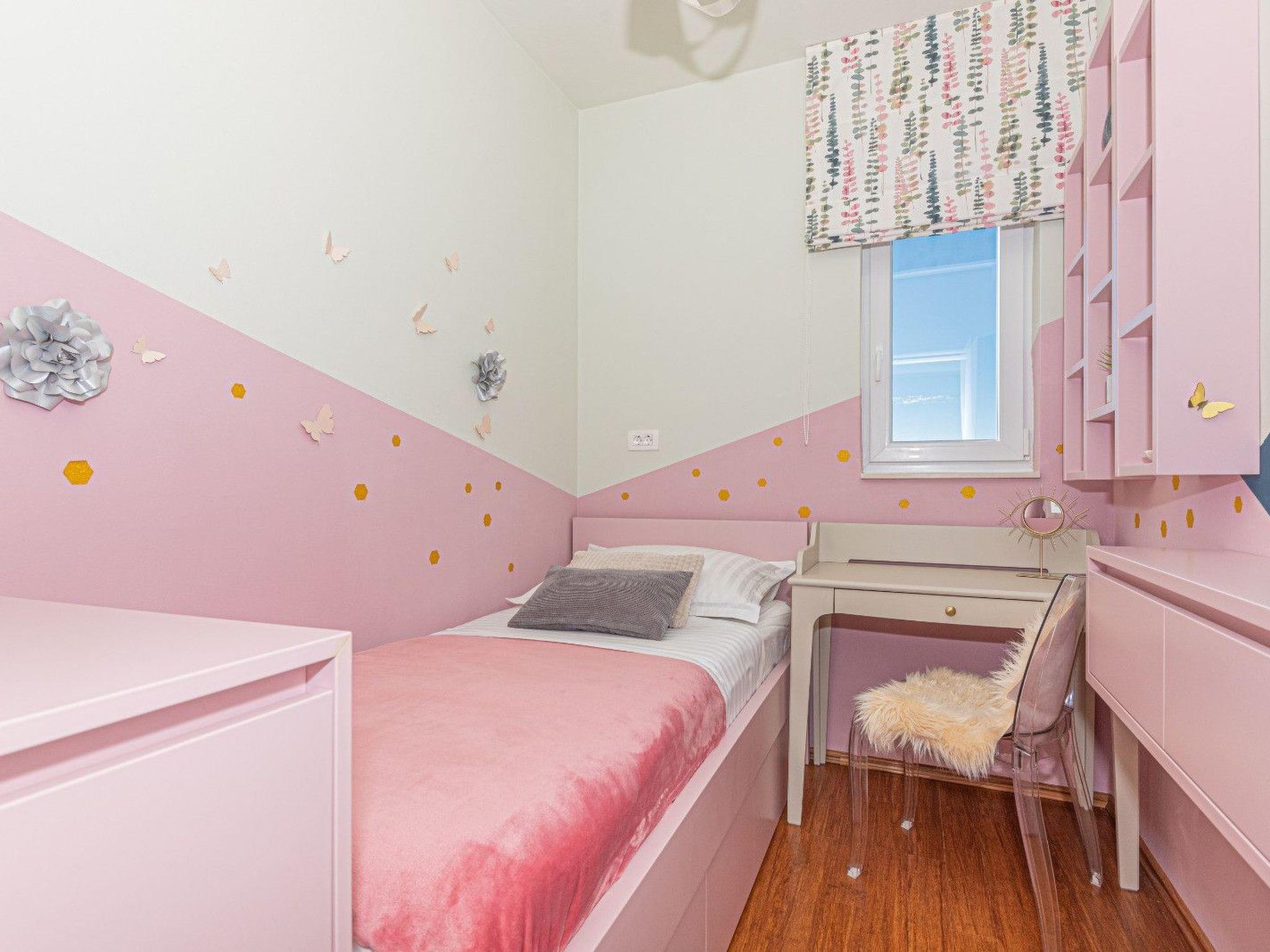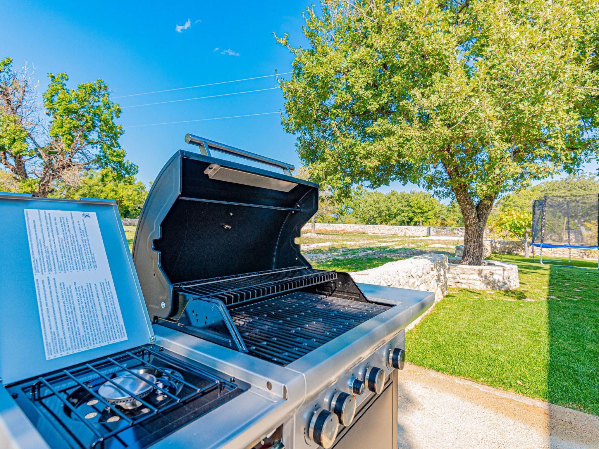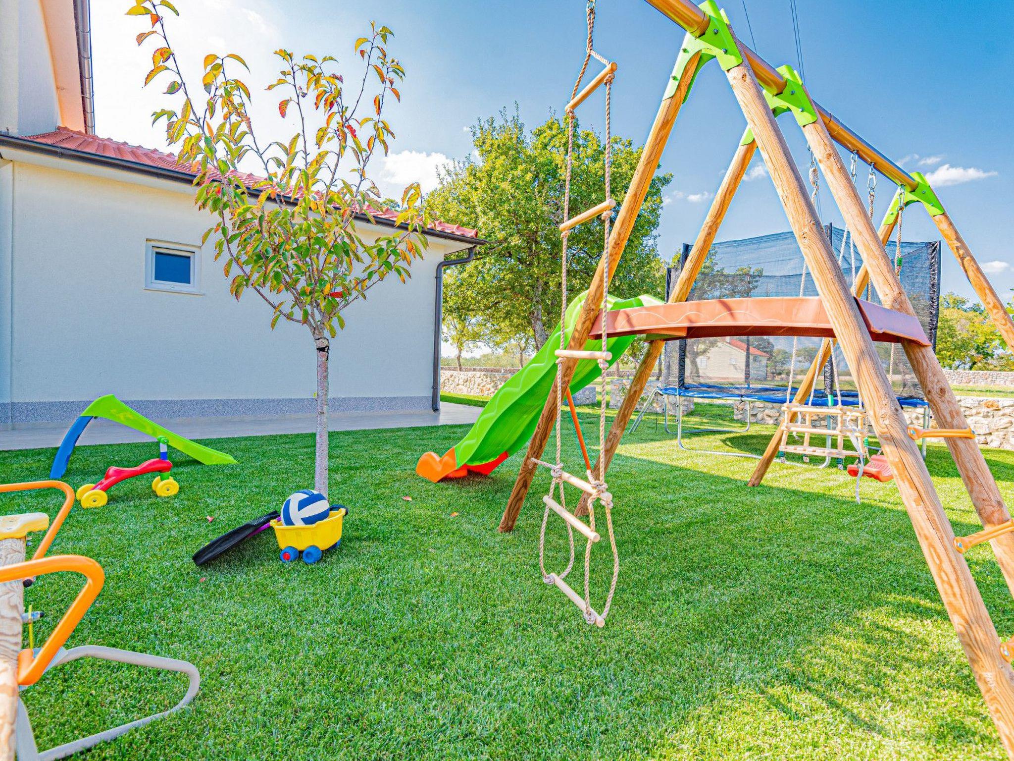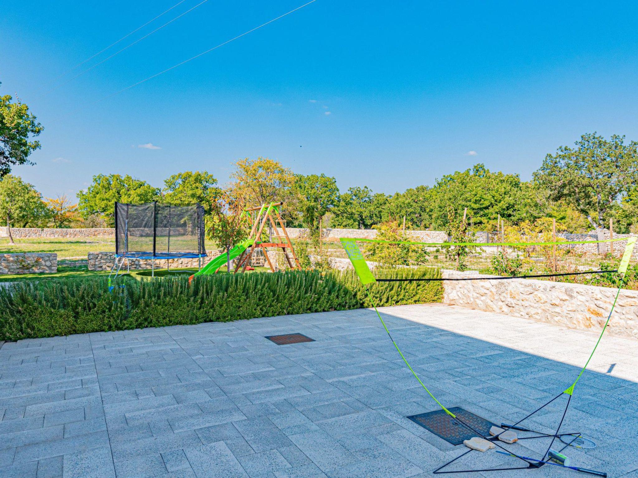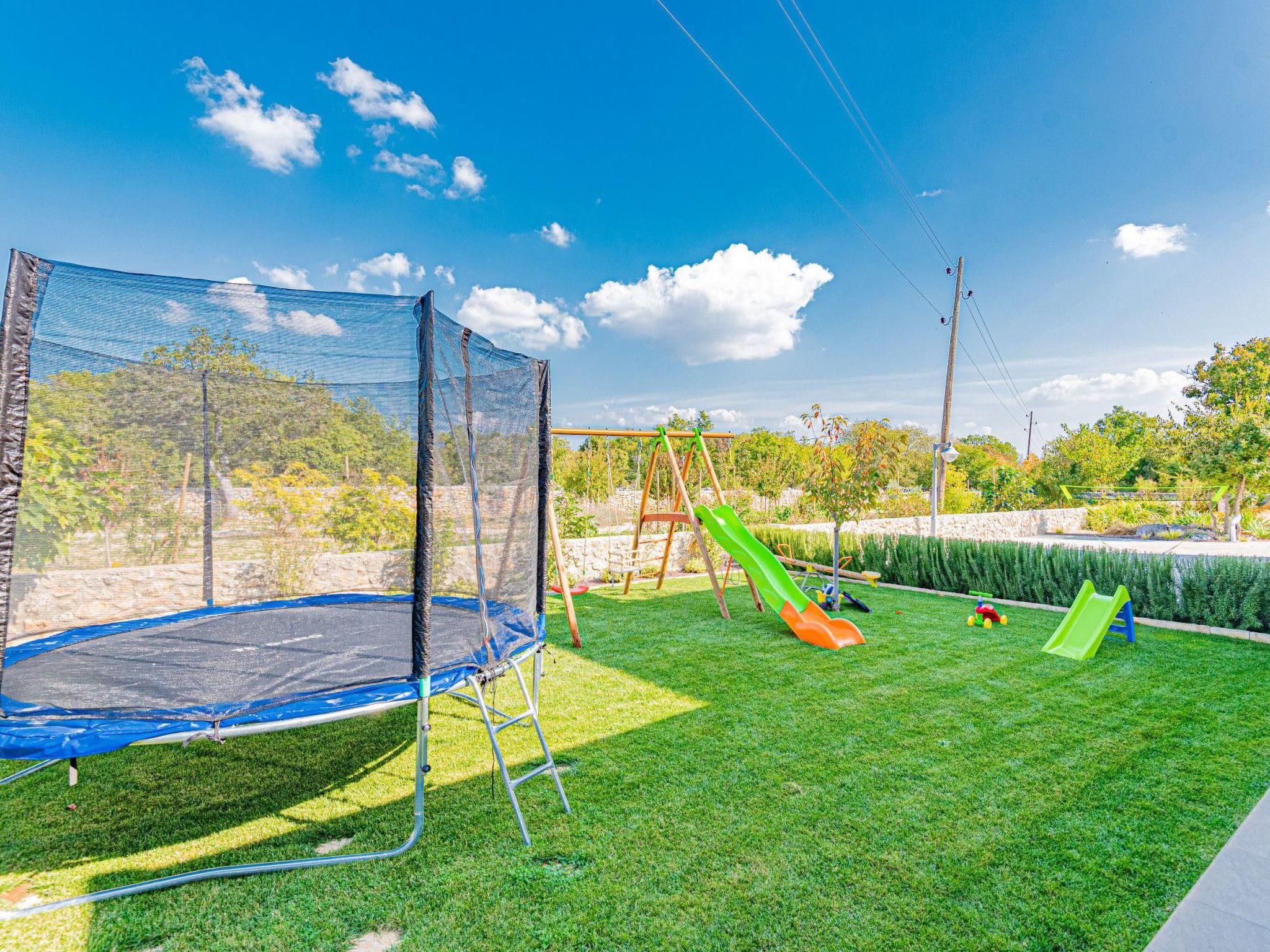 A very large yard is fully fenced and it is surrounded by nature and Mediterranean plants. There is a private pool in the yard, accompanied by sun loungers. There is also an outdoor dining area, right next to BBQ. Kids will love the outdoors because of the playground and a lot of open space for various activities.