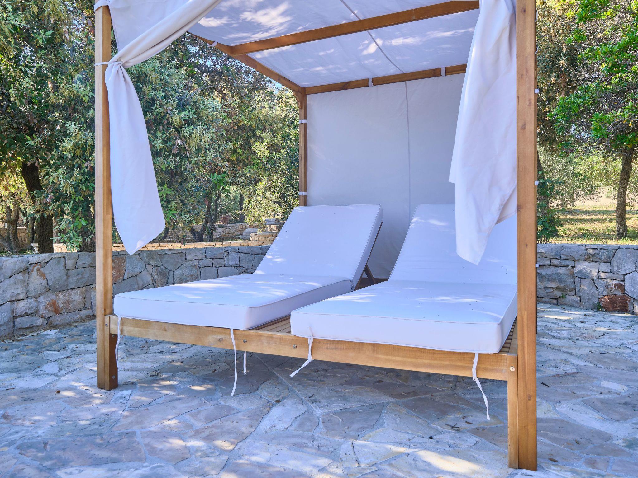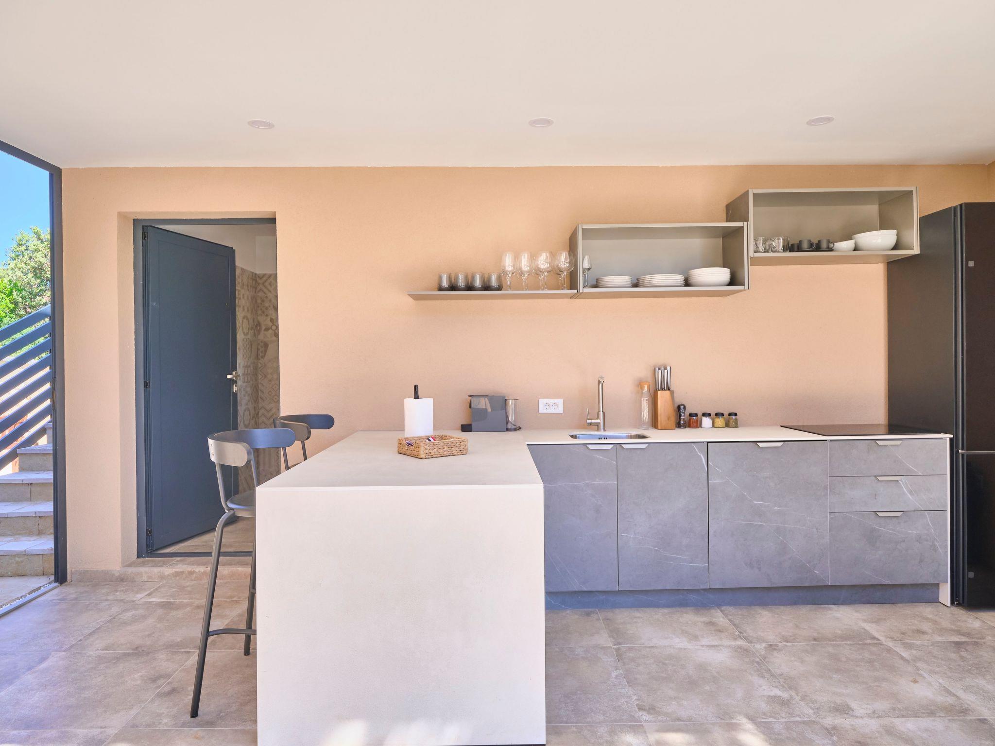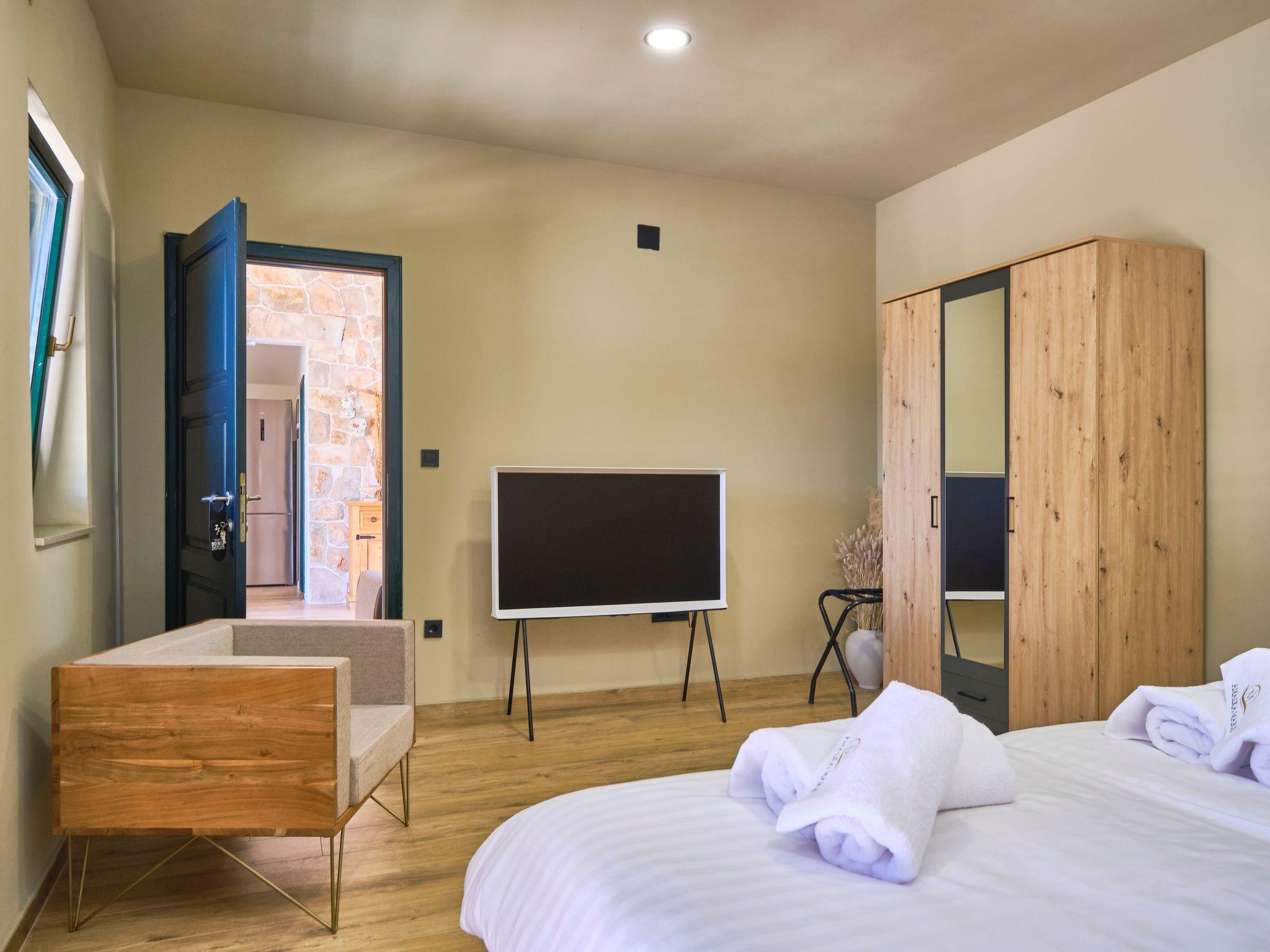 Four houses have one bedroom each and the fifth house has two bedrooms, all of which are king beds. Two of the houses come with two full bathrooms each, while the other two have one full bathroom each. Every bathroom is equipped with a hair dryer, bathrobe, towels, and slippers. Two of the houses have private, fully equipped kitchens, and the other two share a summer kitchen. Additionally, one house includes a covered outdoor gym.. All of the houses have free wifi, air conditioning, free and private parking spots, and the possibility of grocery delivery.