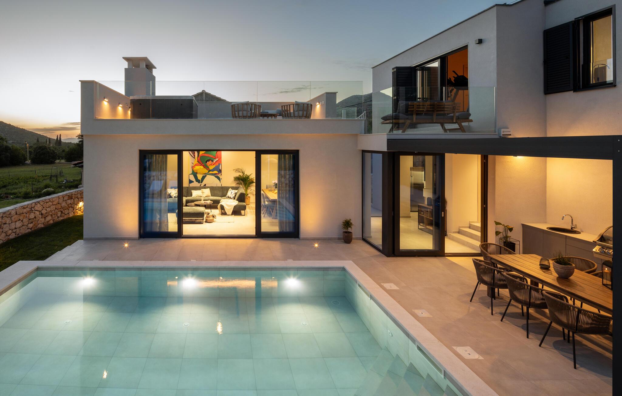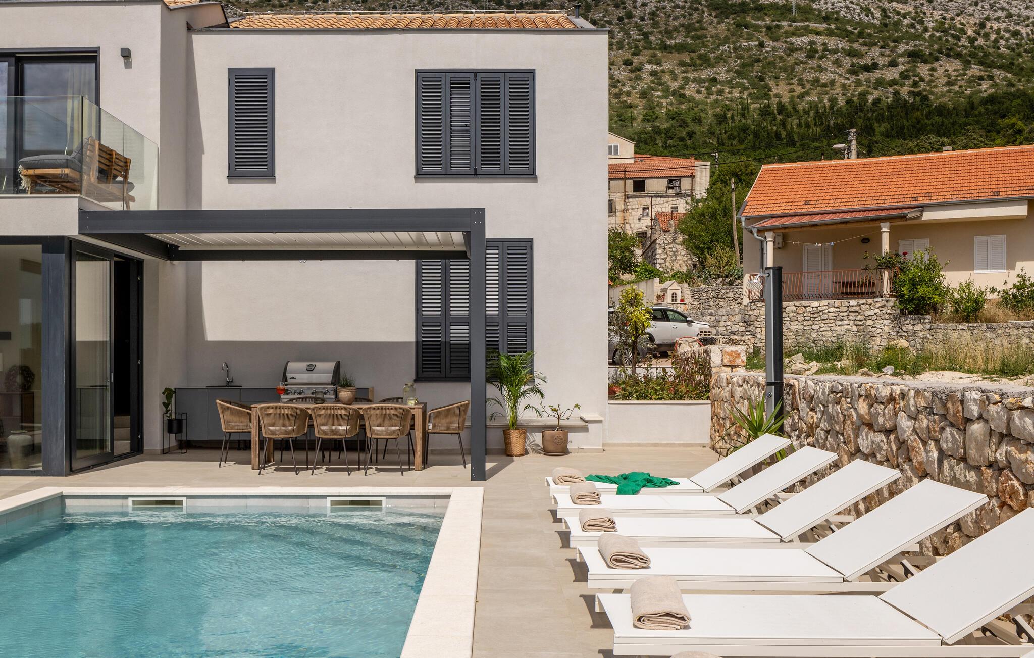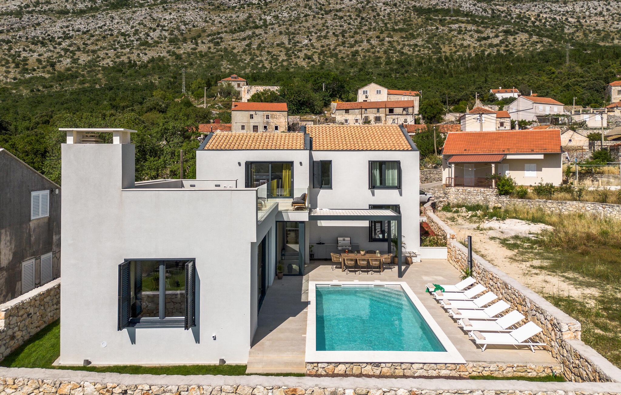Tilbring ferien i denne luksuriøse villa nær Slano og nyd den betagende panoramaudsigt fra den rummelige terrasse med pool. Indenfor kan I forvente en lys, stilfuld atmosfære med højkvalitets designelementer og kærlig dekoration. Aktivitetsrummet med billard, bordtennis og musikinstrumenter sørger for underholdning, mens saunaen og spabadet på tagterrassen byder på ren afslapning. Her møder luksus komfort, og I kan nyde jeres tid ud i fulde drag - uanset om I solbader eller slapper af med udsigt over det omkringliggende landskab.