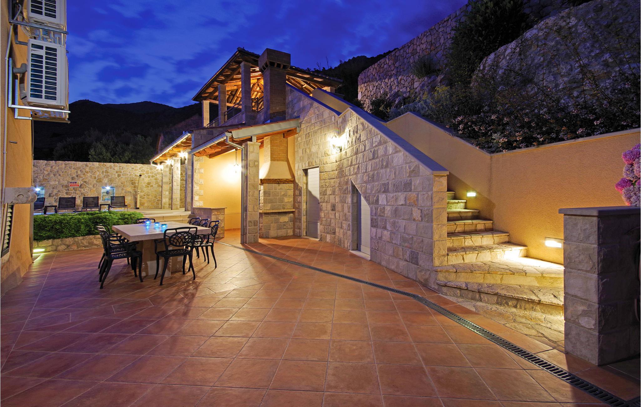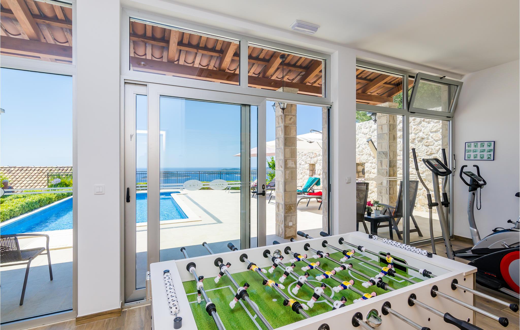 Dette meget specielle komfortable dalmatiske feriedomicil fordeler sig på to huse, der ligger på en bakke med skøn udsigt over havet og øerne der ligger som perler på snor. De rolige omgivelser sikrer en høj grad af privatsfære. Huset er indrettet med moderne møbler og omgivet af en dejlig have med en skøn udendørs pool samt legeplads med gynge, vipper og sandkasse, hvor jeres børn kan få lang tid til at gå i den friske luft. Desuden rummer huset også et både sauna og fitnessrum, som kan sørge for I holder kroppen i form også i ferien. I kan også more jer med et pot billard og en bordtenniskamp. I husets stueplan er der en stor stue, ideel til at slappe af i, mens soveværelserne ligger på første sal. I det øverste hus ligger køkkenet med spiseafdeling, i stueplan. Her er der god plads til at 12 personer kan sidde og spise, eller blot være sammen. På den øverste etage er der soveværelser og et galleri med arbejdshjørne. Ejer kan hjælpe jer med at leje bil og/eller båd, så I kan udforske Dubrovnik og de mange interessante småøer. Huset er helt ideelt til to familier med børn, da alle soveværelser har badeværelse en suite. Brsecine er en helt autentisk dalmatisk by, i nærheden af Dubrovnik med megen kultur og underholdning. Den dejlige kiesstrand ligger blot 5 minutter væk i bil.