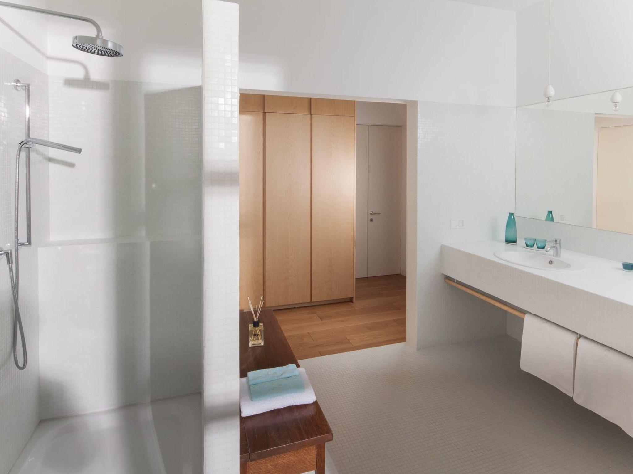 The bedrooms have a mirror layout, and both feature beautifully restored 19th century ceiling paintings with floral motifs and lush views of the Villa’s gardens. Their incredibly spacious bathrooms with double lavatories, one with a bath, and the other with a walk-in shower, sport a minimalist style and a white theme. With everything unnecessary excluded, these rooms resonate a relaxed atmosphere.
