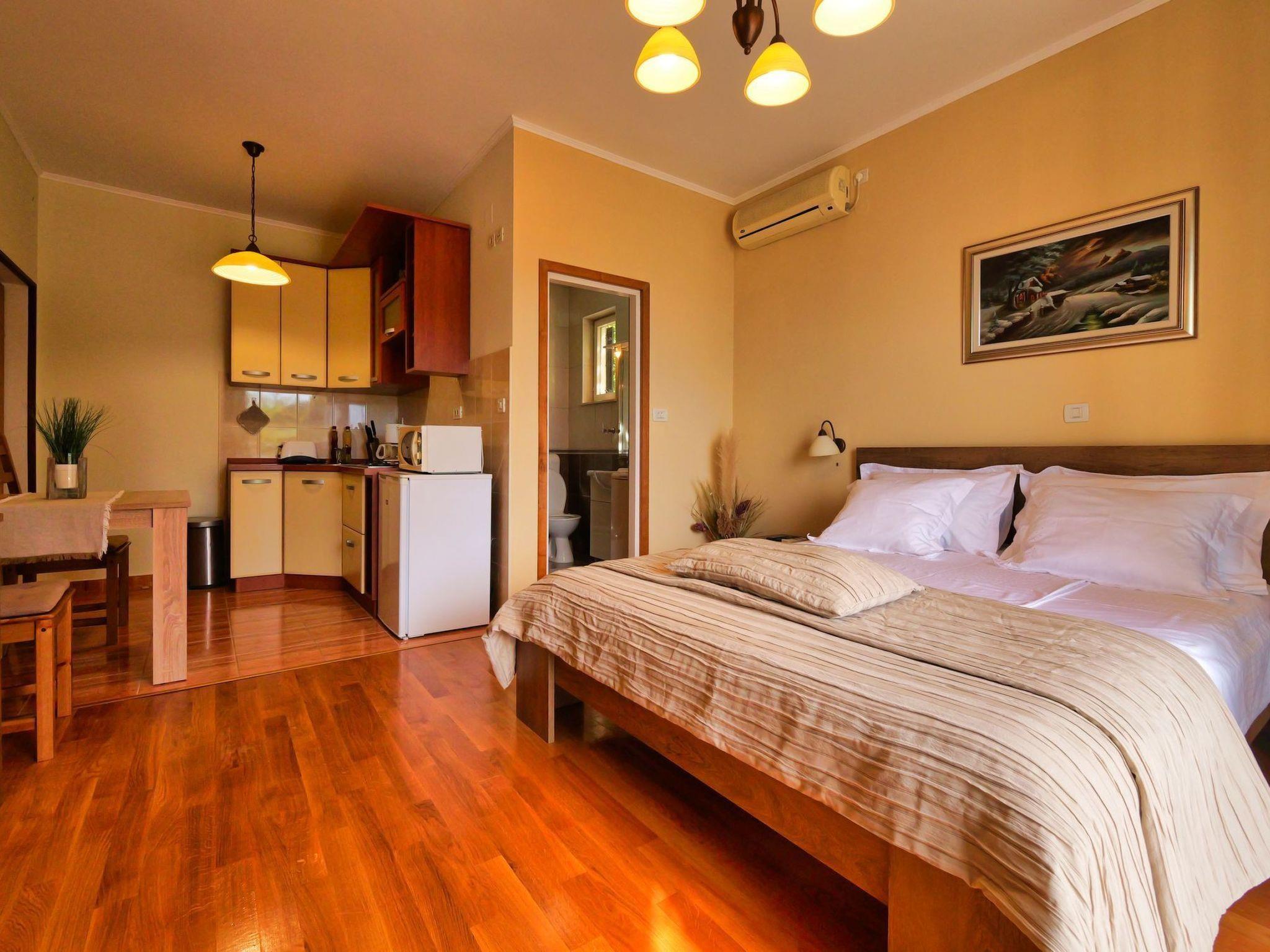 Our studio apartment caters comfortably to 2 + 1 guests, presenting a thoughtfully furnished space that seamlessly combines the bedroom and dining area with a fully equipped kitchen, ensuring all the comforts of home are at your fingertips. The attention to detail extends into the private bathroom, providing a restful and self-contained living space. Beyond the essentials, the apartment enjoys the modern conveniences of air conditioning, satellite TV, and Wi-Fi connectivity, promising a stay that's as relaxing as it is connected.