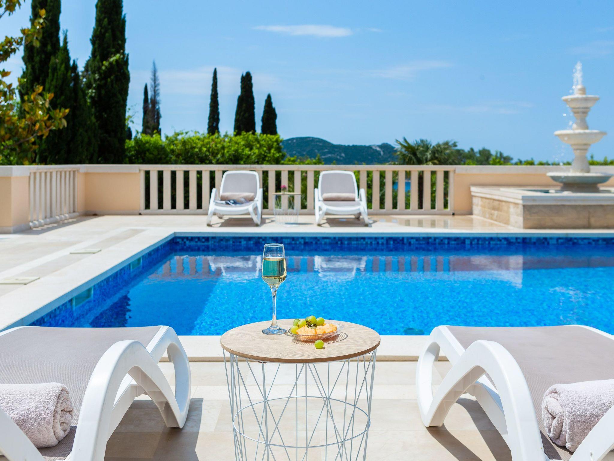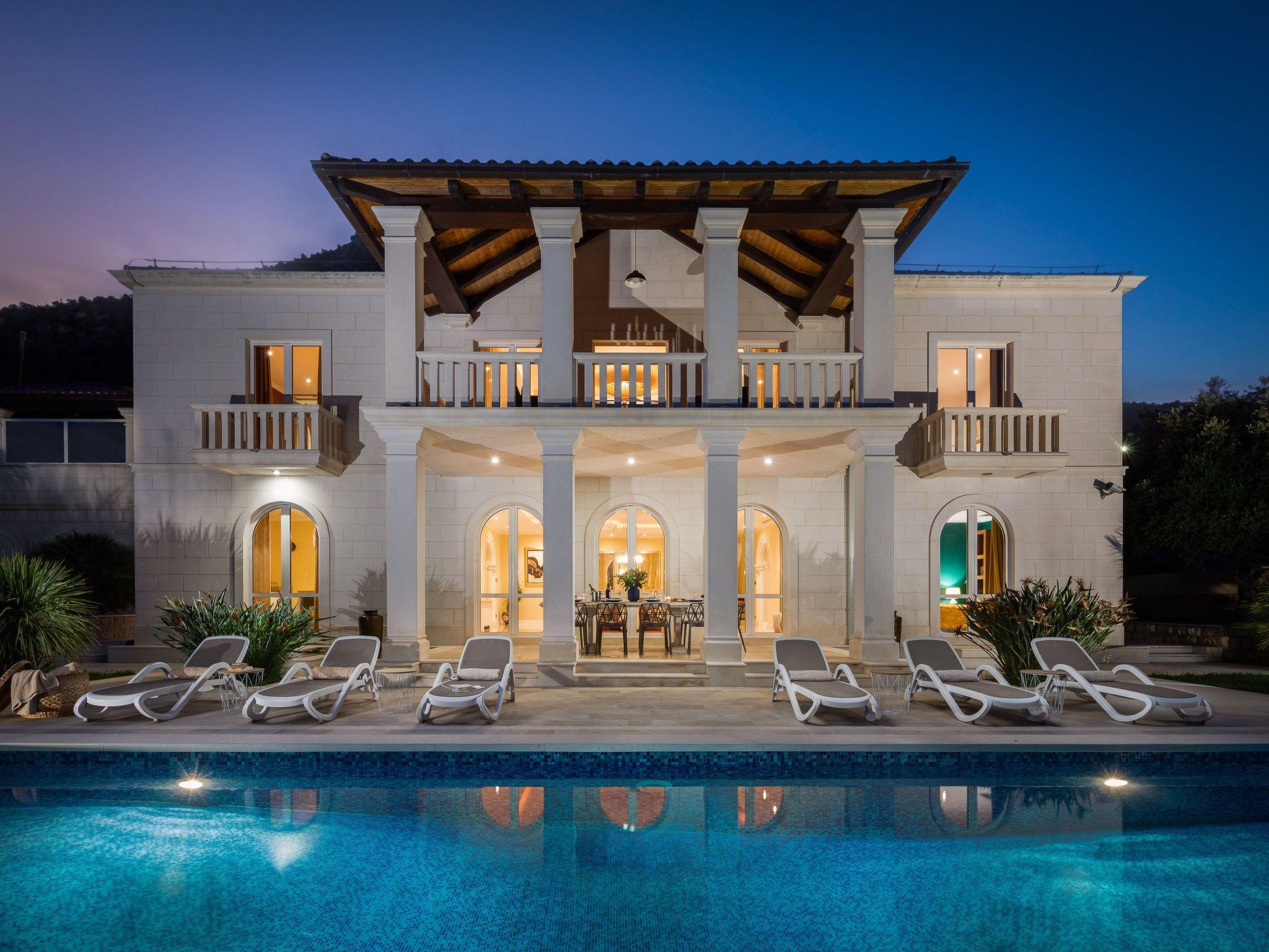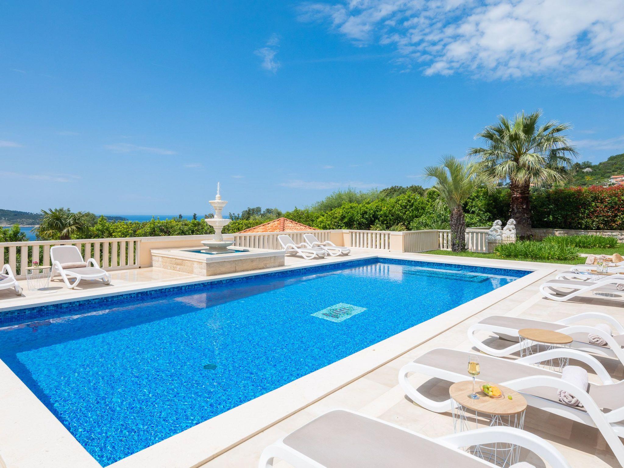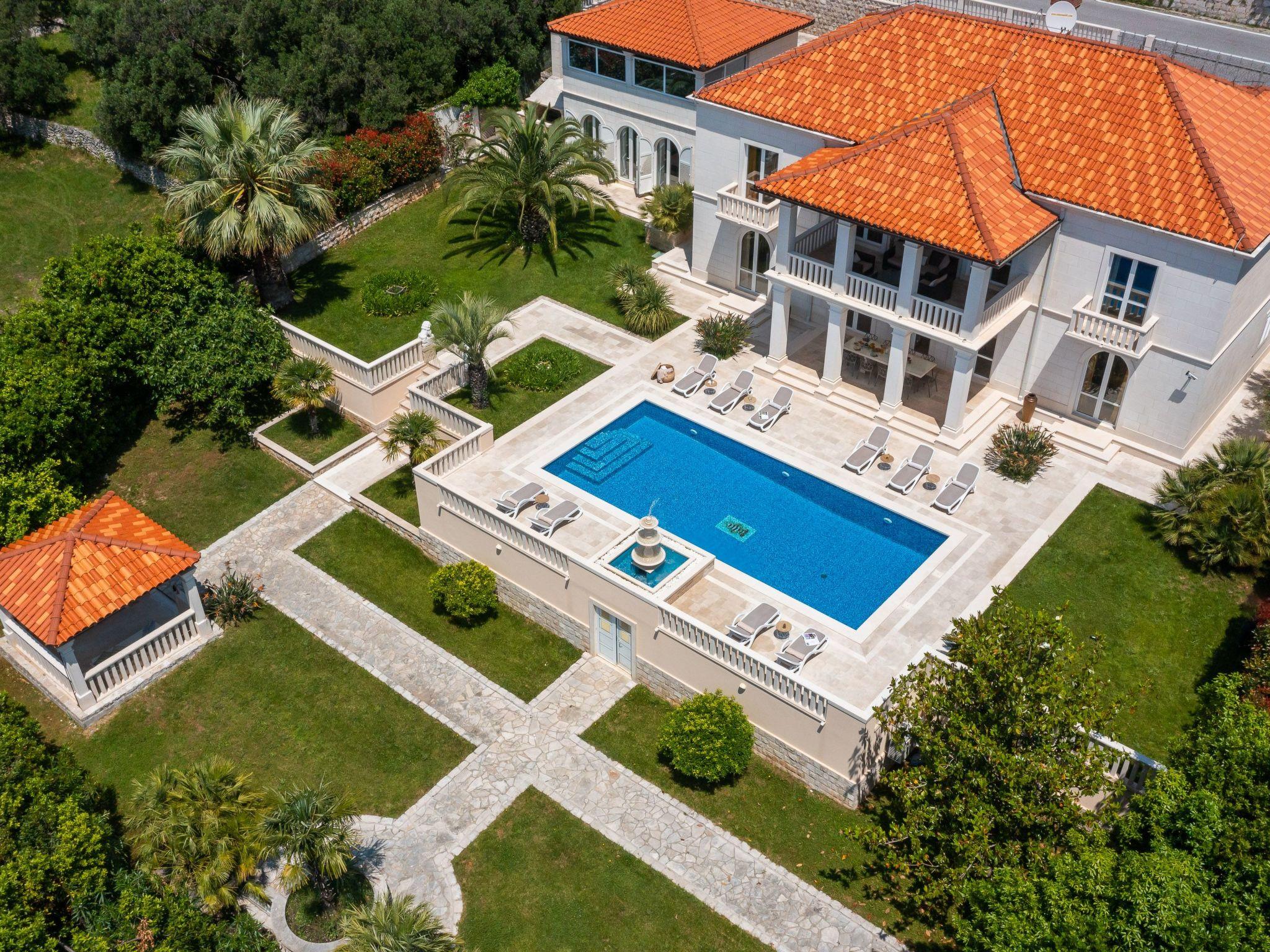 La Villa Dubrovnik offers breathtaking sea views, as well as a range of amenities to ensure complete relaxation and tranquility. Lounge by the large, heated private pool or enjoy the beautiful gardens, featuring a barbecue, fountain, and outdoor shower. The villa can accommodate up to 12 guests in 6 double rooms including 5 bathrooms. Five double rooms are in the main villa and one in the side annex. In the ground floor you can find three modern luxury rooms. One bedroom has an en suite bathroom with shower, while the other two share a bathroom with a tub. On the upper floor you can find two master bedrooms with a king size bed, a private bath with tub and shower, a walk-in wardrobe and a small balcony. To the side of the house, the villa annex holds the sixth accommodation unit including a bedroom with two twin beds which can be converted to a double and a bathroom. Our fully equipped kitchen is perfect for preparing gourmet meals. The villa also boasts high-speed Wi-Fi and a large flat-screen TV, ensuring you stay connected and entertained during your stay.