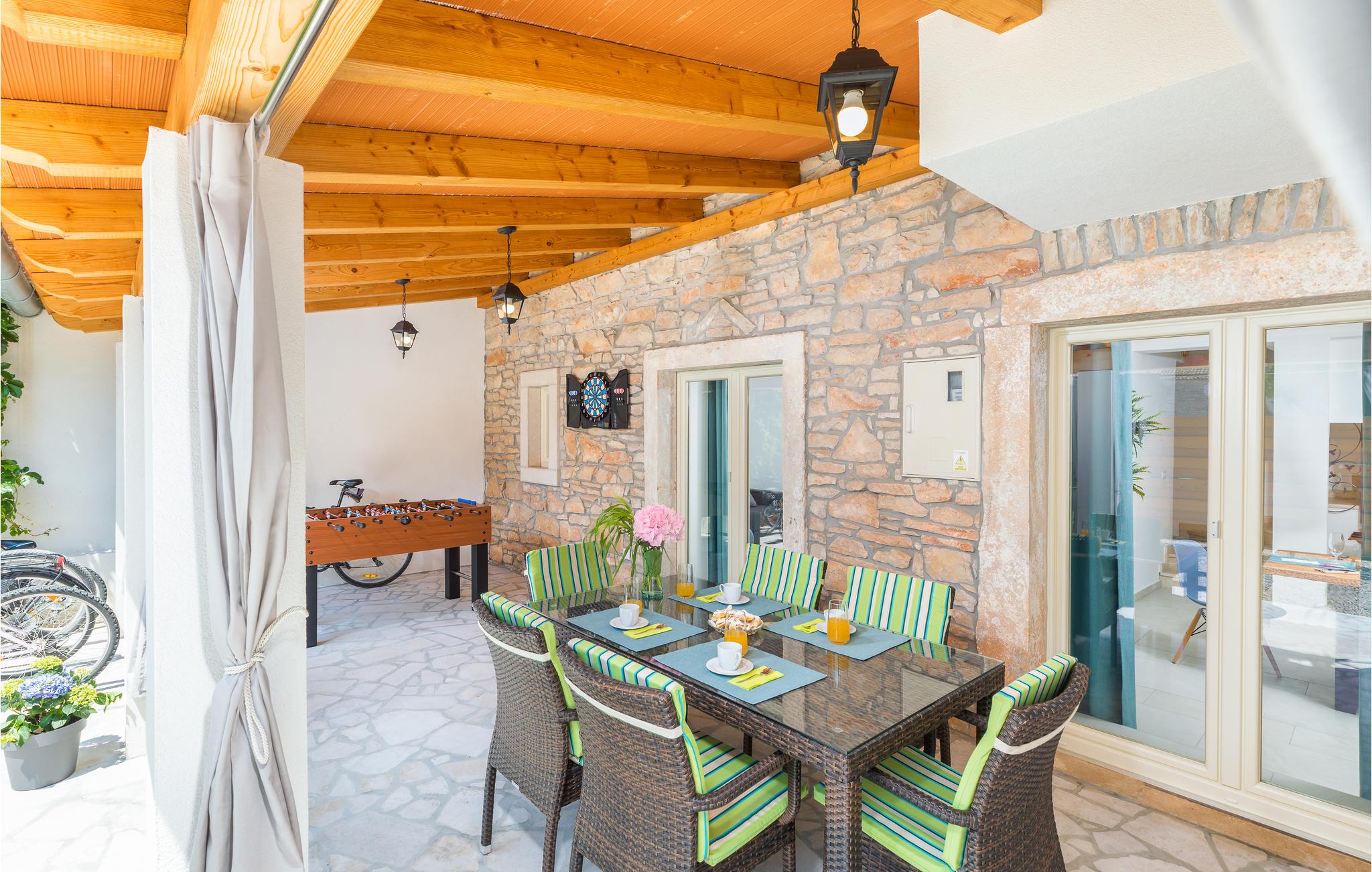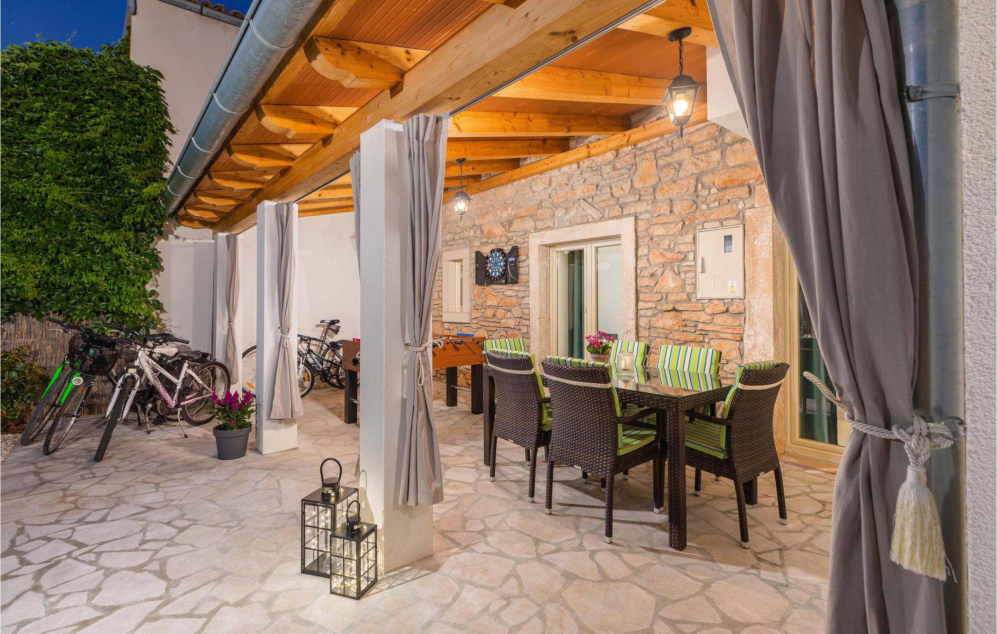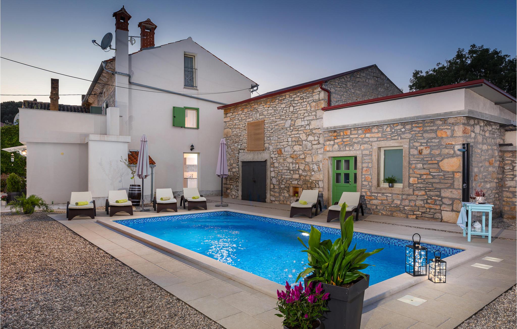 Hold jeres velfortjente ferie i den lille by Jovici i dette skønne feriehus med pool. Dette indbydende indrettede indre består af to soveværelser med egne badeværelser på øverste etage, mens stuerne ligger i stueplan. Herfra er der dør ud til den overdækkede terrasse med grill, som sikkert vil blive der, hvor I opholder jer mest. Det er skønt at hoppe i poolen når det er rigtigt varmt. I den indhegnede have er der legeplads hvor børnene kan få mange timer til at gå. Der er skønne strande i byen Peruski, desuden ligger den populære turistby Duga Uvala kun få minutter væk i bil. Aktive feriegæster bør benytte den korte afstand til adrenalinparken Glavani hvor der venter flere underholdende forlystelser, ligesom I kan tage på rideture på Ranch Barba Tone eller køre quad MC i Draguzeti.