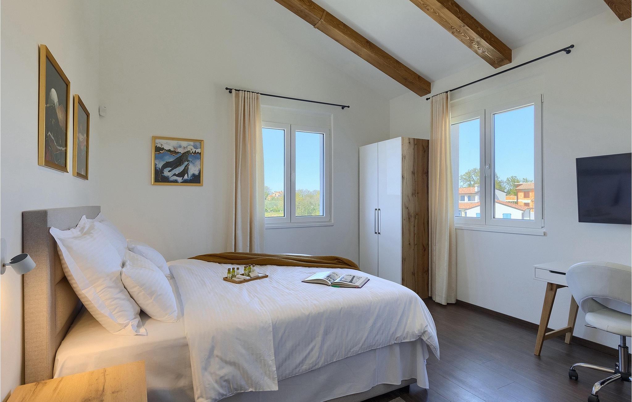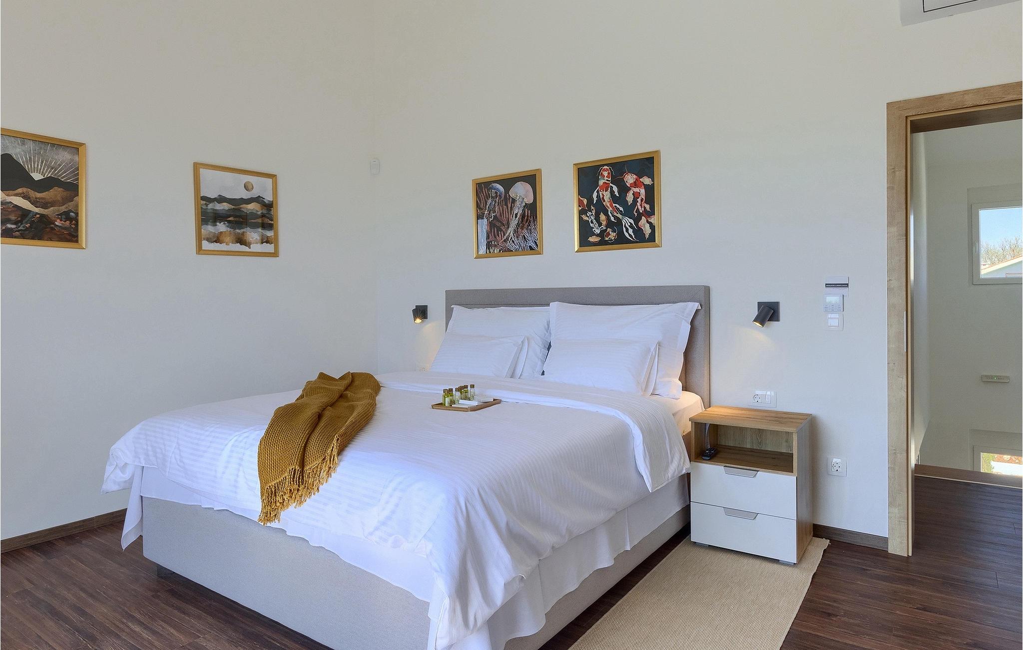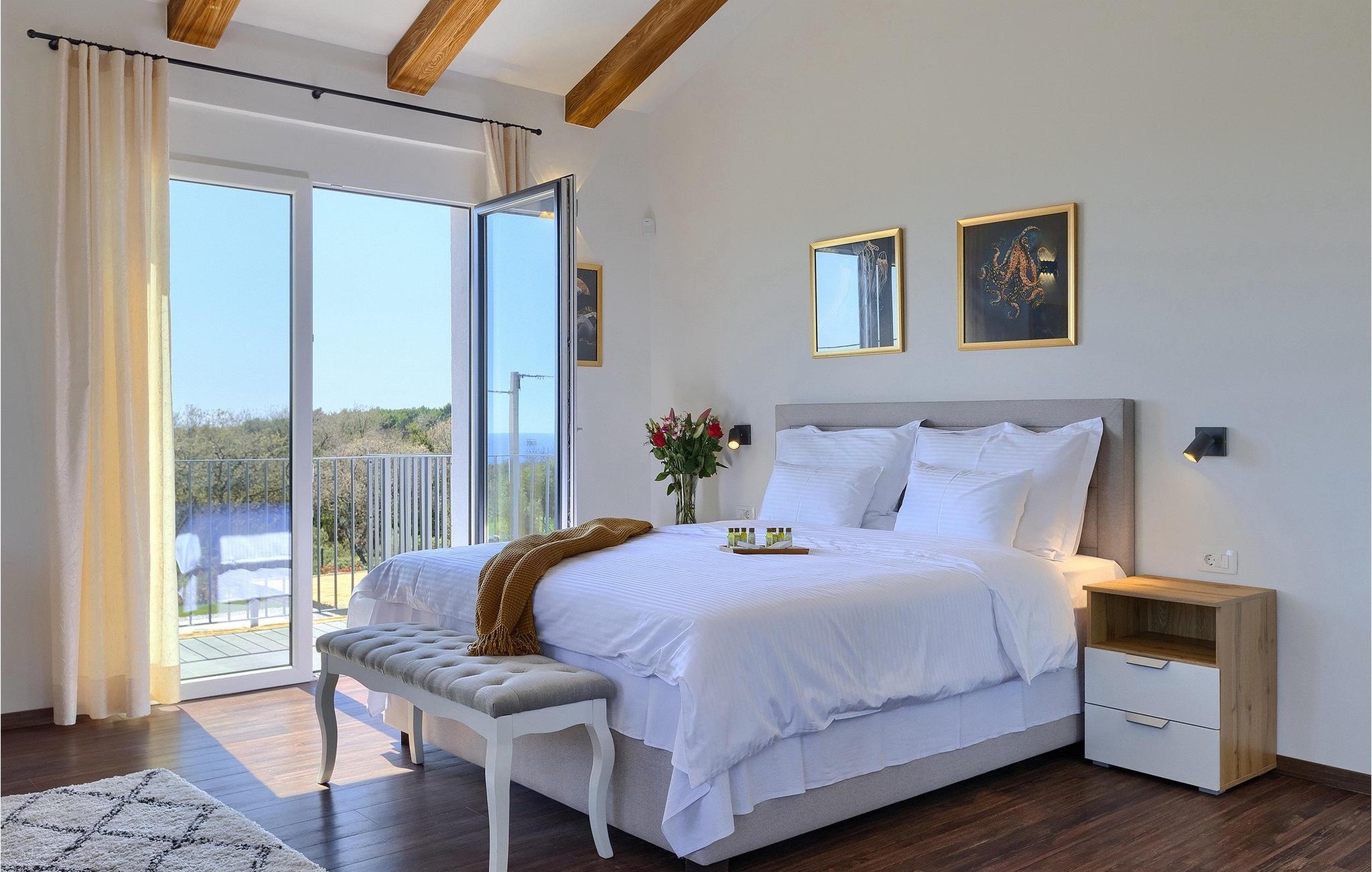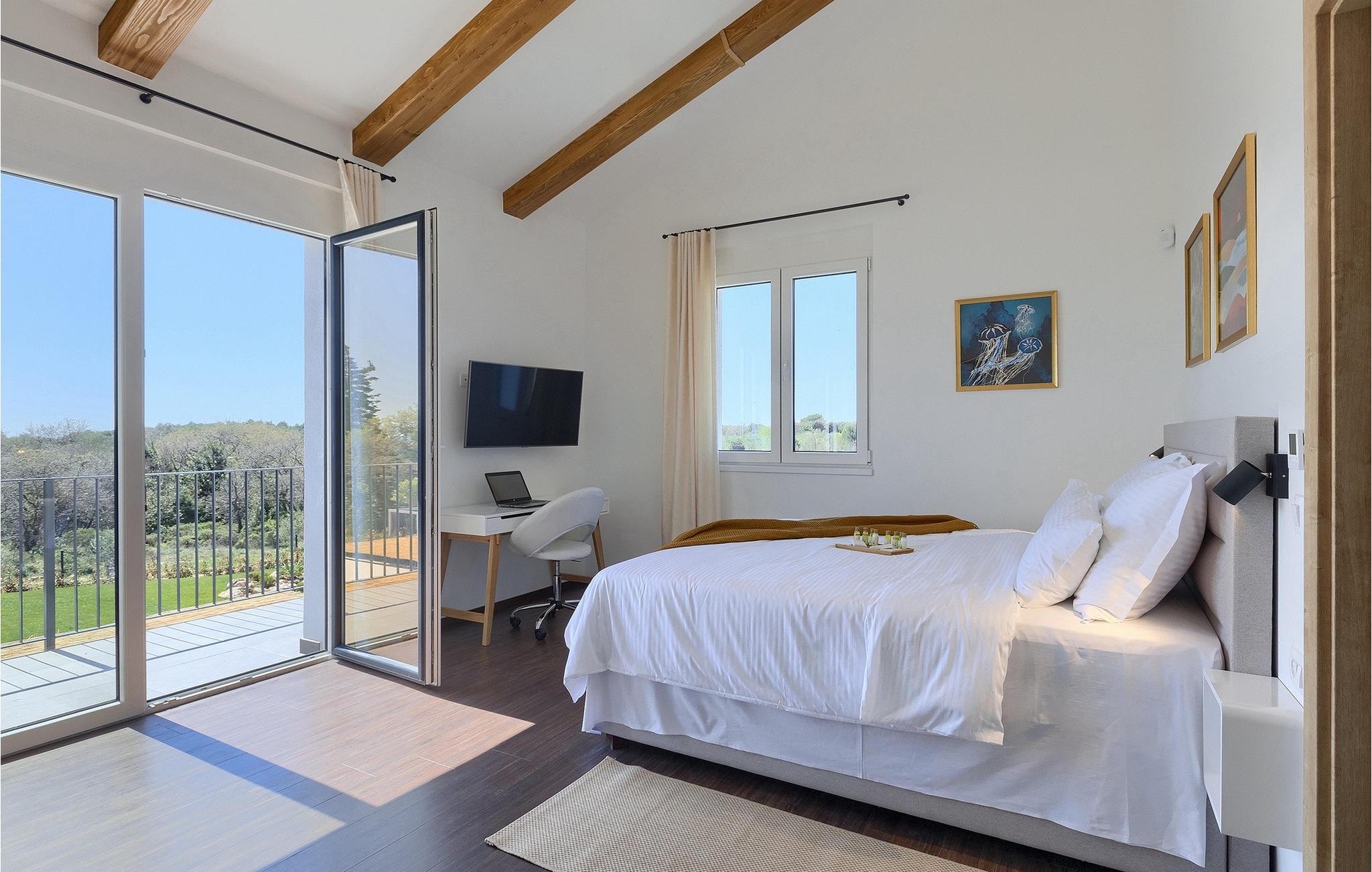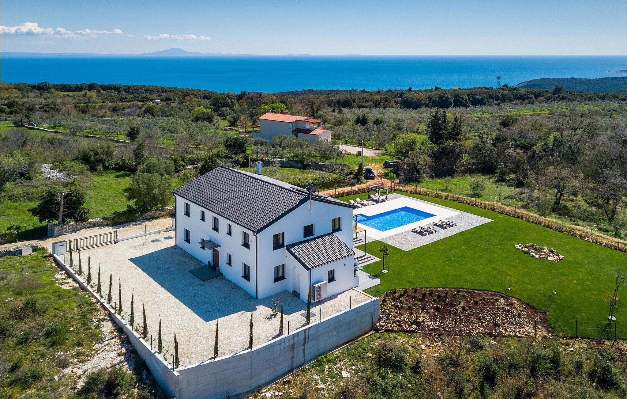 I stueetagen af den fuldt klimatiserede villa finder du den rummelige opholdsstue, det fuldt udstyrede køkken, et stort spisebord til 10 personer, et separat toilet og et af de komfortable soveværelser med eget badeværelse. På det øverste niveau er der 4 mere komfortable soveværelser med deres egne moderne badeværelser. Fra den fælles balkon kan du nyde en vidunderlig udsigt over havet! Forkæl dig selv med en helt speciel ferie langt væk fra hverdagen. Glem alle dine bekymringer og nyd bare tiden i den smukke Villa Dolce Bacio med familie og venner!Den drømmeagtige Villa Dolce Bacio ligger i den lille landsby Kavran, på en lille bakke kun 18 km nord for Medulin. Langt væk fra turistforvirringen kan du nyde absolut ro her. Østkystens hav ligger kun 2 km fra villaen og byder på et flot udvalg af strande, hvor du kan nyde det krystalklare Adriaterhav. Drømmende bugter med klippekyster findes her samt børnevenlige strande. Turiststederne Medulin og Pula kan hurtigt nås med bil og tilbyder en bred vifte af aktiviteter - fra sport til kultur, gastronomi til eventyr ... Der er noget for enhver smag! Særligt anbefalet er den berømte arena i Pula eller de smukke strande, der strækker sig så langt som til Medulin. Planlæg en rideudflugt, en sejltur til Brijuni-øerne eller nyd lokale specialiteter såsom olivenolie og trøfler med udsigt over havnen i Pula og Adriaterhavet.