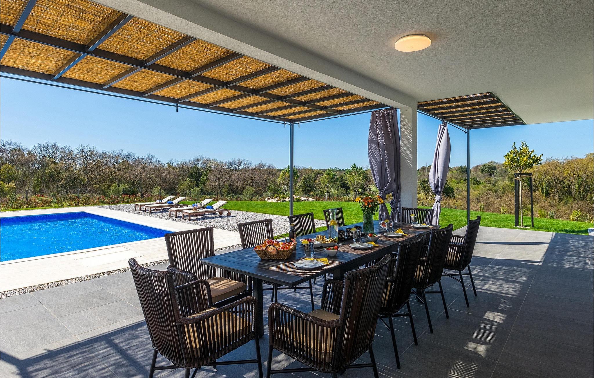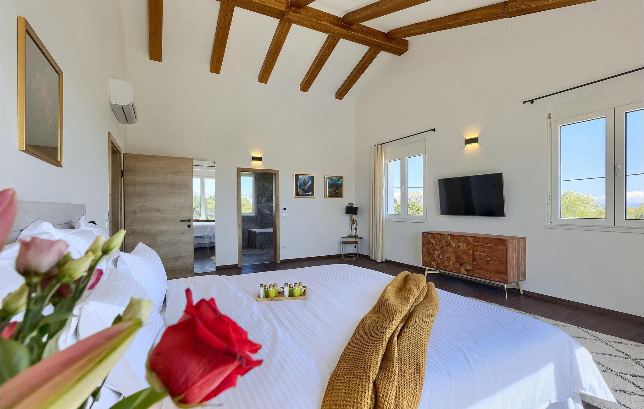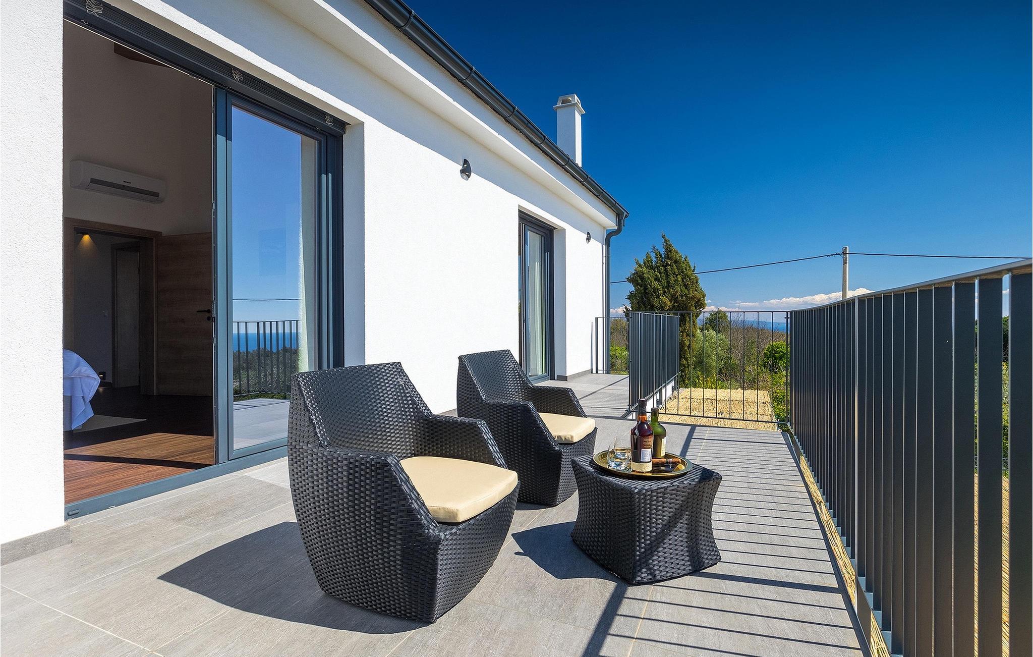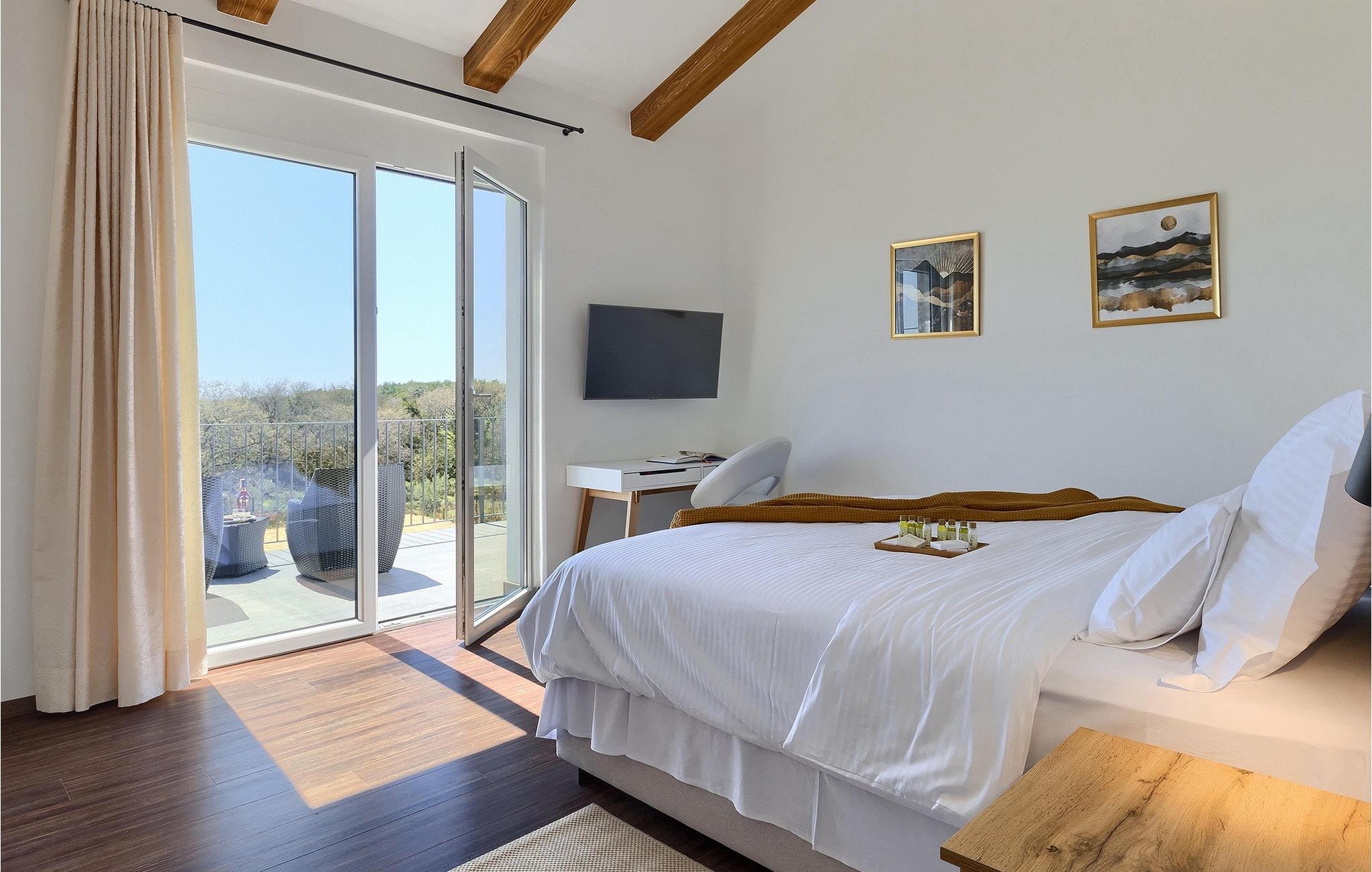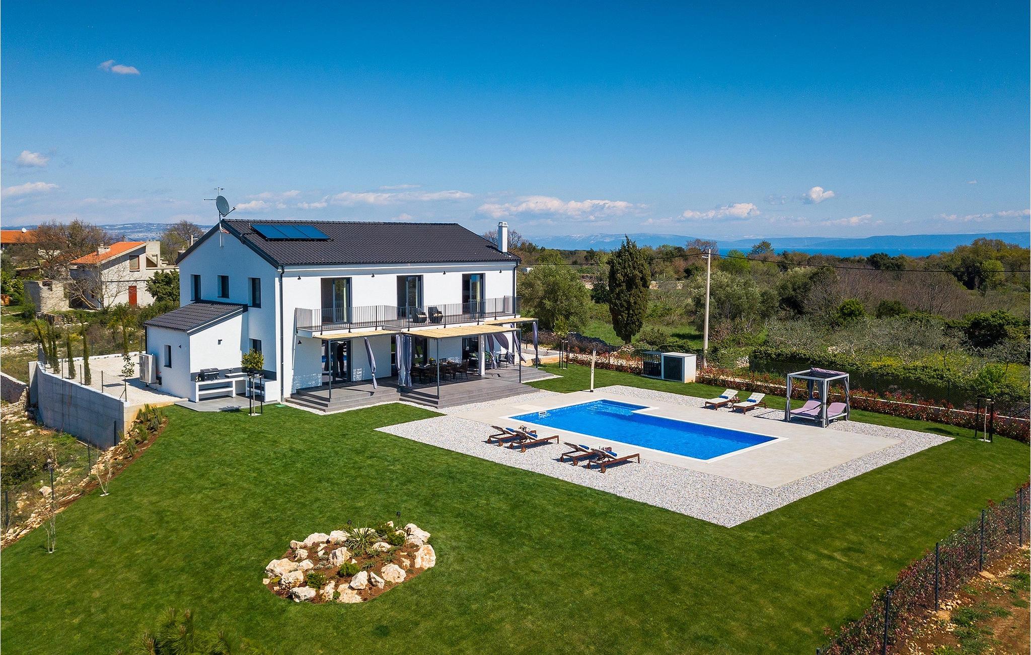 I stueetagen af den fuldt klimatiserede villa finder du den rummelige opholdsstue, det fuldt udstyrede køkken, et stort spisebord til 10 personer, et separat toilet og et af de komfortable soveværelser med eget badeværelse. På det øverste niveau er der 4 mere komfortable soveværelser med deres egne moderne badeværelser. Fra den fælles balkon kan du nyde en vidunderlig udsigt over havet! Forkæl dig selv med en helt speciel ferie langt væk fra hverdagen. Glem alle dine bekymringer og nyd bare tiden i den smukke Villa Dolce Bacio med familie og venner!Den drømmeagtige Villa Dolce Bacio ligger i den lille landsby Kavran, på en lille bakke kun 18 km nord for Medulin. Langt væk fra turistforvirringen kan du nyde absolut ro her. Østkystens hav ligger kun 2 km fra villaen og byder på et flot udvalg af strande, hvor du kan nyde det krystalklare Adriaterhav. Drømmende bugter med klippekyster findes her samt børnevenlige strande. Turiststederne Medulin og Pula kan hurtigt nås med bil og tilbyder en bred vifte af aktiviteter - fra sport til kultur, gastronomi til eventyr ... Der er noget for enhver smag! Særligt anbefalet er den berømte arena i Pula eller de smukke strande, der strækker sig så langt som til Medulin. Planlæg en rideudflugt, en sejltur til Brijuni-øerne eller nyd lokale specialiteter såsom olivenolie og trøfler med udsigt over havnen i Pula og Adriaterhavet.
