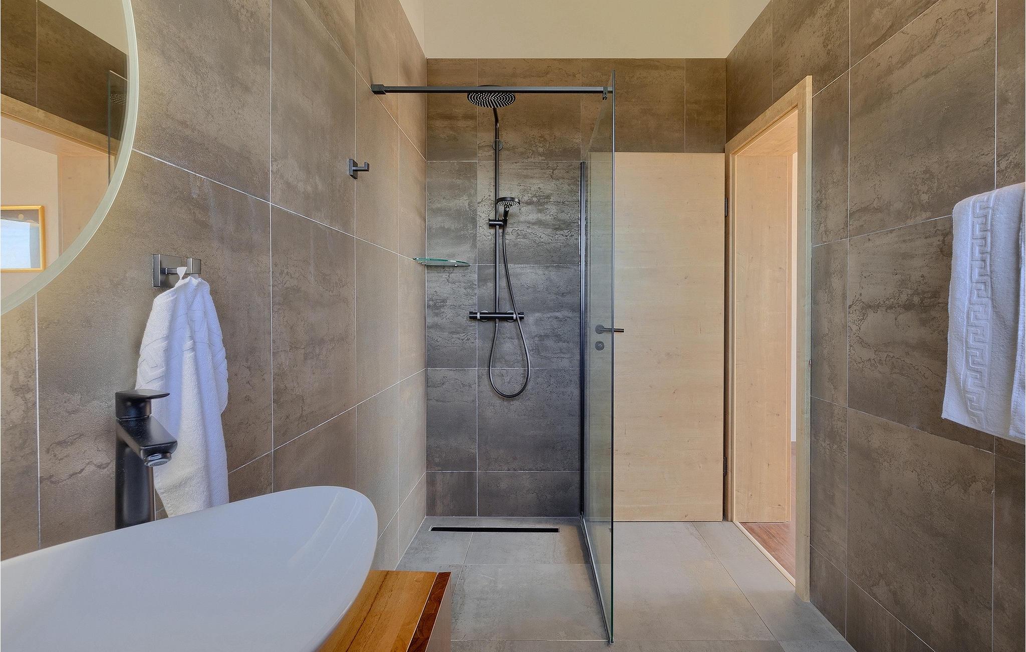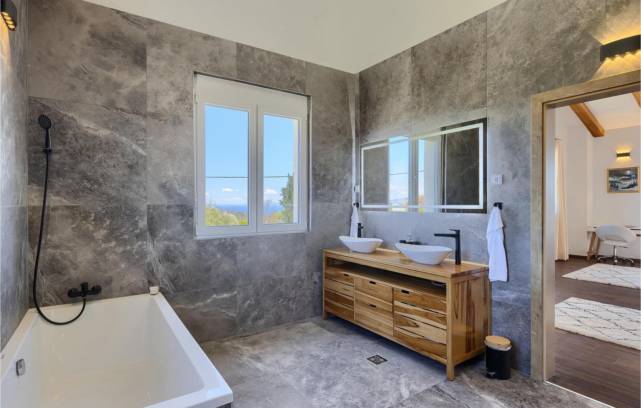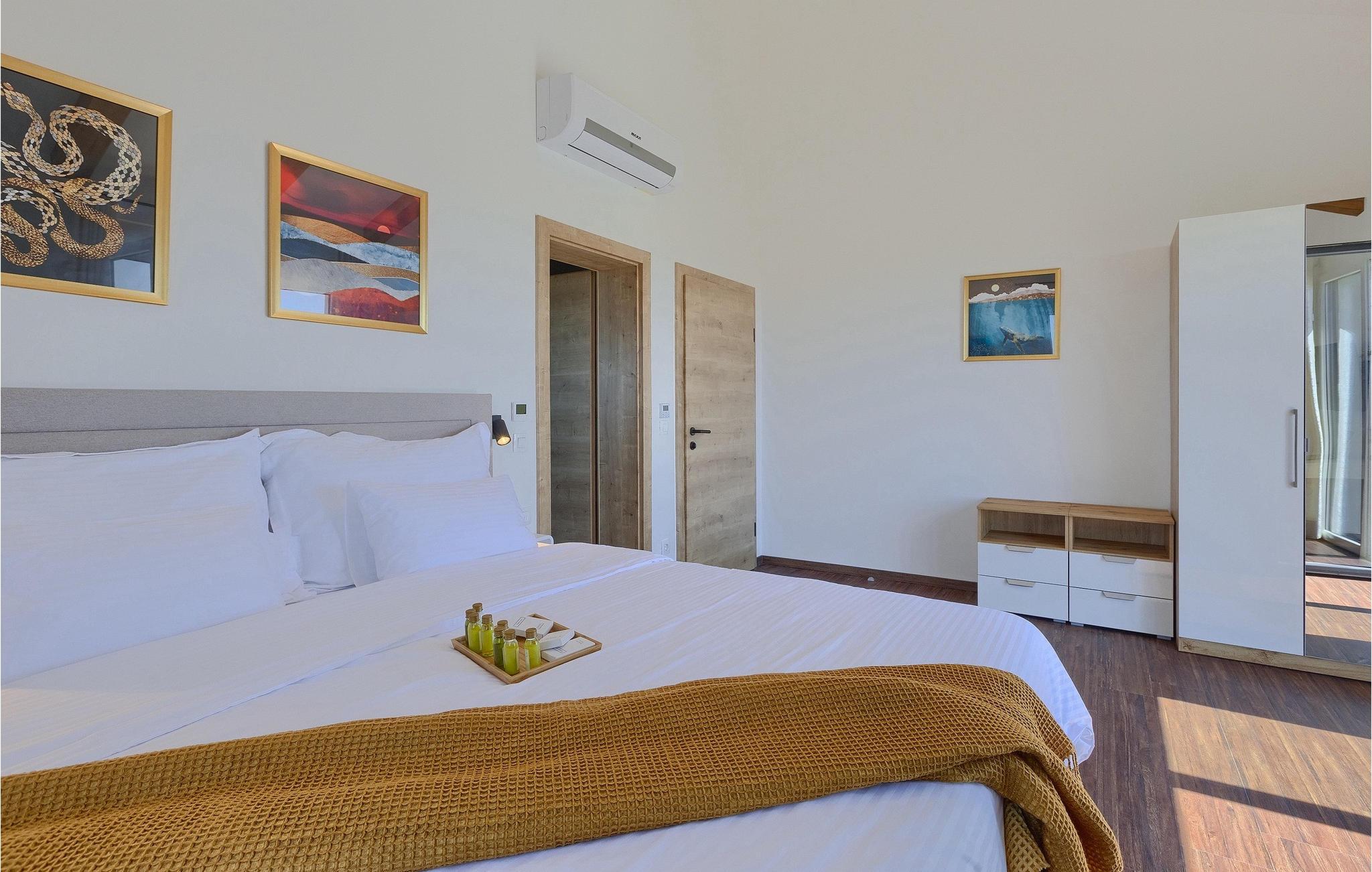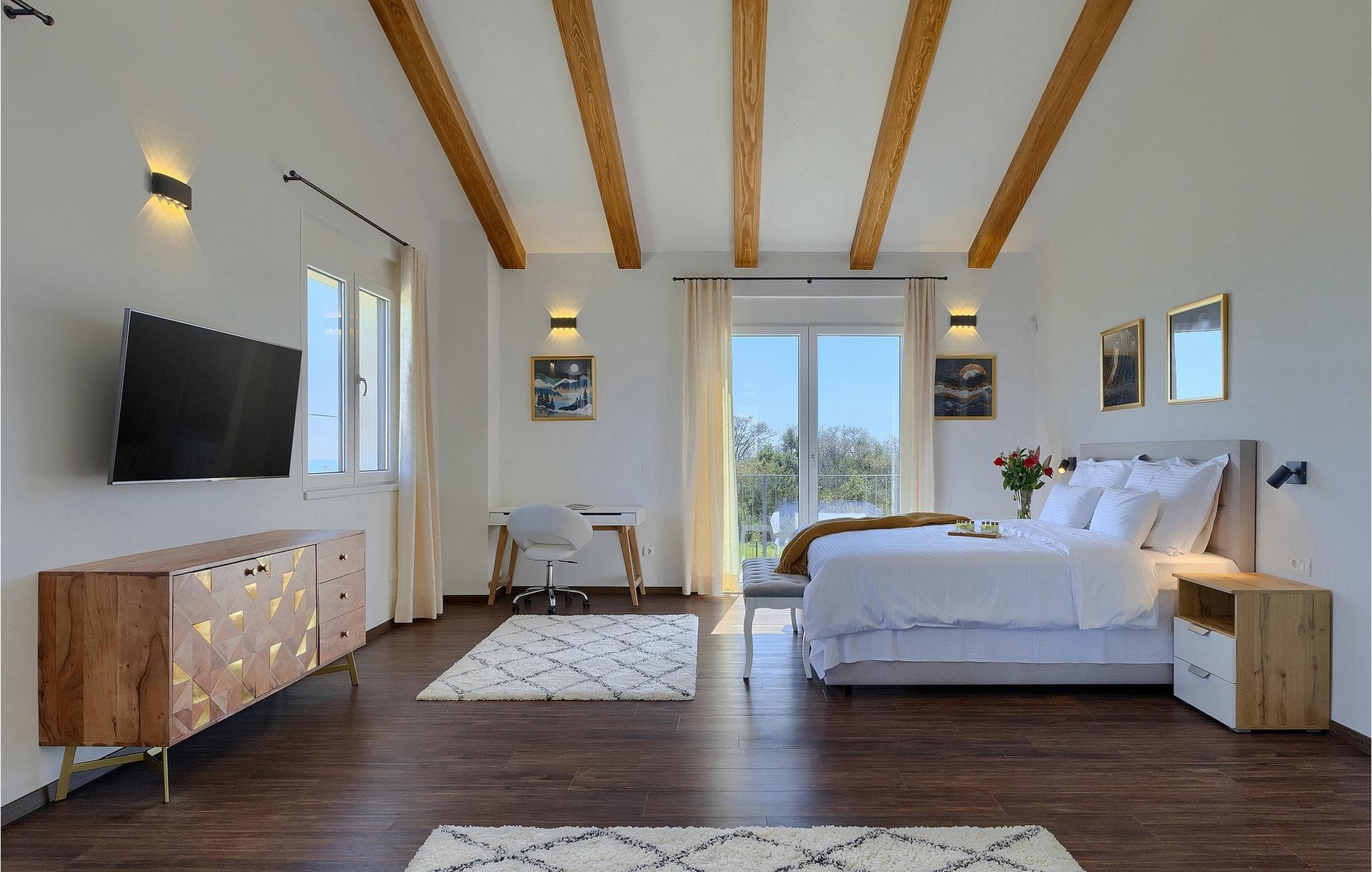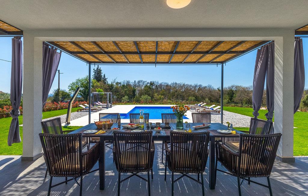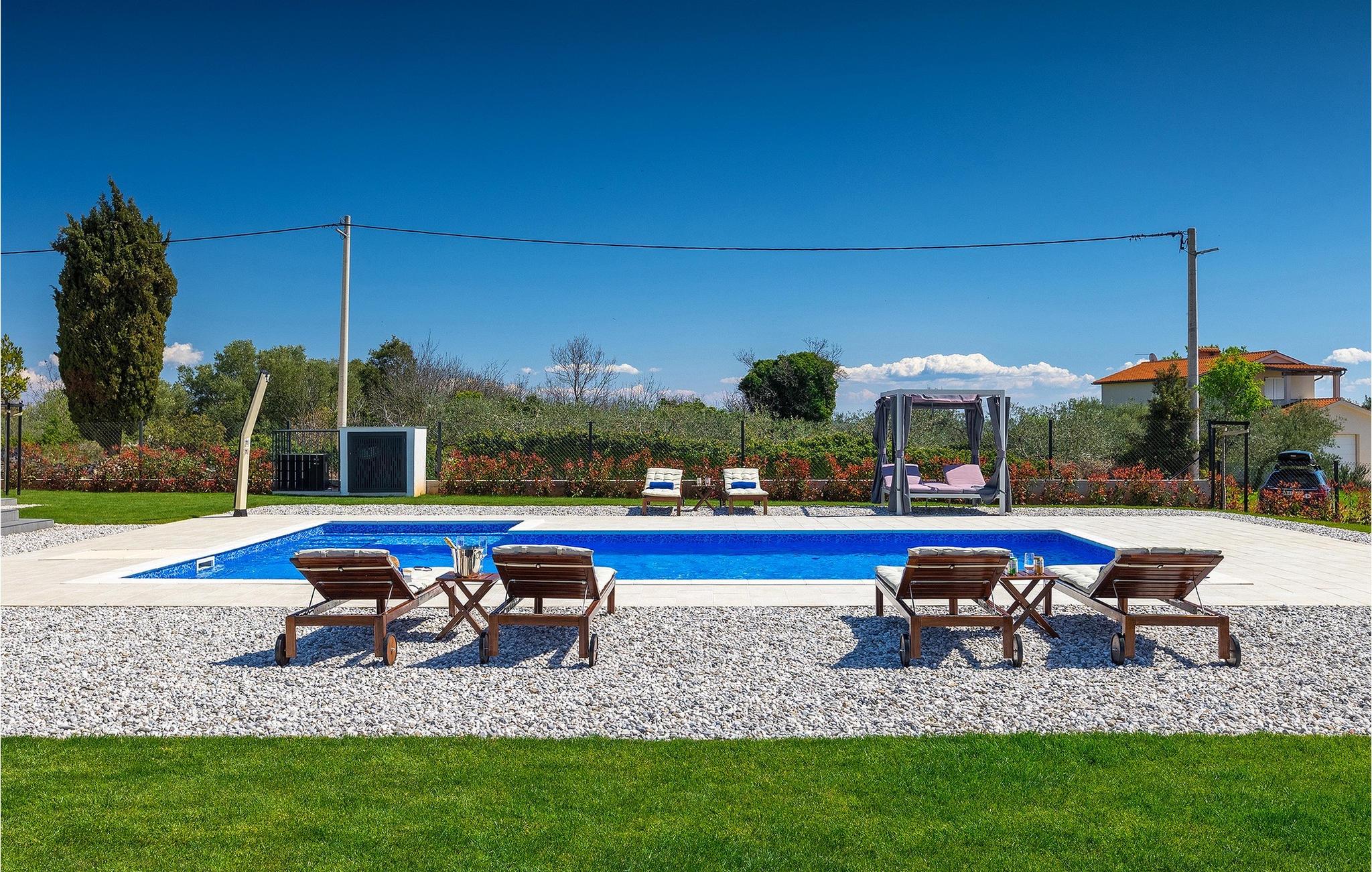 I stueetagen af den fuldt klimatiserede villa finder du den rummelige opholdsstue, det fuldt udstyrede køkken, et stort spisebord til 10 personer, et separat toilet og et af de komfortable soveværelser med eget badeværelse. På det øverste niveau er der 4 mere komfortable soveværelser med deres egne moderne badeværelser. Fra den fælles balkon kan du nyde en vidunderlig udsigt over havet! Forkæl dig selv med en helt speciel ferie langt væk fra hverdagen. Glem alle dine bekymringer og nyd bare tiden i den smukke Villa Dolce Bacio med familie og venner!Den drømmeagtige Villa Dolce Bacio ligger i den lille landsby Kavran, på en lille bakke kun 18 km nord for Medulin. Langt væk fra turistforvirringen kan du nyde absolut ro her. Østkystens hav ligger kun 2 km fra villaen og byder på et flot udvalg af strande, hvor du kan nyde det krystalklare Adriaterhav. Drømmende bugter med klippekyster findes her samt børnevenlige strande. Turiststederne Medulin og Pula kan hurtigt nås med bil og tilbyder en bred vifte af aktiviteter - fra sport til kultur, gastronomi til eventyr ... Der er noget for enhver smag! Særligt anbefalet er den berømte arena i Pula eller de smukke strande, der strækker sig så langt som til Medulin. Planlæg en rideudflugt, en sejltur til Brijuni-øerne eller nyd lokale specialiteter såsom olivenolie og trøfler med udsigt over havnen i Pula og Adriaterhavet.
